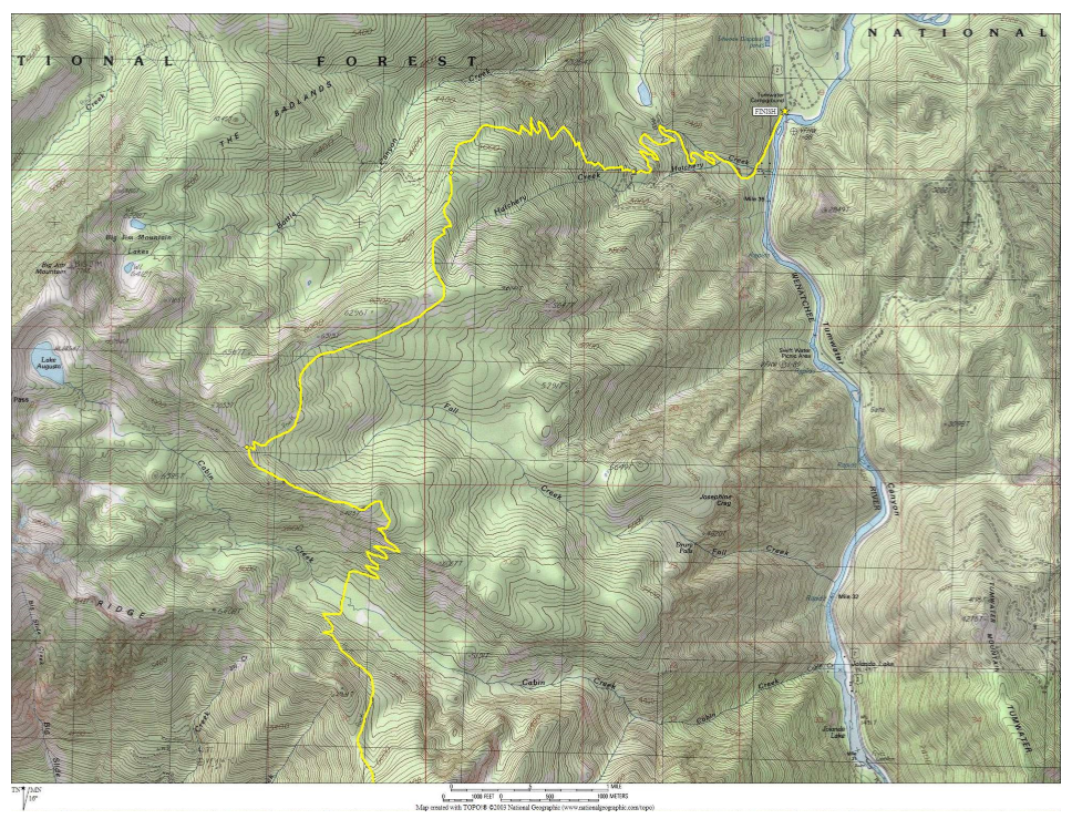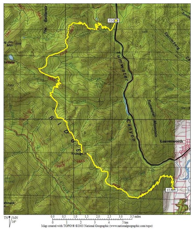 Traverse Way Points: Tumwater Overlook Saddle & Power Creek Basin & Icicle Ridge Lookout Spur Trail junction & Cabin Creek Meadow & Cabin Creek Ridge Junction & Upper Fall Creek & Badlands Junction & Hatchery Creek Trailhead (trail hike); Lower Hatchery Creek & Wenatchee River & Highway 2 intersection (road walk)