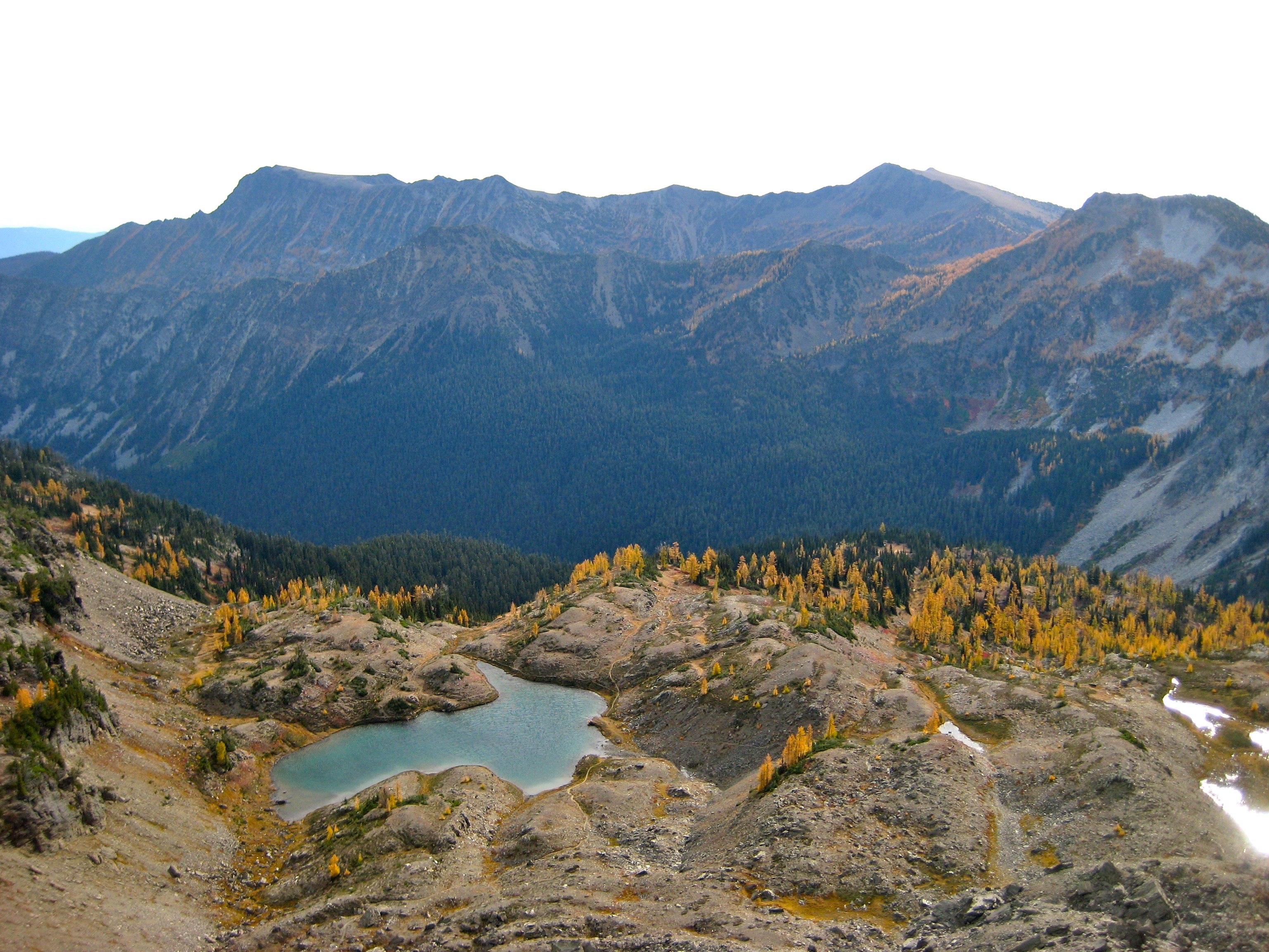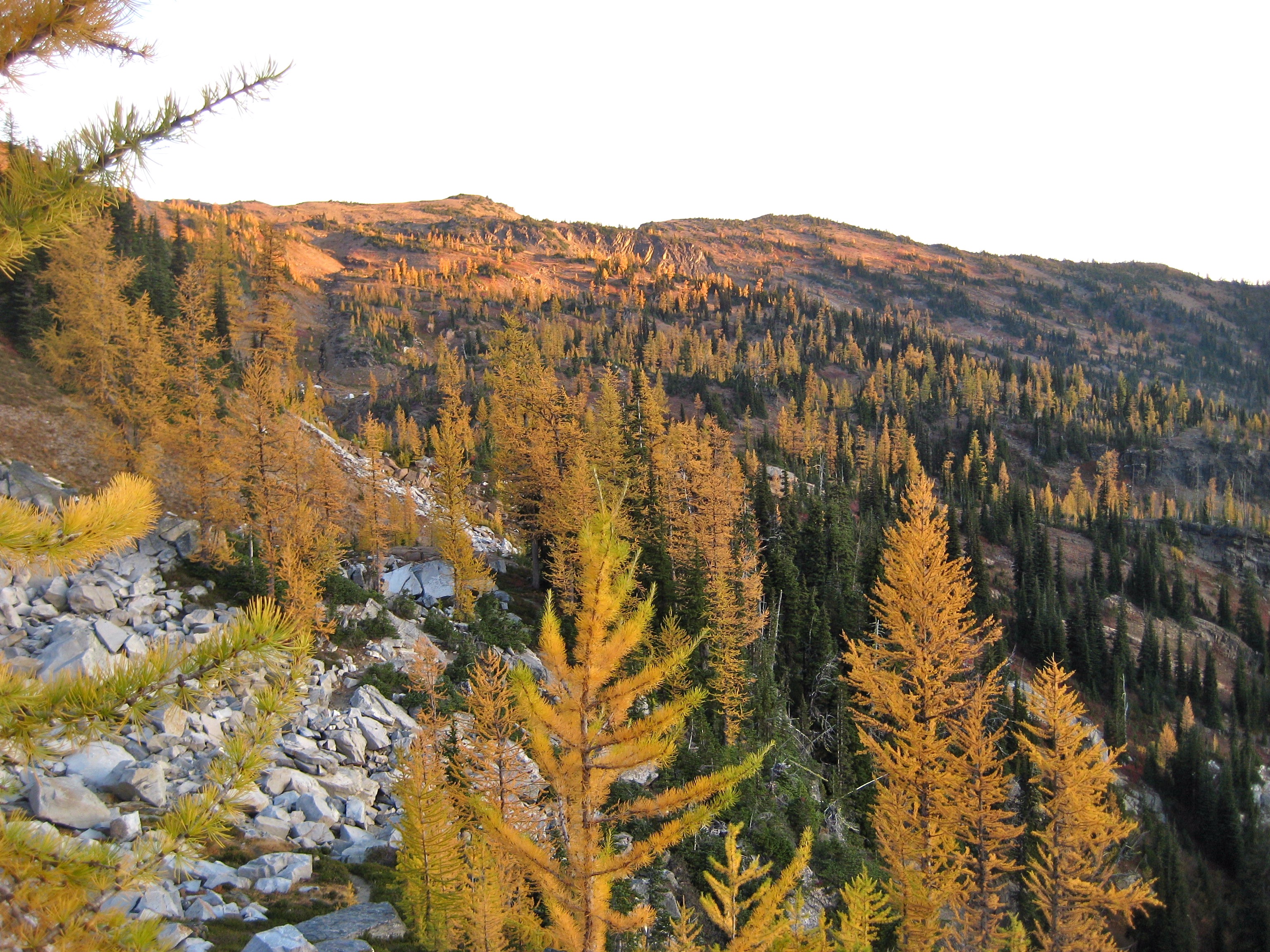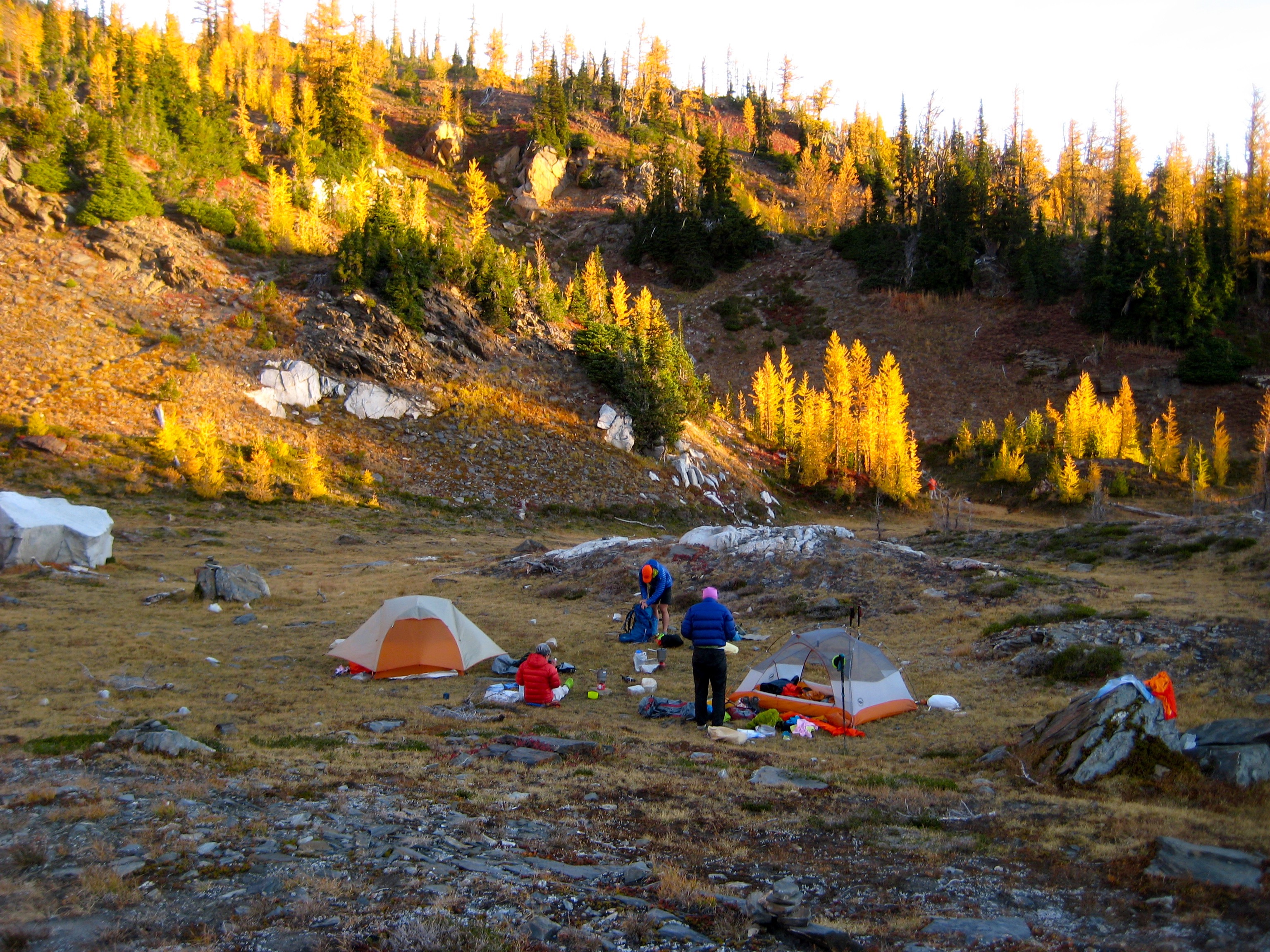 The night had been crystal clear, and we found a thin layer of frost coating our camp in the morning.  Our last several hours of the trip was spent hiking down the nose of Icicle Ridge amid yellow and red foliage.  The dozens of day-hikers we encountered on the lower trail signaled the end of our marvelous journey from larch country to lederhosen country.