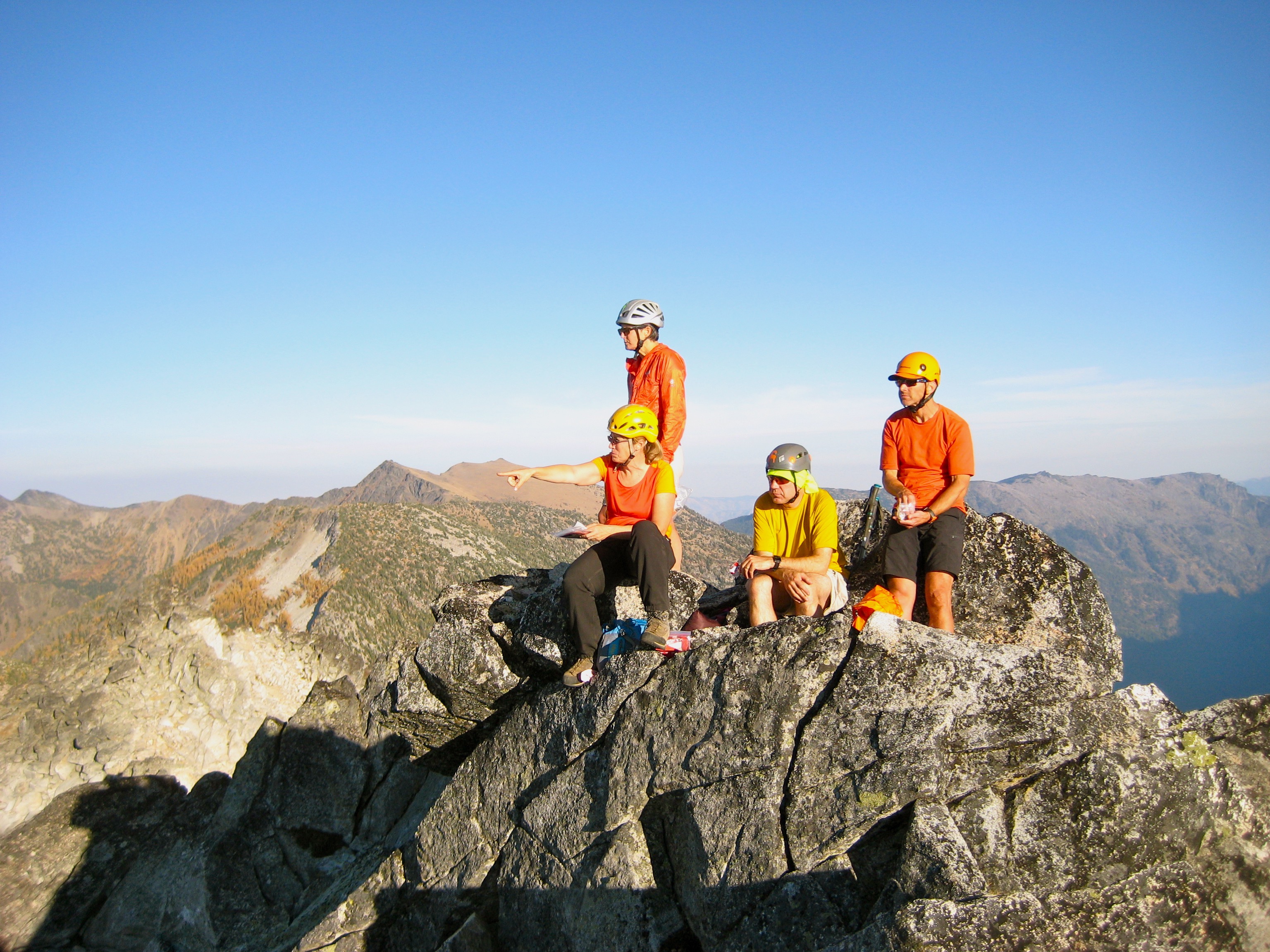 At a point closely below Icicle Peak, we dropped packs an made a short but exposed scramble up to the 7029-foot summit, which formerly hosted Icicle Ridge Lookout. The lookout cabin is long gone, but the airy foundation boulders make this a special place nonetheless.  Visitors will revel in outstanding views across the Chiwaukum Mountains and over to the northern facade of the Stuart Range.