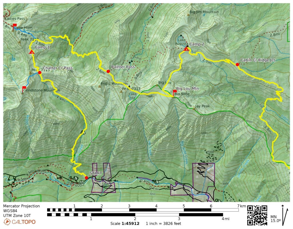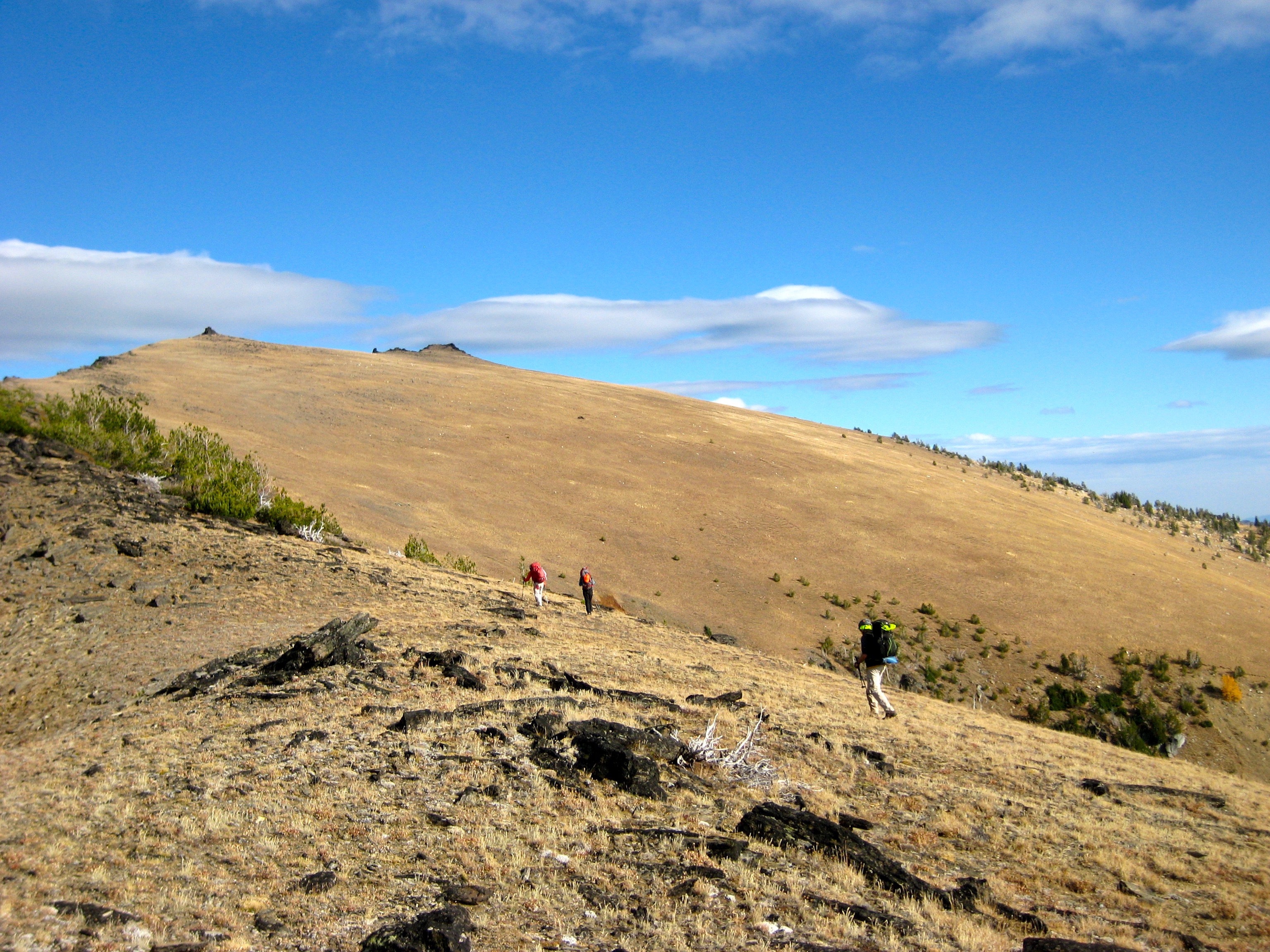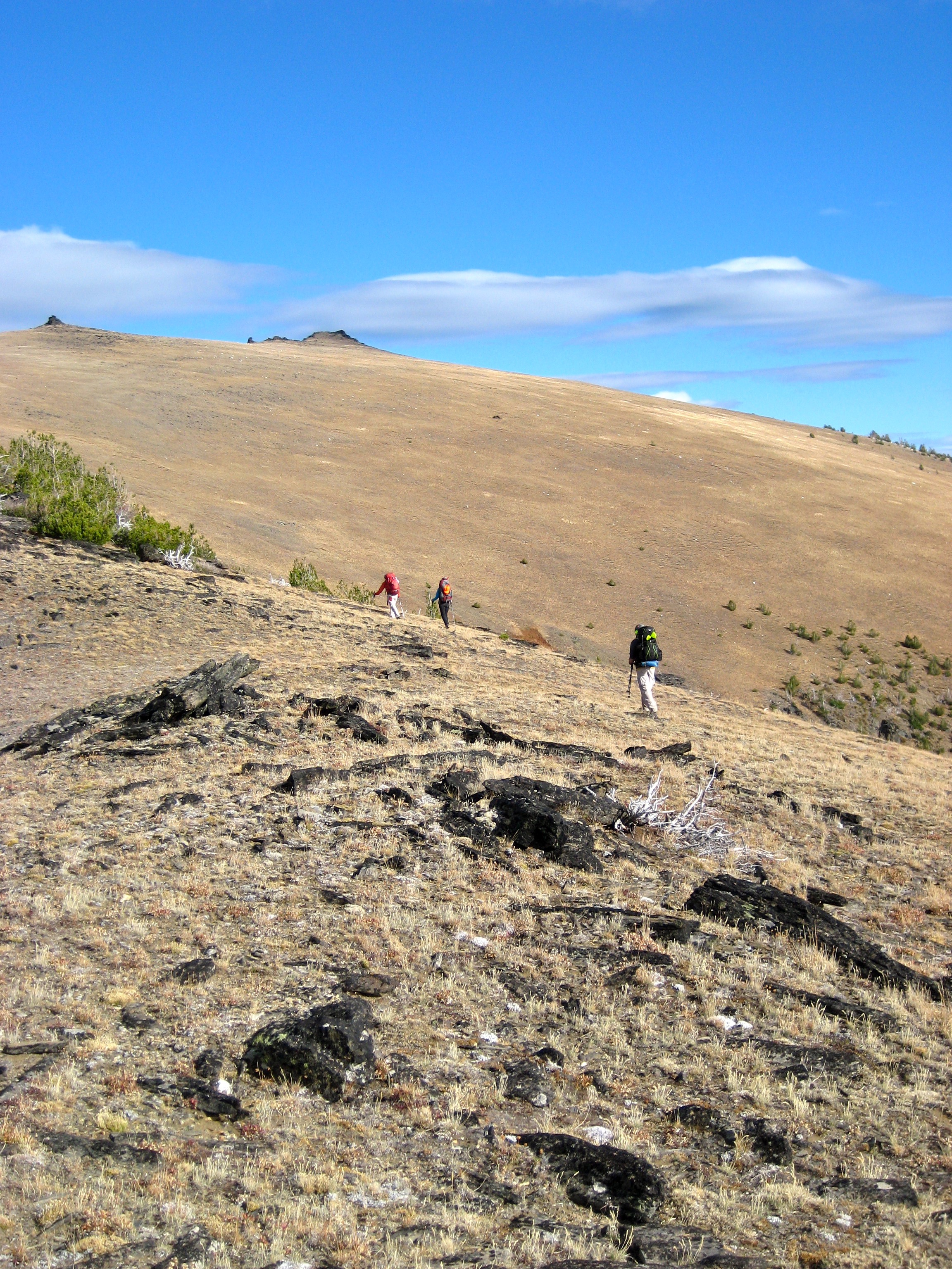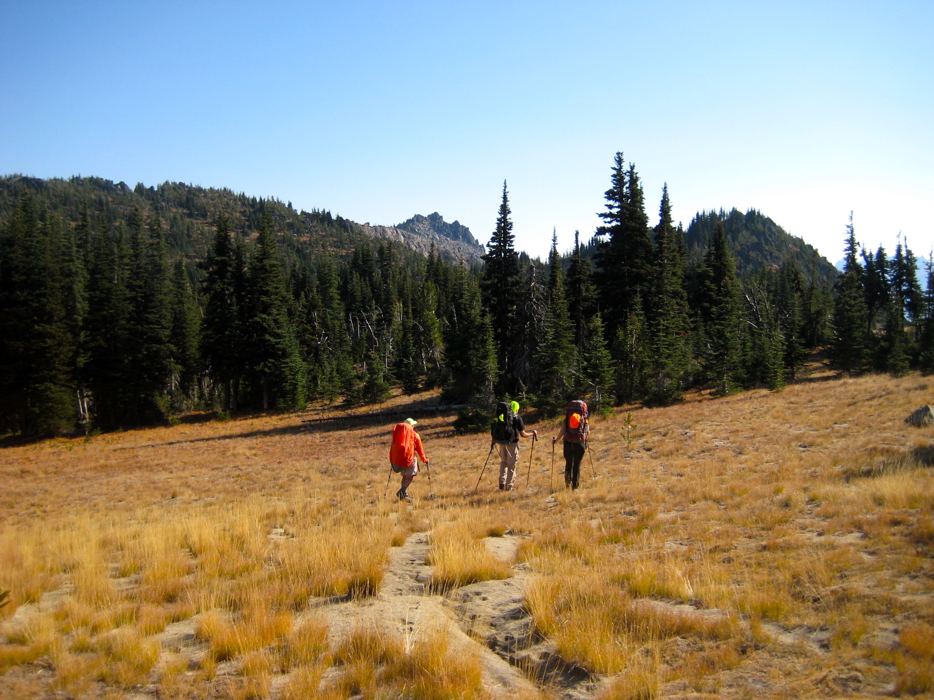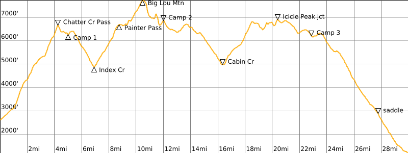 Following a cool night, we awoke to a skiff of graupel on the ground and blue patches overhead.  Our day involved an 1800-foot drop into Cabin Creek, immediately followed by a 2000-foot ascent of Icicle Ridge.  This topographical dipsy-doo was made more challenging by the fact that most of the trail has not been maintained in a decade or so and is difficult to track in many places.