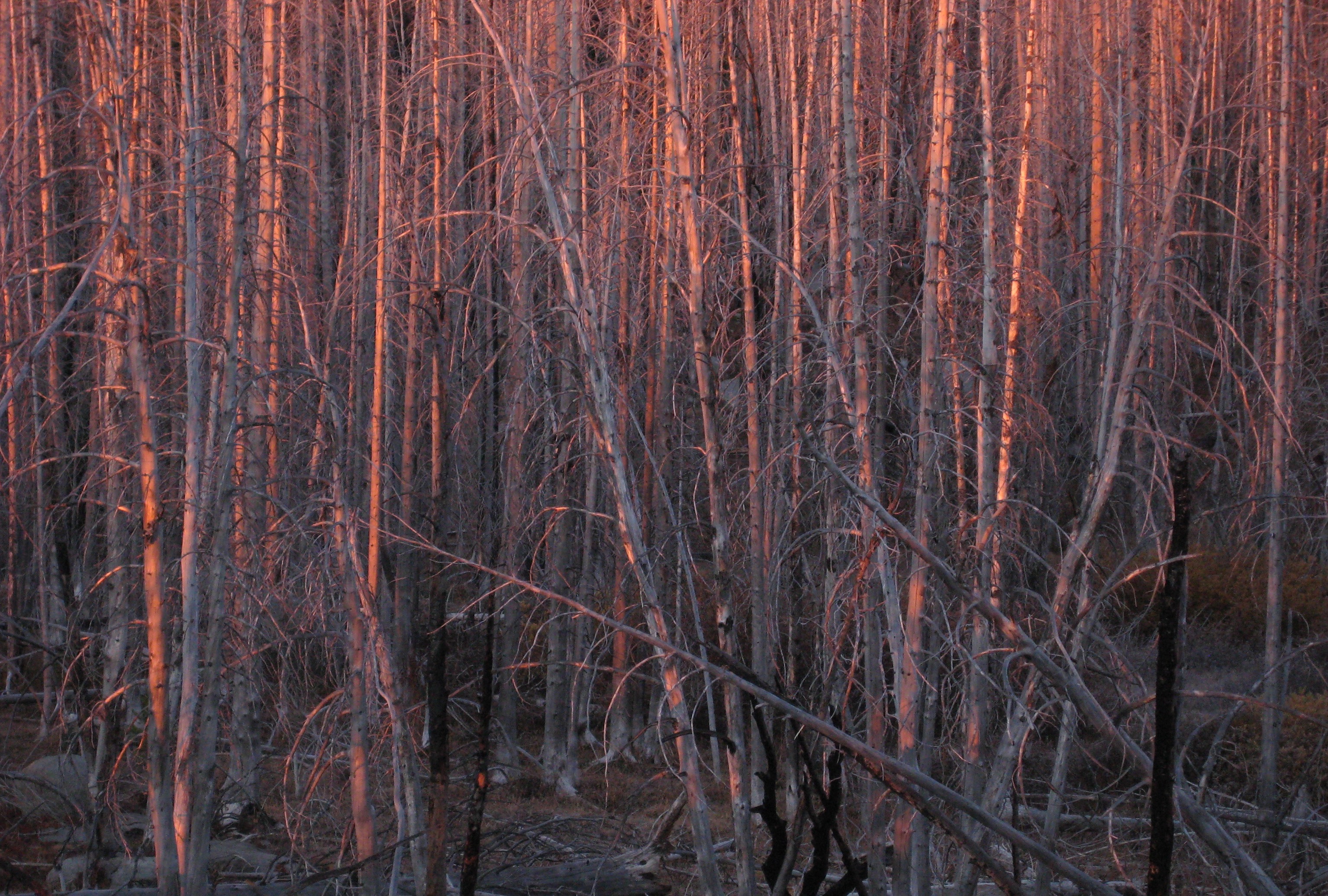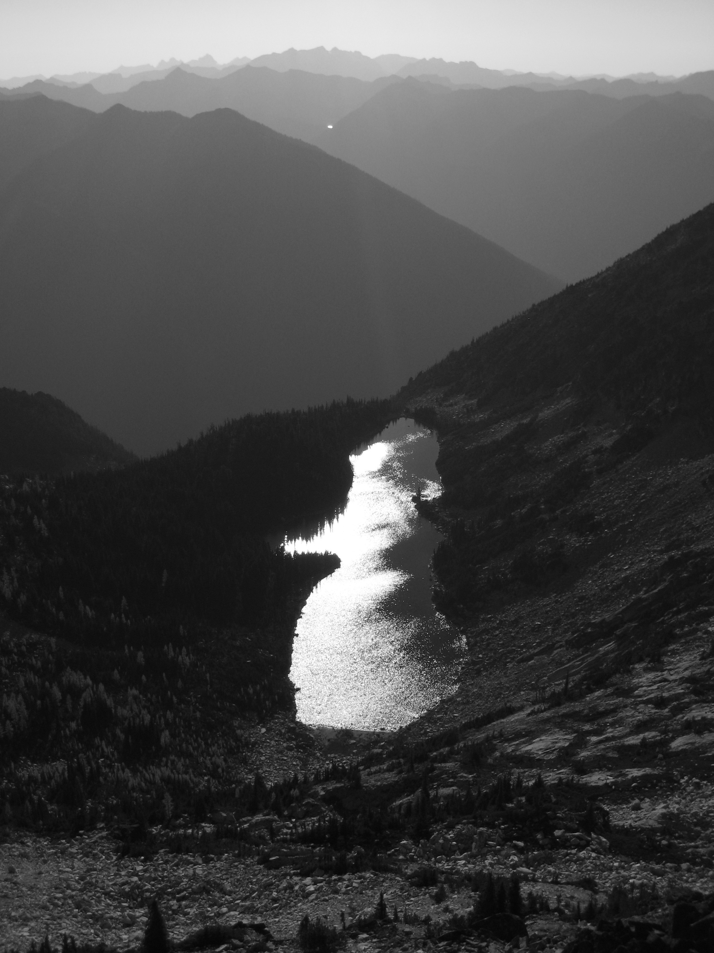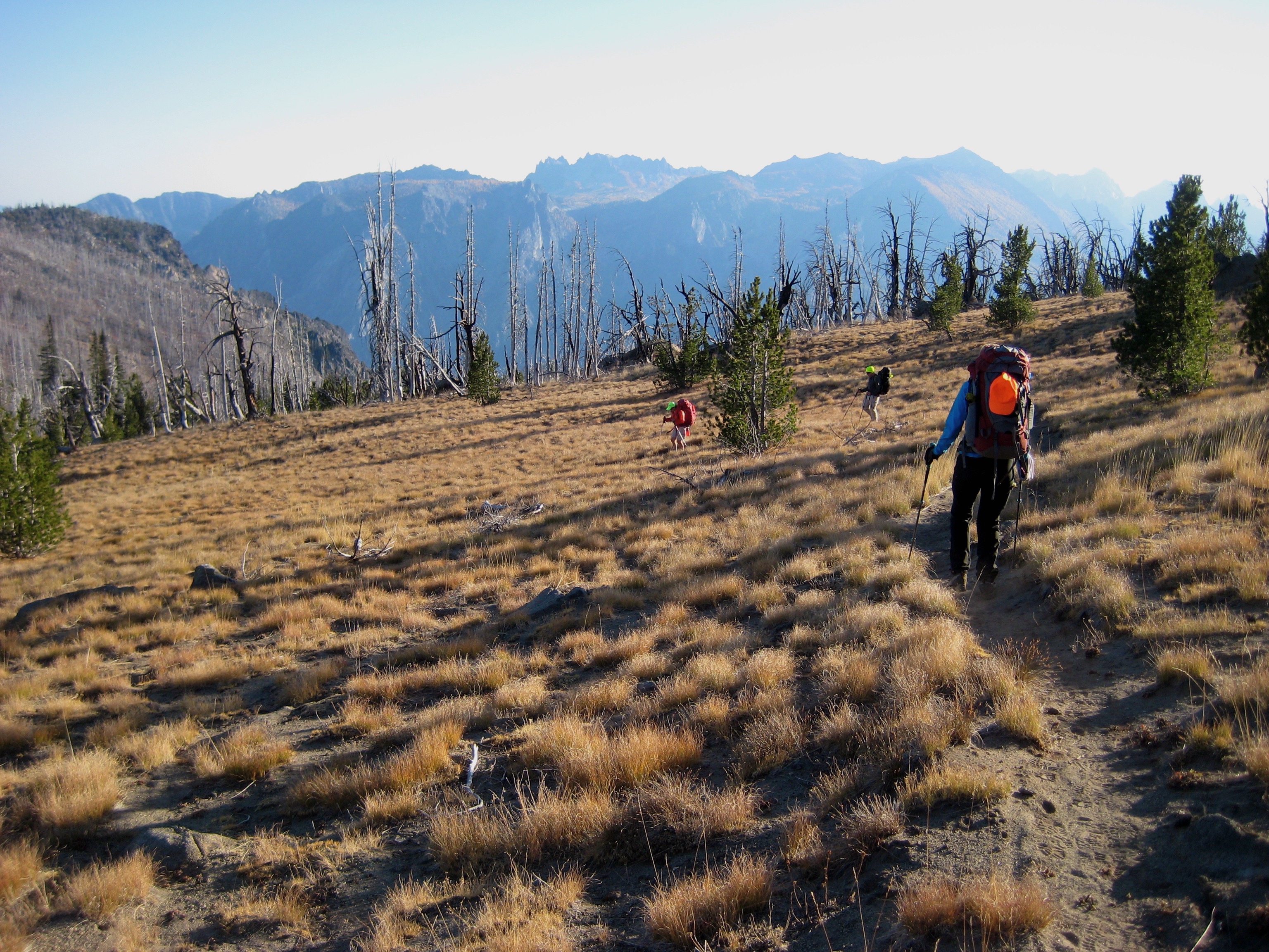 It was late afternoon when we began our 3-mile traverse from the lookout down to Power Creek Tarns.  The ridge crest was burned many years ago and now supports mostly low grasses and eerie silvered snags.  We camped on sandy terraces above one of the tarns (8.5 hours from Camp 2).  These tarns don’t offer much in the way of scenery, but they do provide the only reliable water source between Cabin Creek and Leavenworth.