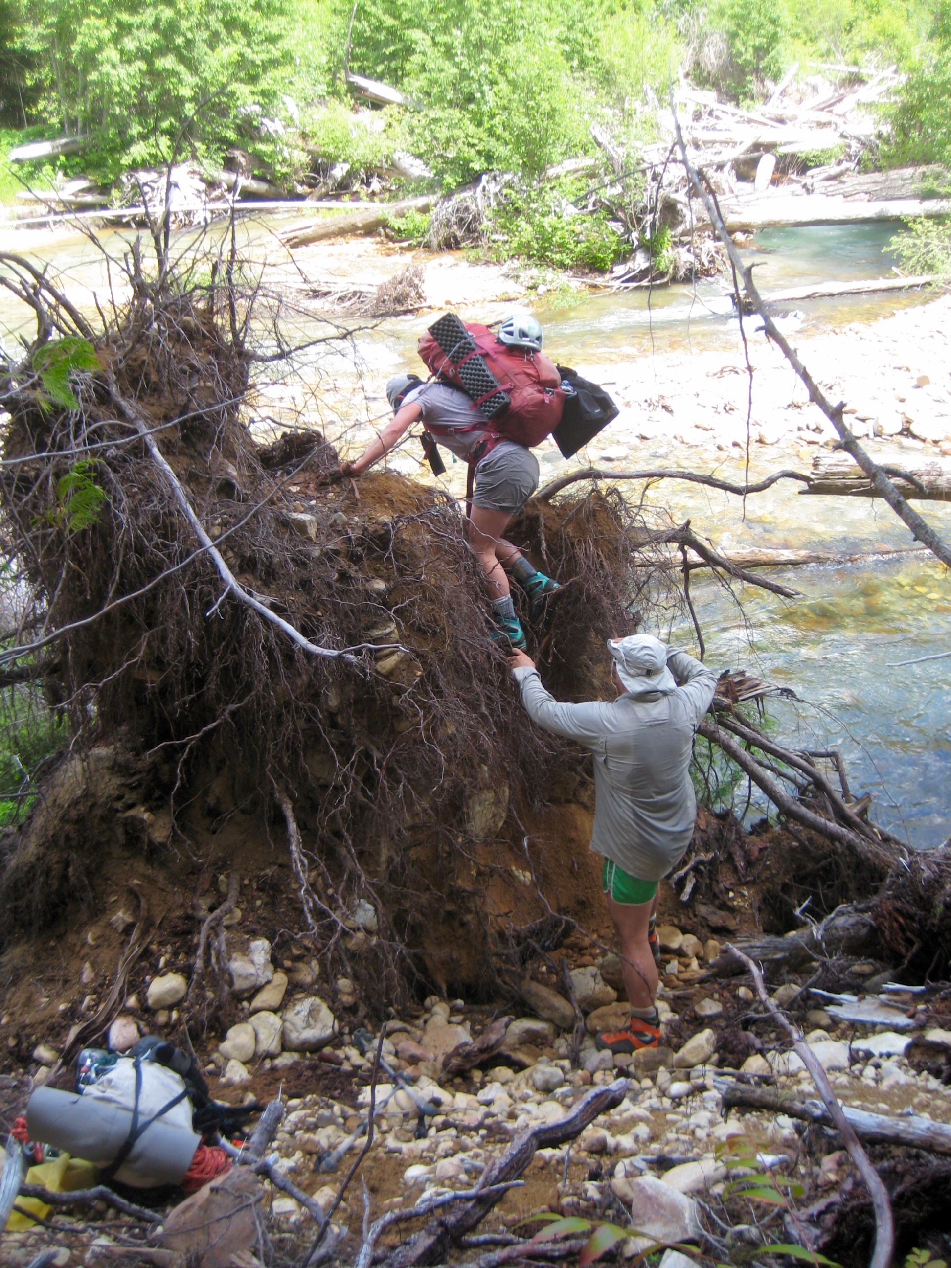 Nearly 2 hours of tramping through valley-bottom brush eventually revealed a log jam about ¼ miles upstream of the former bridge site. (Note: This log jam is located right at the park boundary shown on topo maps.) Crossing the creek involved zig-zagging across numerous sturdy logs and then carefully climbing over the final root ball.