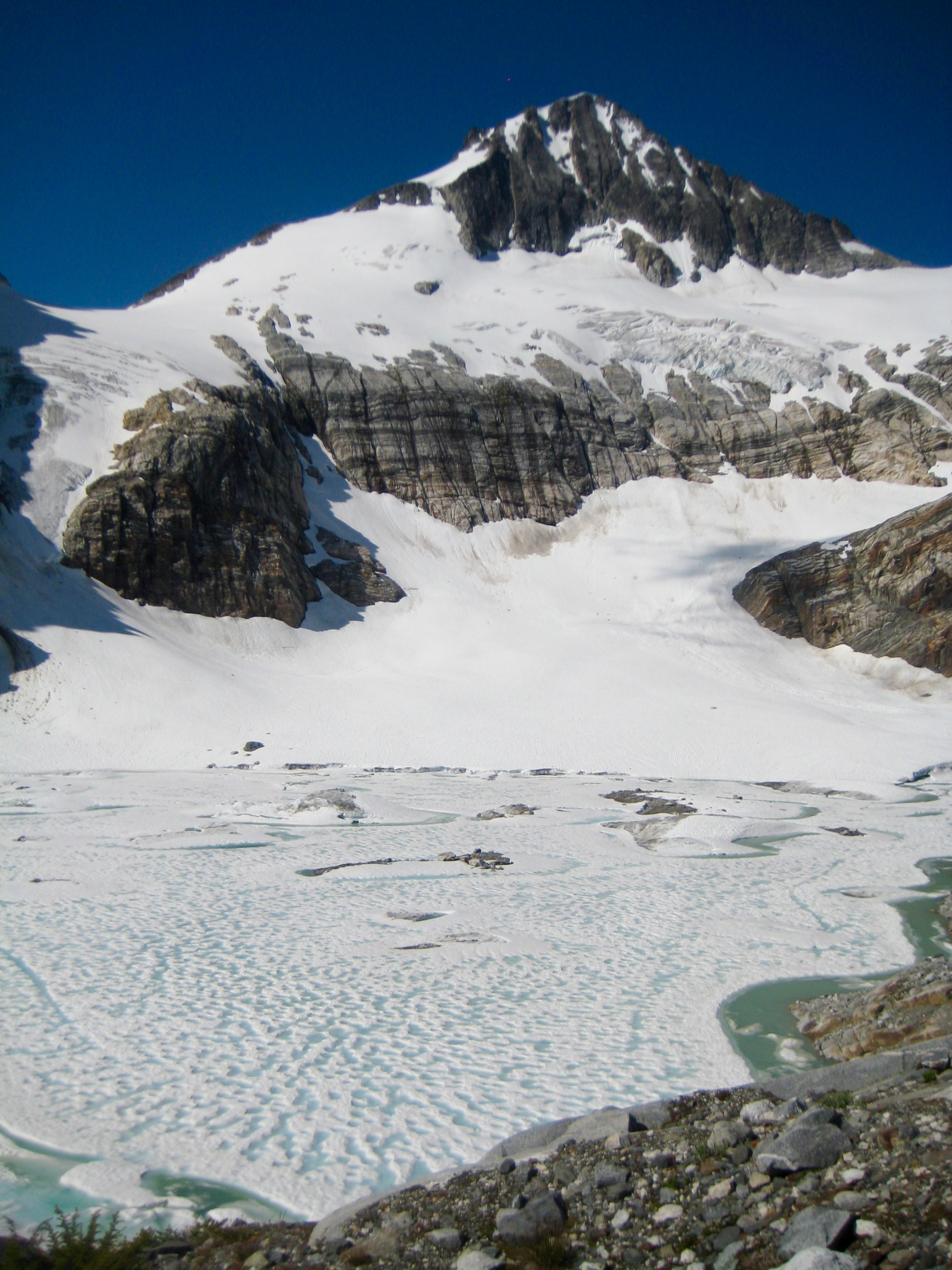 As the Colonial Glacier shrinks, “Colonial Lake” gets bigger, such that it is now necessary to detour around to the east on a rock rim. We crossed over the outlet stream and made an undulating traverse on snow and talus to reach Pyramid Ridge. A climber’s path led us down the ridge crest, and we stopped for the night on a scenic rock step at 5400 feet (10.2 hours + 3000 feet from Camp 6, including summit sidetrip). It was all smiles in camp that night.