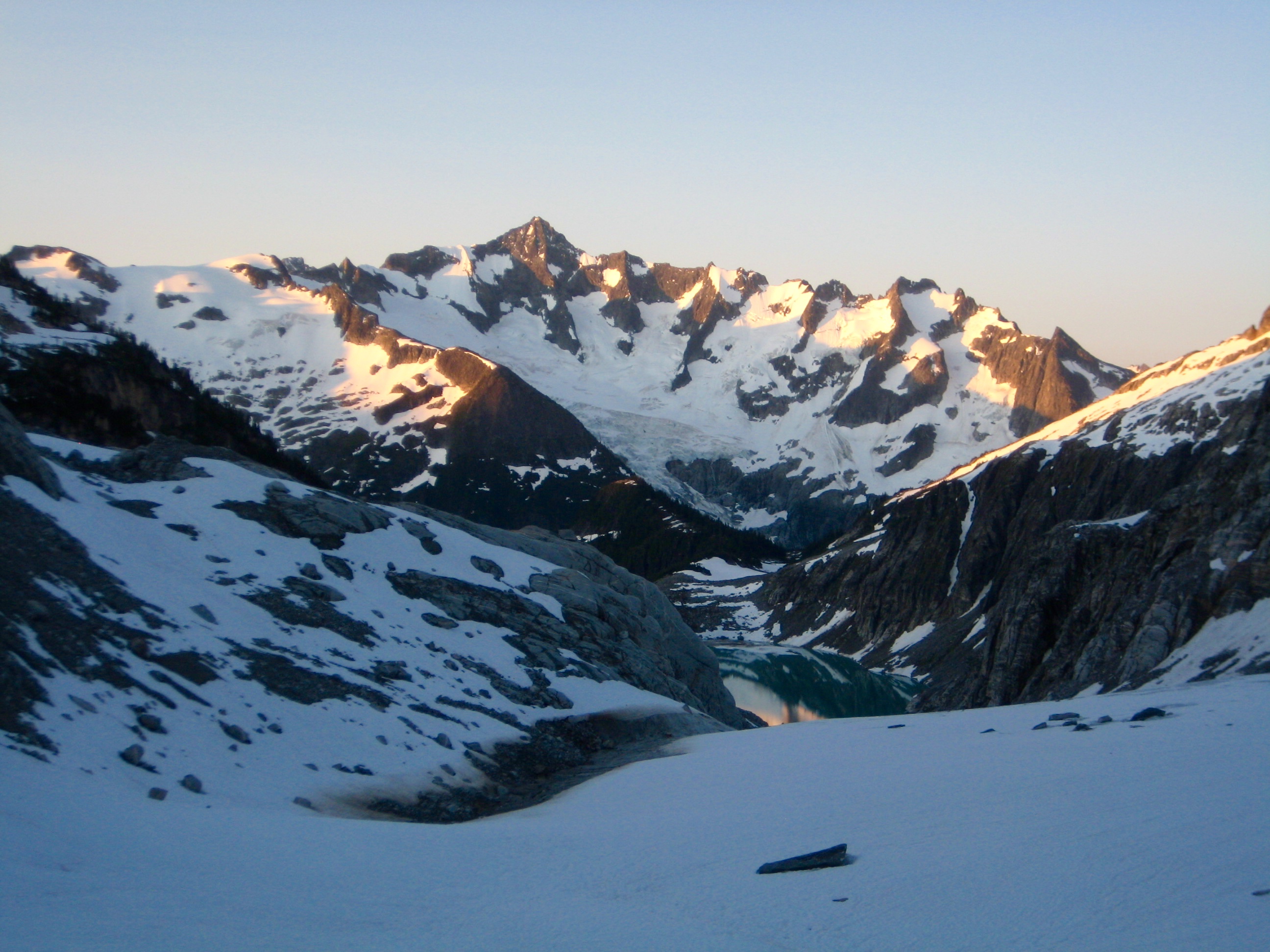 We awoke to clear skies and mild weather, with golden sun highlighting Forbidden Peak above Klawatti Lake.