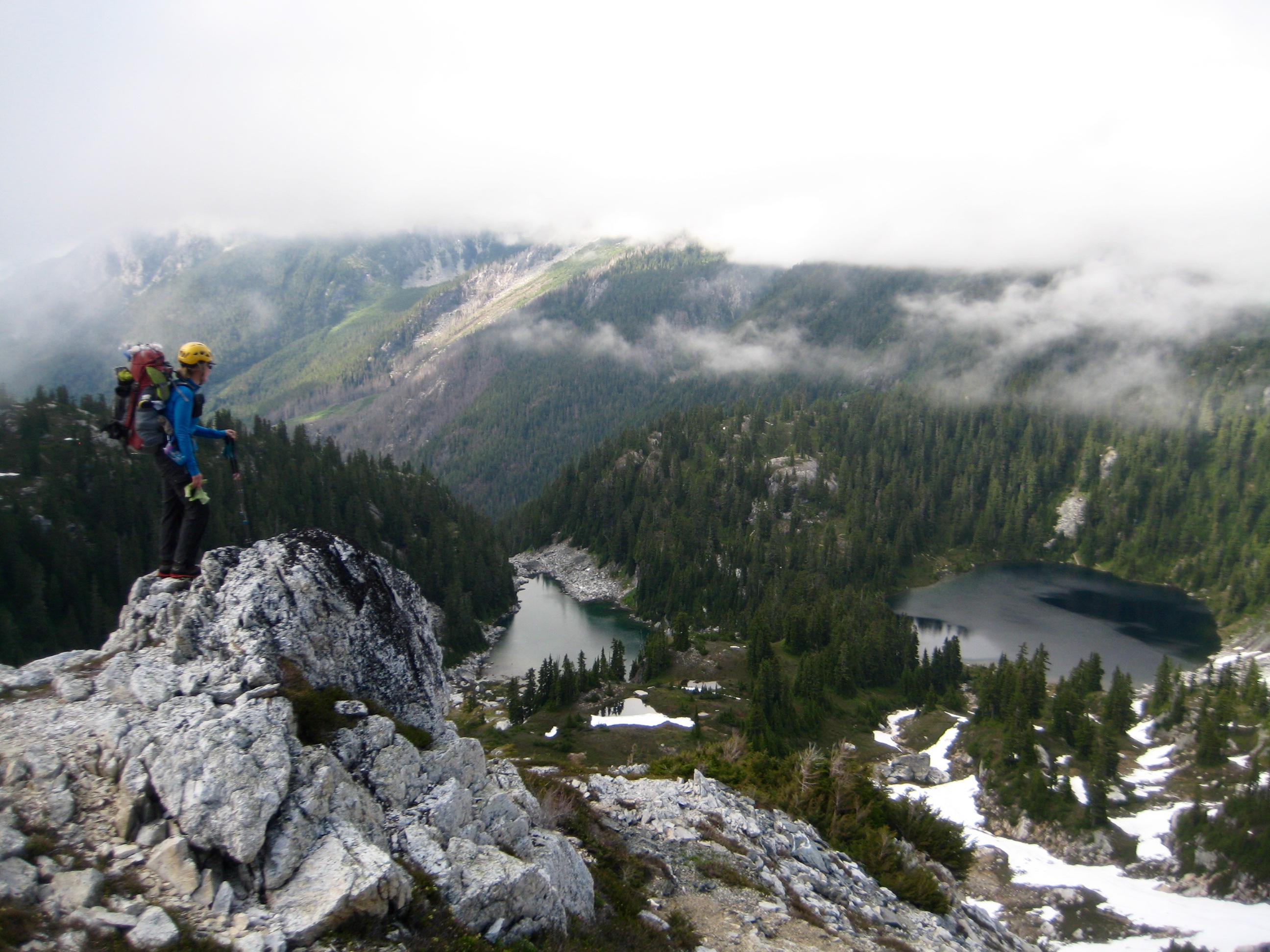 Last week, Eileen and Kevin K and I completed an eight-day link-up of the quite-popular Inspiration Traverse and the seldom-done Isolation Traverse. The combination of these two alpine traverses follows a “U” around the McAllister Creek watershed and is appropriately called the “McAllister Traverse.” Our friend Lisa joined us for the first half of our trek, and as a group, we tucked in the three “anchor tenant” peaks—Primus, Eldorado, and Snowfield—along with the eponymous Isolation Peak. We were plagued by poor weather throughout our week but had a fantastic trip nonetheless.
