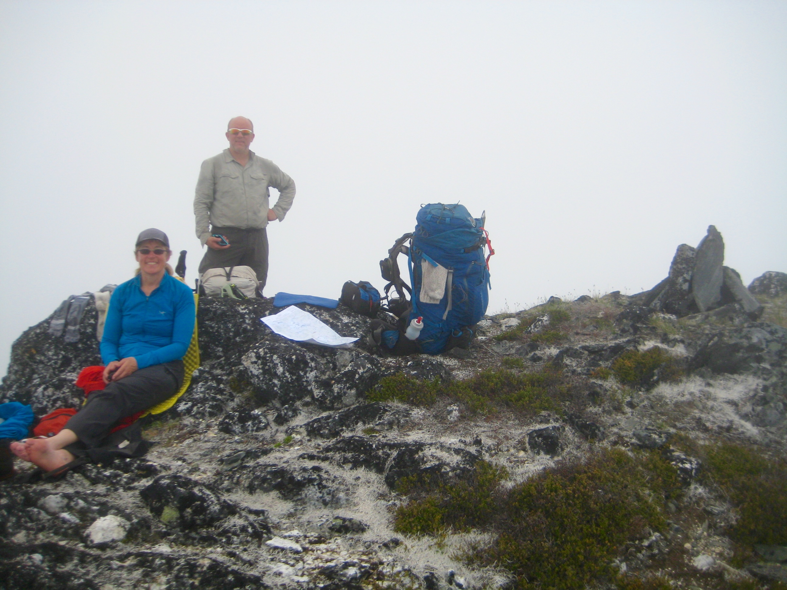 Our hopes for a sunny day—or at least for a mostly clear day—were dashed when we awoke to high valley fog and low-hanging clouds. Oh well, we were totally committed at this point, so there was no choice but to keep navigating with low visibility.