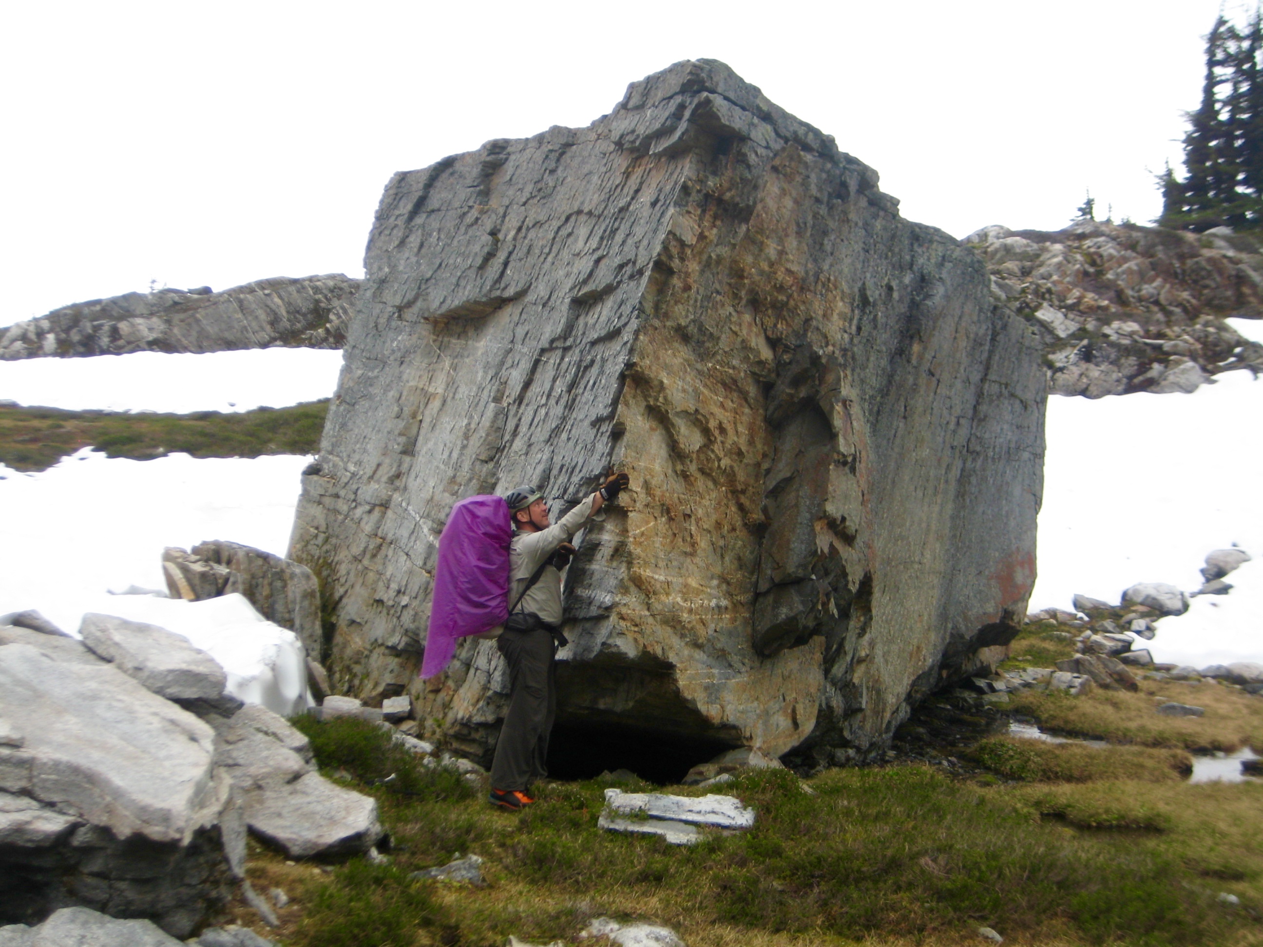 Camping options at the lakeshore were limited, so we continued hiking up a heather draw to the northeast. Along the way, we encountered a remarkably large, angular boulder of Isolation Peak schist. Wouldn’t this monolith look good in your backyard?!