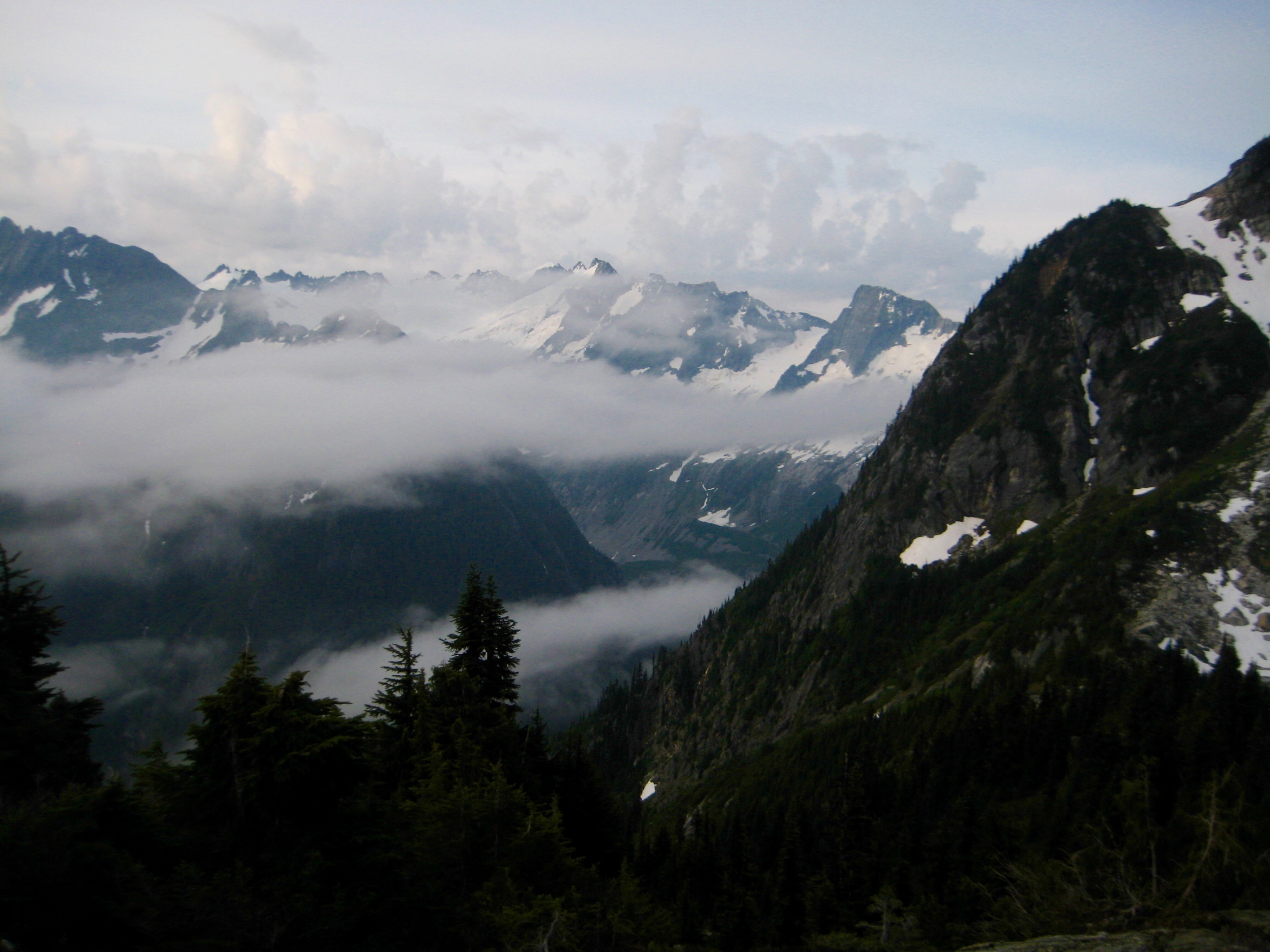 We crossed over Dorado Col and quickly plunged nearly 2000 vertical feet down a moderately steep snow couloir. At an elevation of 5700 feet, we turned right (westward) and began contouring across a series of rock slabs, tree ribs, and steep greenery. The weather was foggy and drizzly, the vegetation was wet and slippery, and we were cold, soggy, and frustrated. It was truly depressing. This would prove to be the emotional low point of our week.