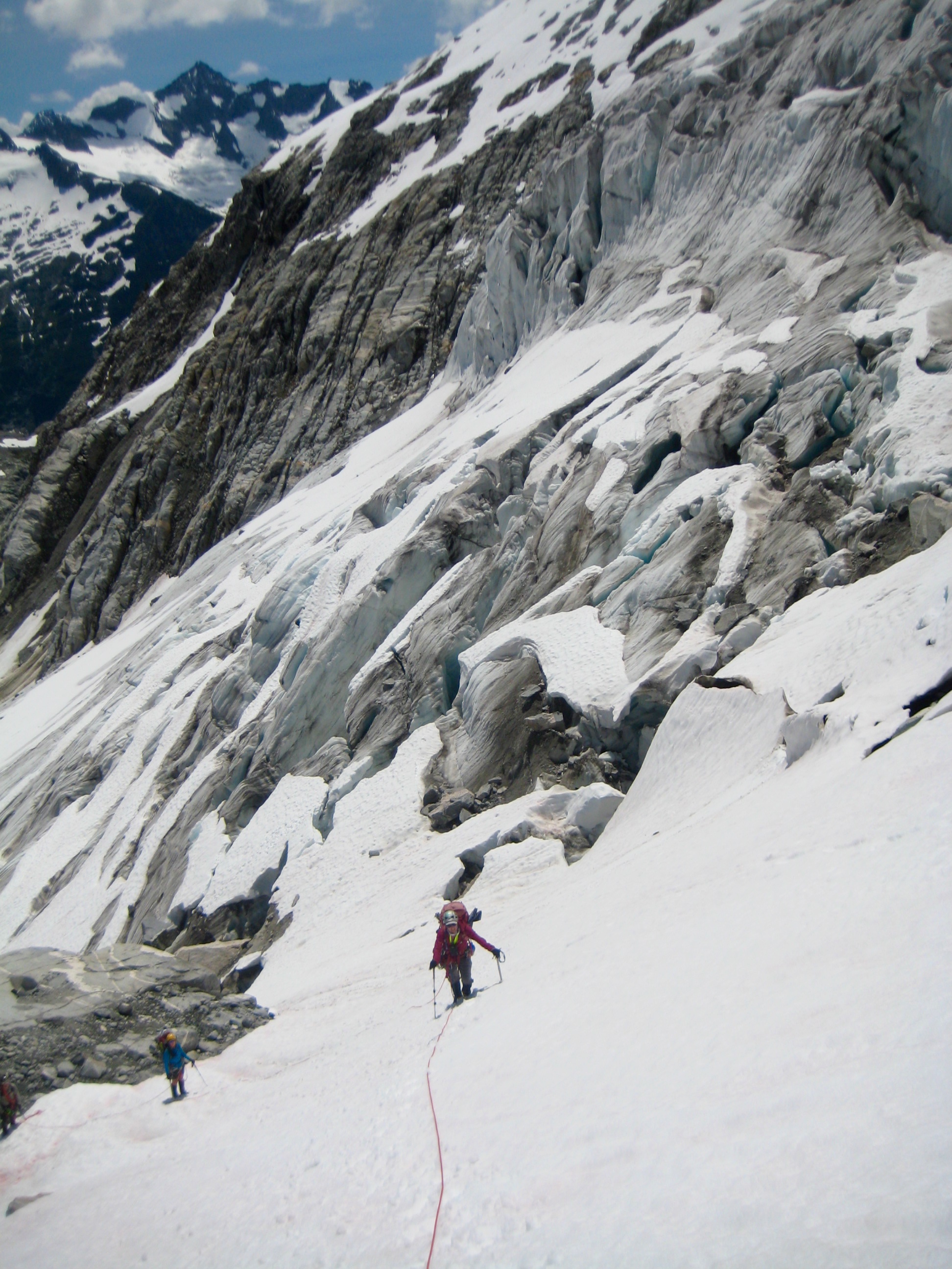 For my second attempt, I led up a Class 4 rock outcrop adjacent to the glacier’s snout. This proved successful, and we were soon traversing above the icefall.