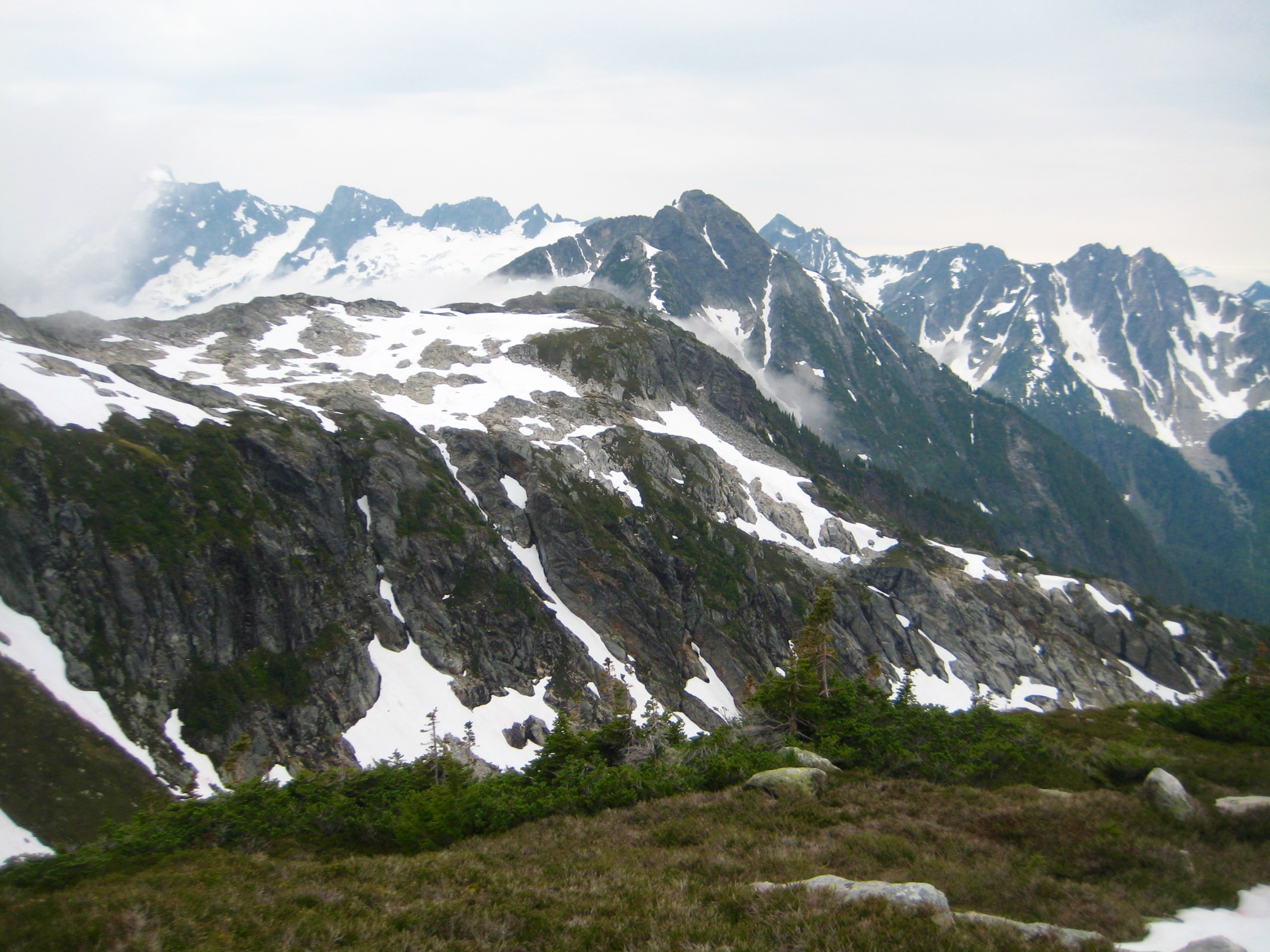 The morning’s traverse was pretty unremarkable: Cross a snowfield. Cross a rock rib. Cross a heather slope. Repeat numerous times, always staying at an elevation between 5700 and 6000 feet. Side-slope gradients gradually lessened to the northwest, allowing for a slight increase in speed as we proceeded.