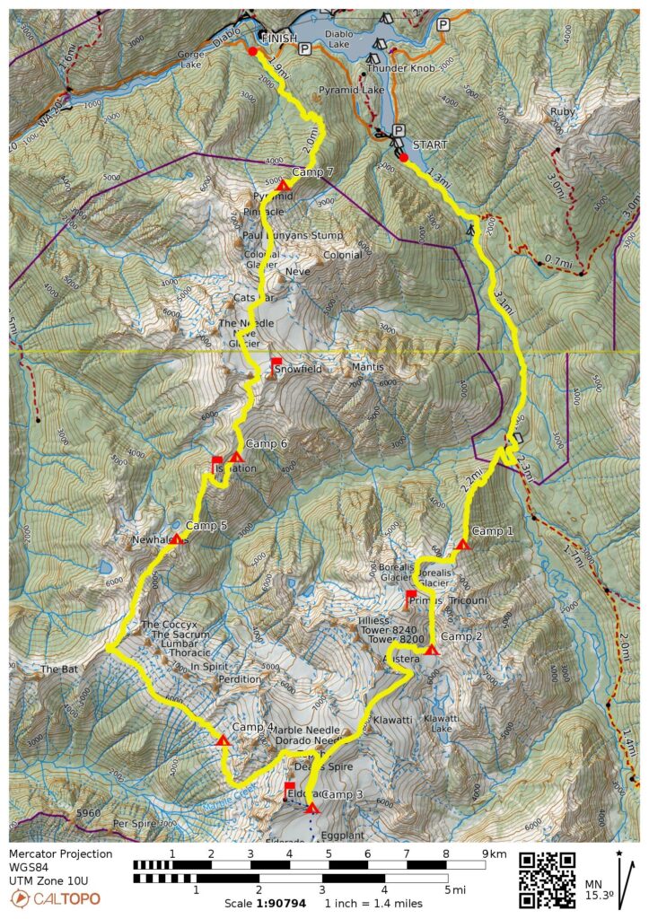 Campsites: Borealis Ridge step & North Klawatti Glacier moraine & East Eldorado Rib & Marble Creek slope & Wilcox Tarns & Isolation Lake knoll & Pyramid Ridge step