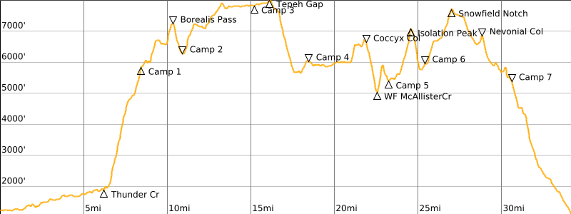 Approximate Stats (excluding all sidetrips): 34 miles traveled; 16,600 feet gained; 16,700 feet lost.