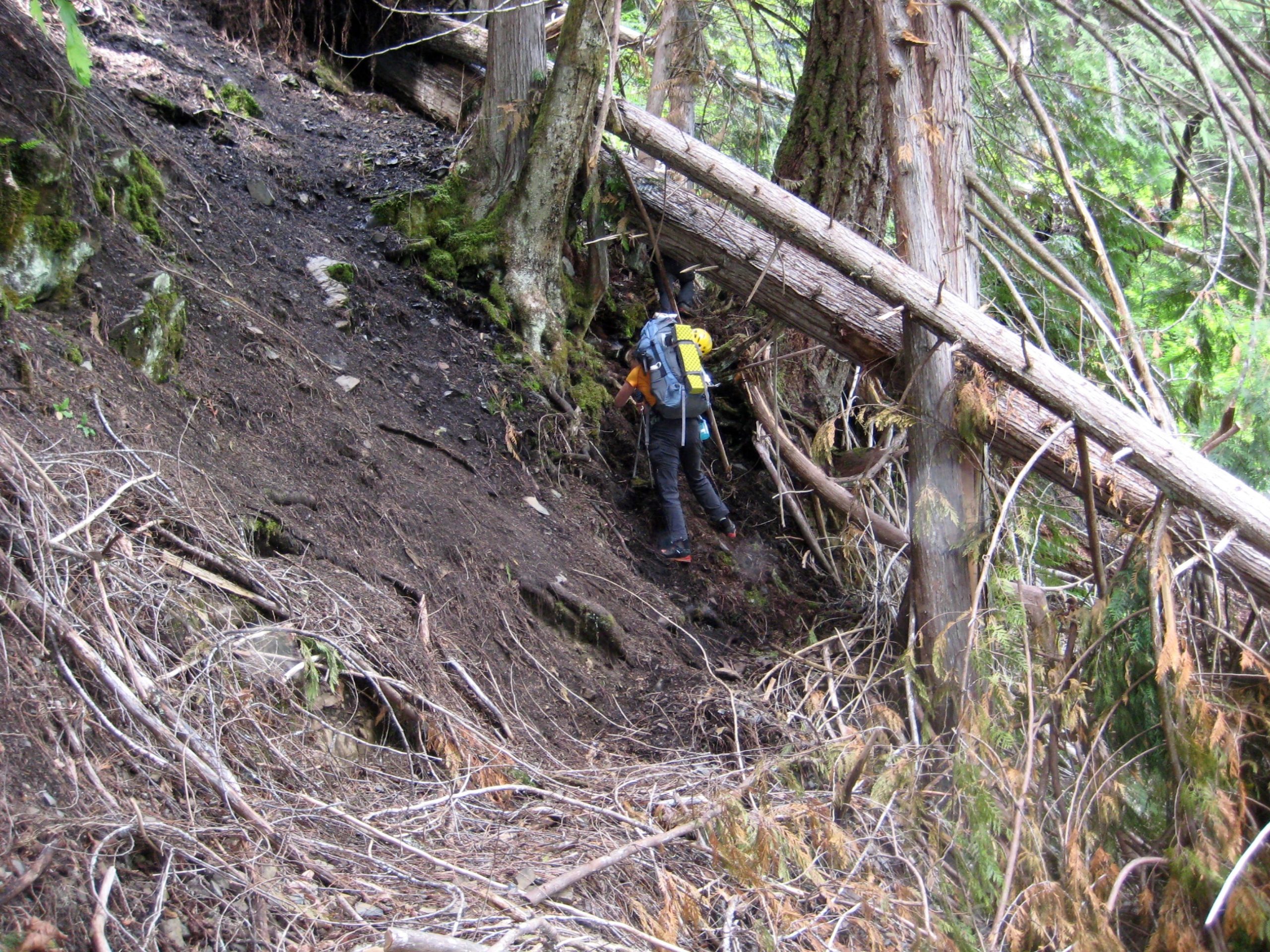 Retracing our route back down the Crater Mountain Trail and along Ruby Creek was tedious and long, especially due to confusion getting through the cliff bands adjacent to the Crater Lake outlet stream. It was past mid-afternoon before we reached the East Bank Trailhead (8.1 hours + 300 feet from Camp 3). No telling when these trails will get their much-needed maintenance, but until that happens, we won’t be eager to revisit the area.