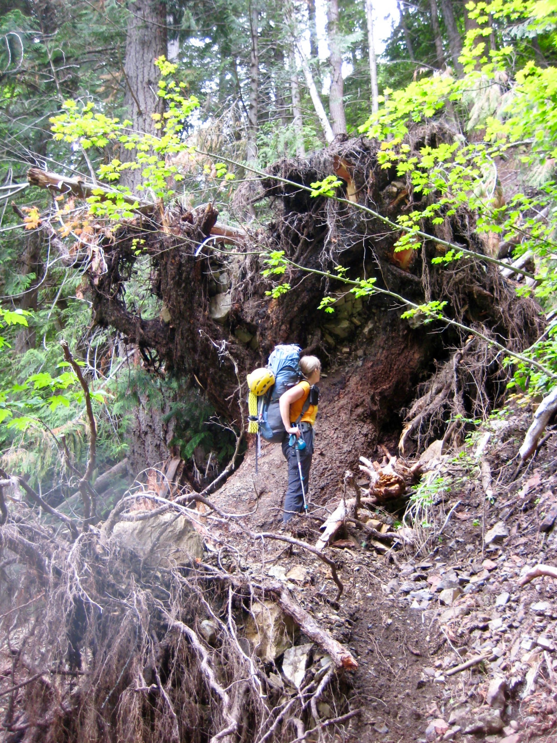 Fording the wide, fully flowing creek was not an option, so we had to drive down to the East Bank Trailhead and start our trip from there. This added 3.3 miles to our approach hike, which wouldn’t have been so bad except that the last mile was a mess of fallen logs, rocks, debris, and overgrown vegetation. The worst spot is just upstream of the missing bridge, where a very large tree has fallen across the trail and triggered a small landslide. Getting over the huge root ball required some gymnastic Class 3 dirt scrambling.