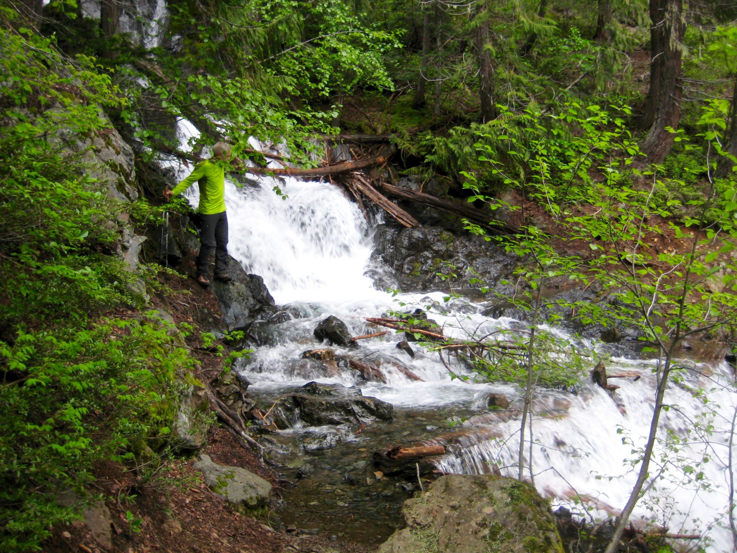 The next mile of trail had several fallen logs, but then conditions got much better. That is, until we encountered the Crater Lake outlet stream at Elev. 4750 feet. Although this is not a particularly large stream, the trail crosses it at a narrow spot between thundering waterfalls (apparently due to poor planning by the trail designers 100 years ago). A slip here would likely result in a long death-ride over the cliff. Yikes!