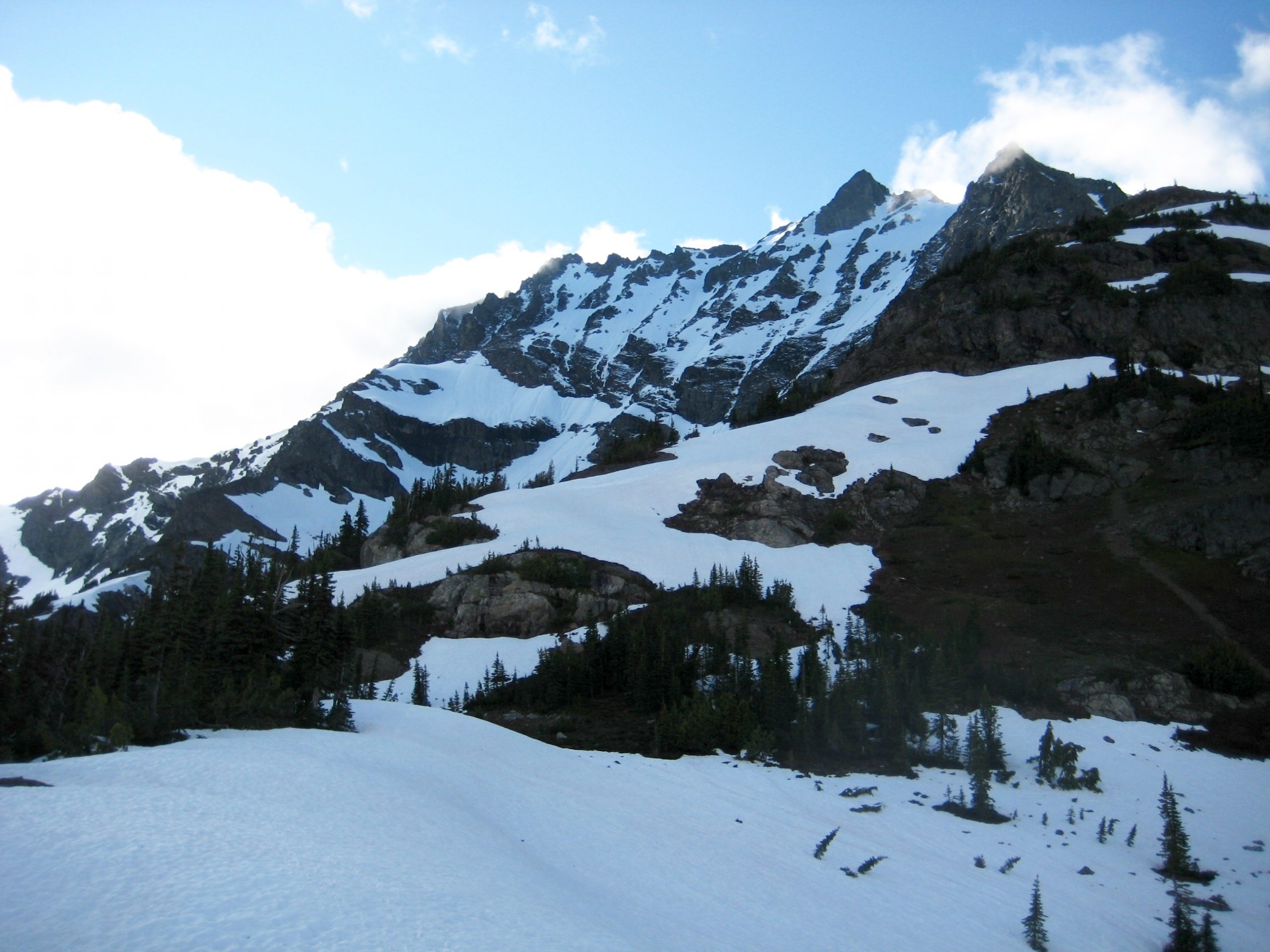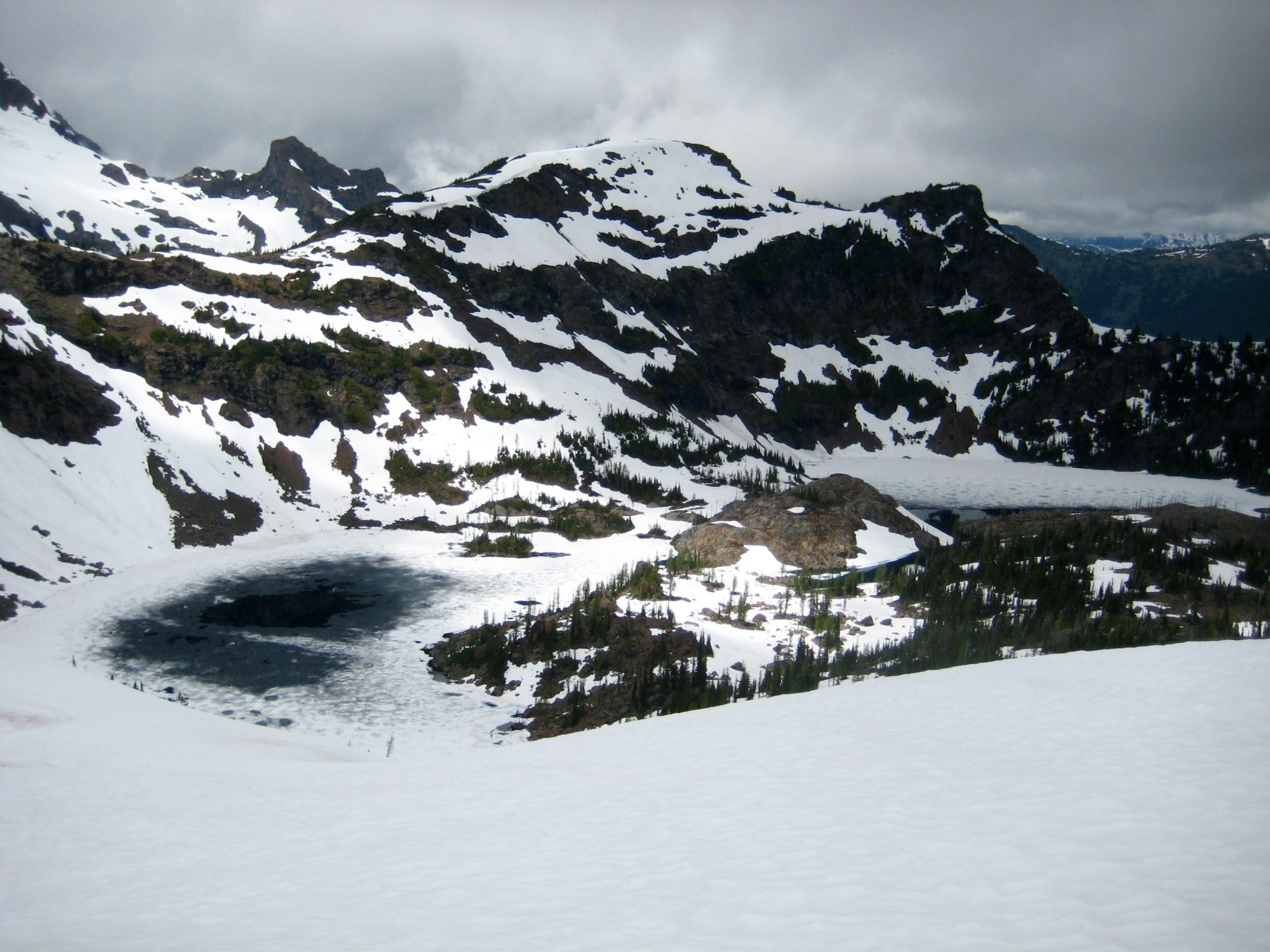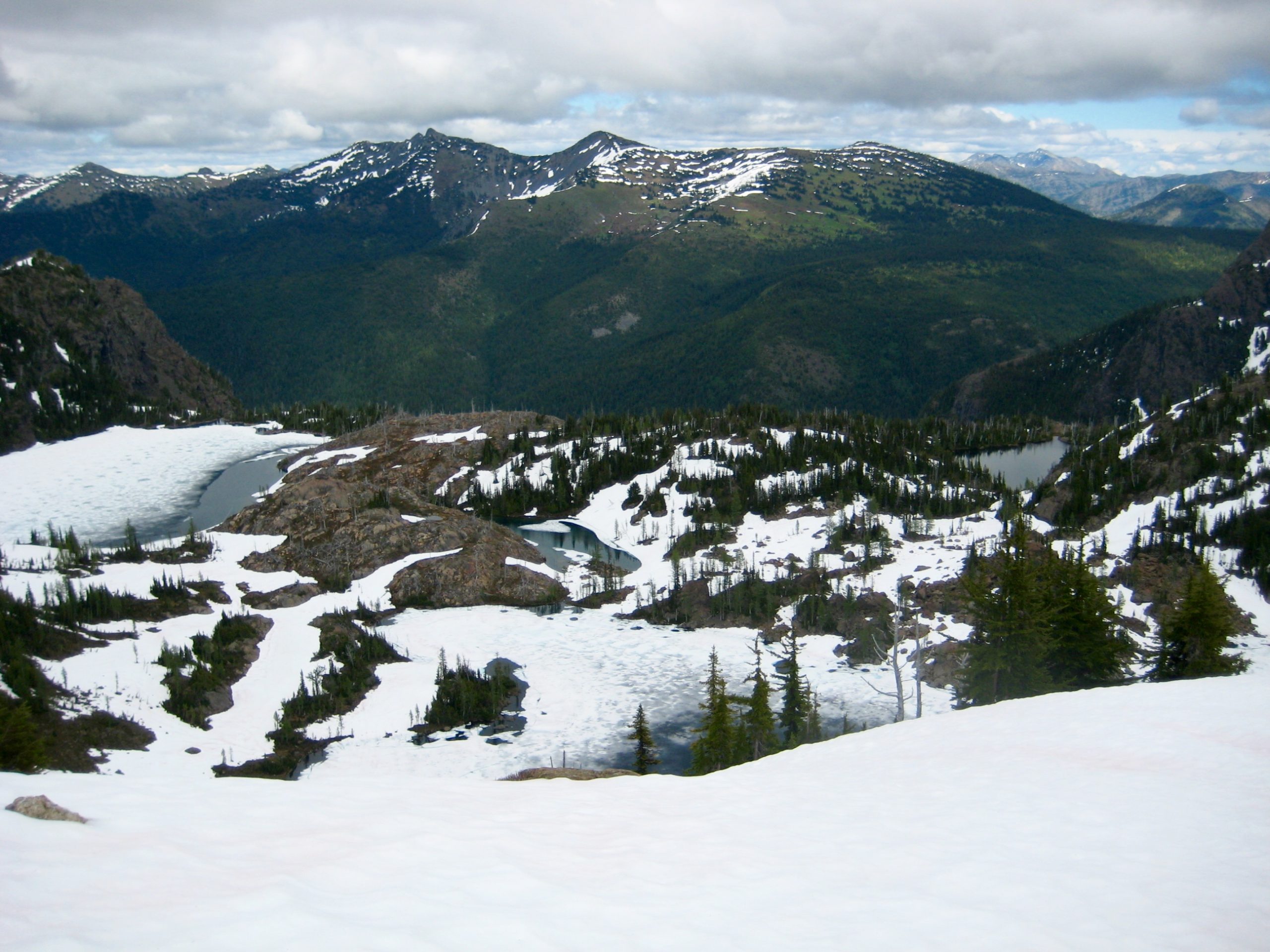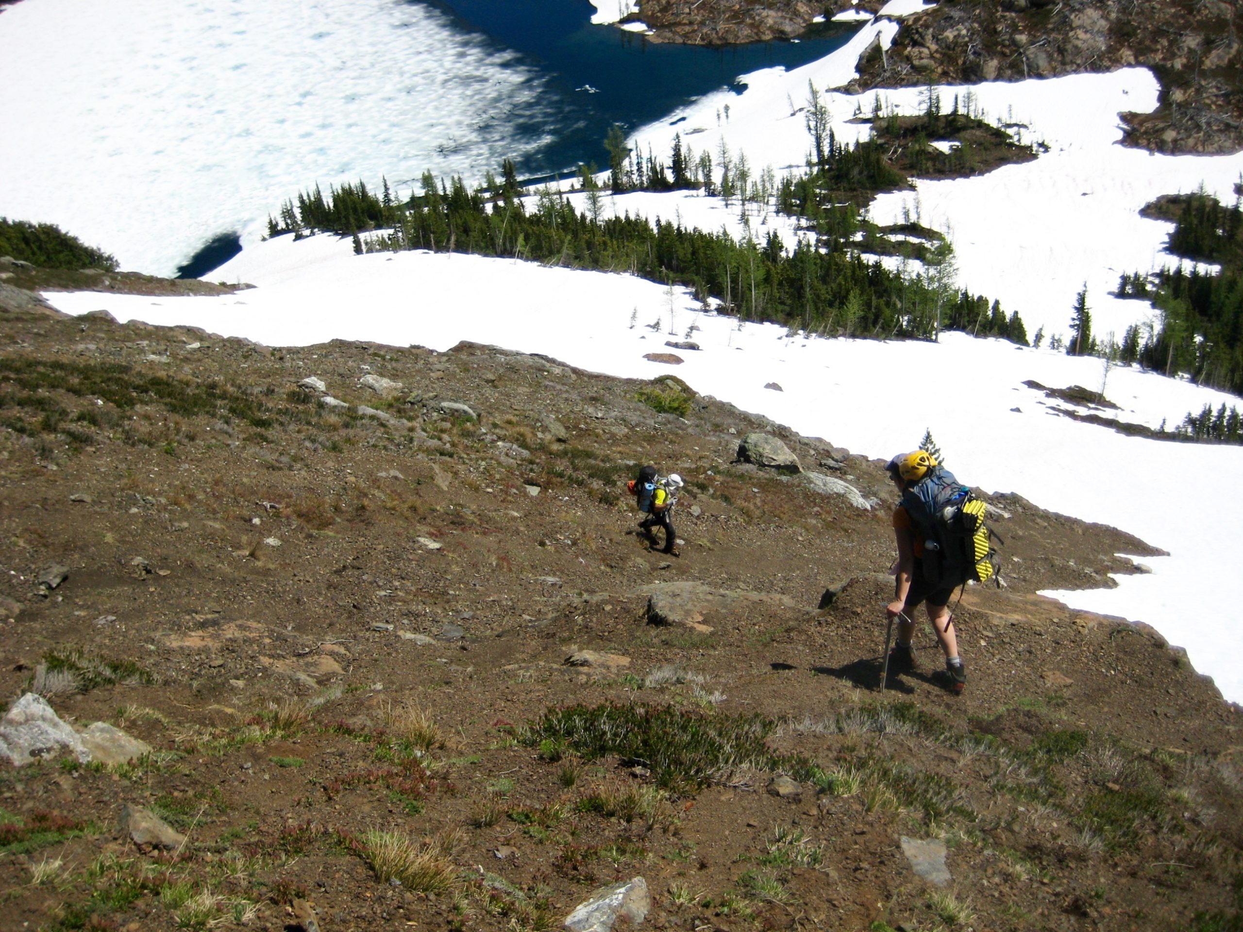 George and Eileen and I spent Independence Day Weekend in the Jerry Lakes area between Crater Mountain and Jack Mountain. What we encountered was, in short, really bad trail conditions and really good snow conditions—but not what we needed for a climb of the Skagit King.
