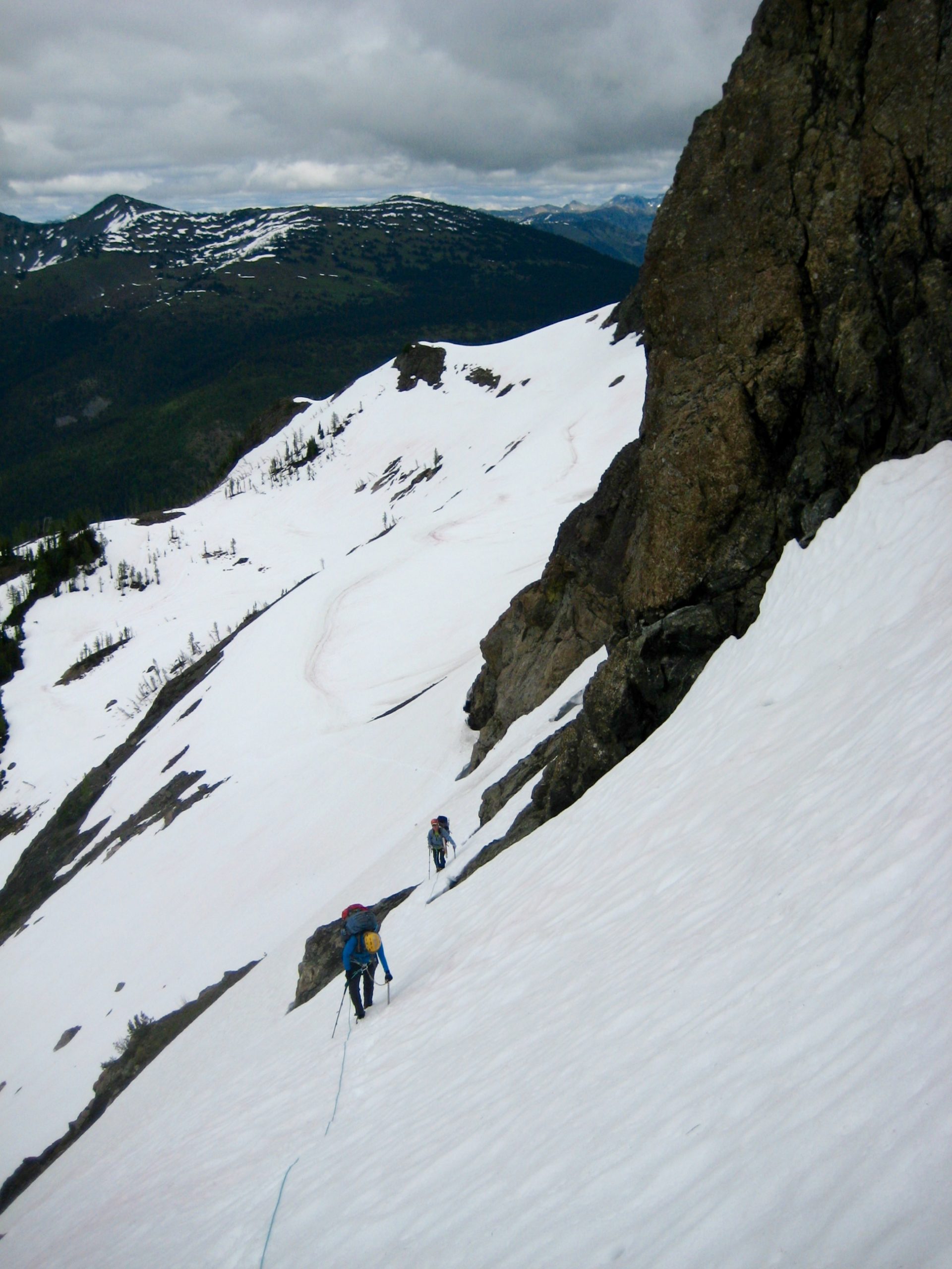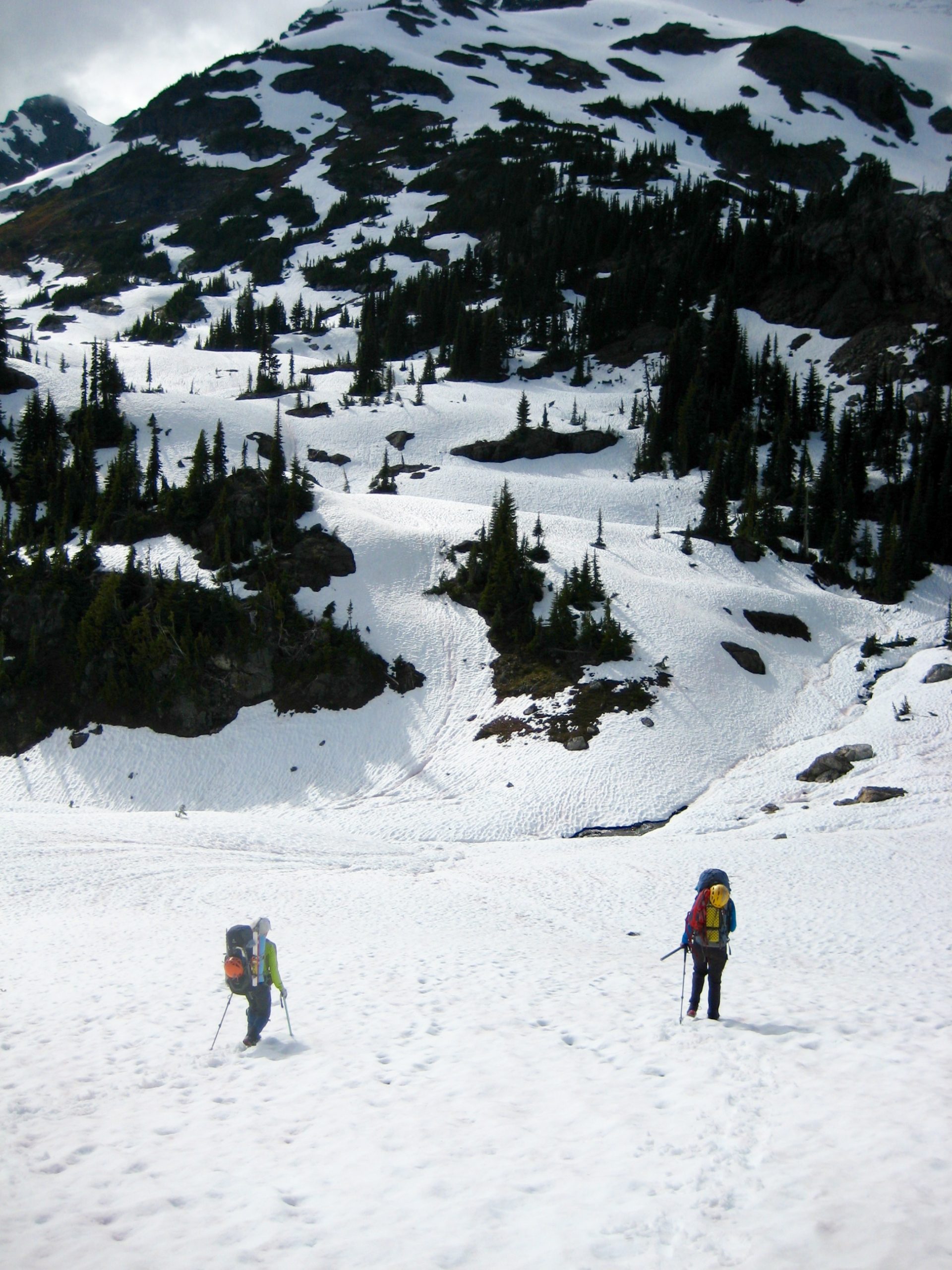 We crossed the outlet of Devil’s Lake, then contoured below the Jerry Glacier on nice snow slopes.