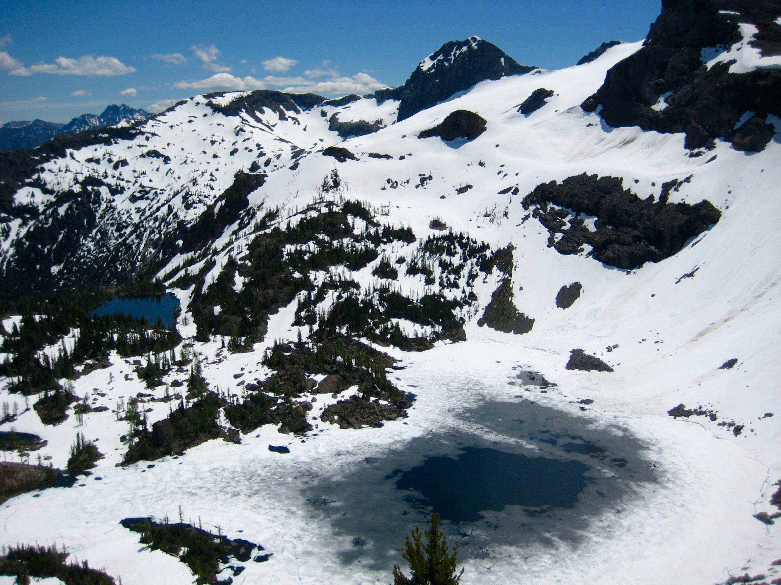 Just past the glacier, we reached a saddle overlooking scenic Jerry Lakes (4.0 hours + 1650 feet from Camp 1). The two small lakes were melted out, whereas the two large lakes were still mostly iced over.