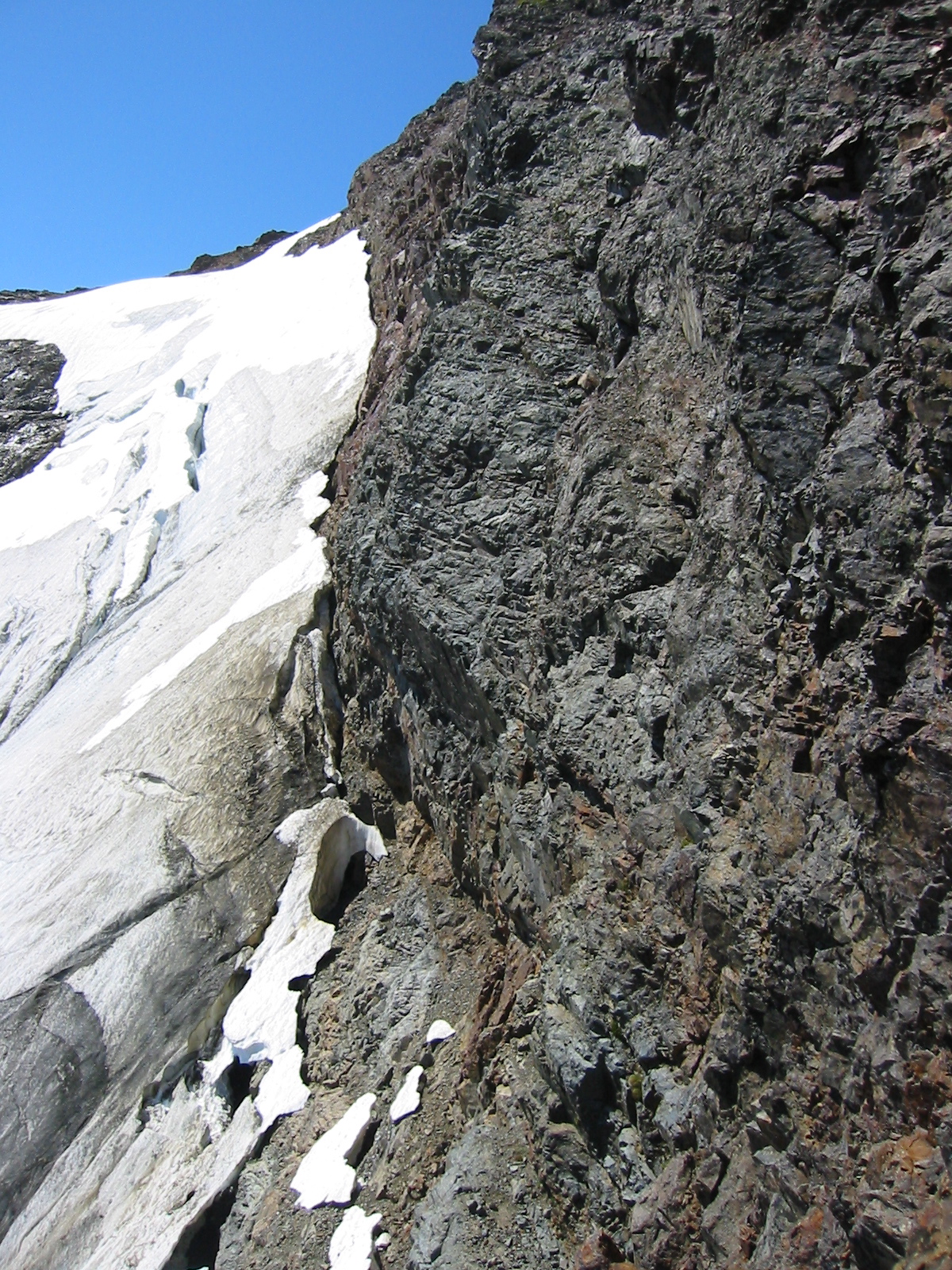 Even with the reliable climbing information we brought, it was hard to envisage a safe route through such a formidable obstacle!  We easily identified the fish-shaped snowfield that Mike C. had mentioned, but Beth astutely observed that it actually looks much more like a lobster claw than a fish.  I’m sure Franklin W. Dixon would agree.