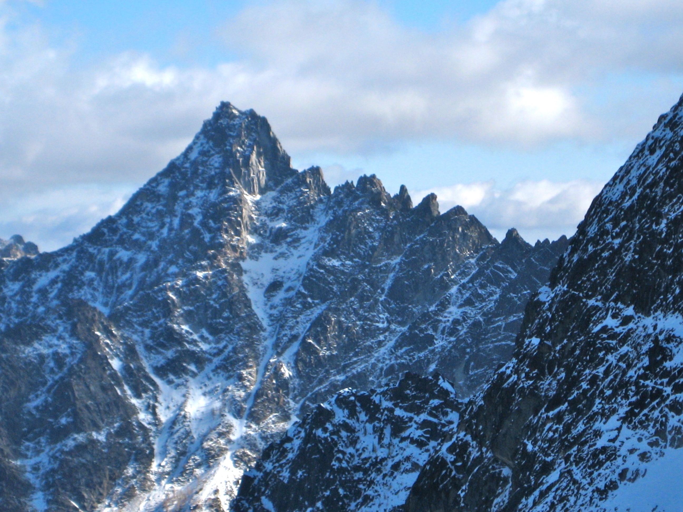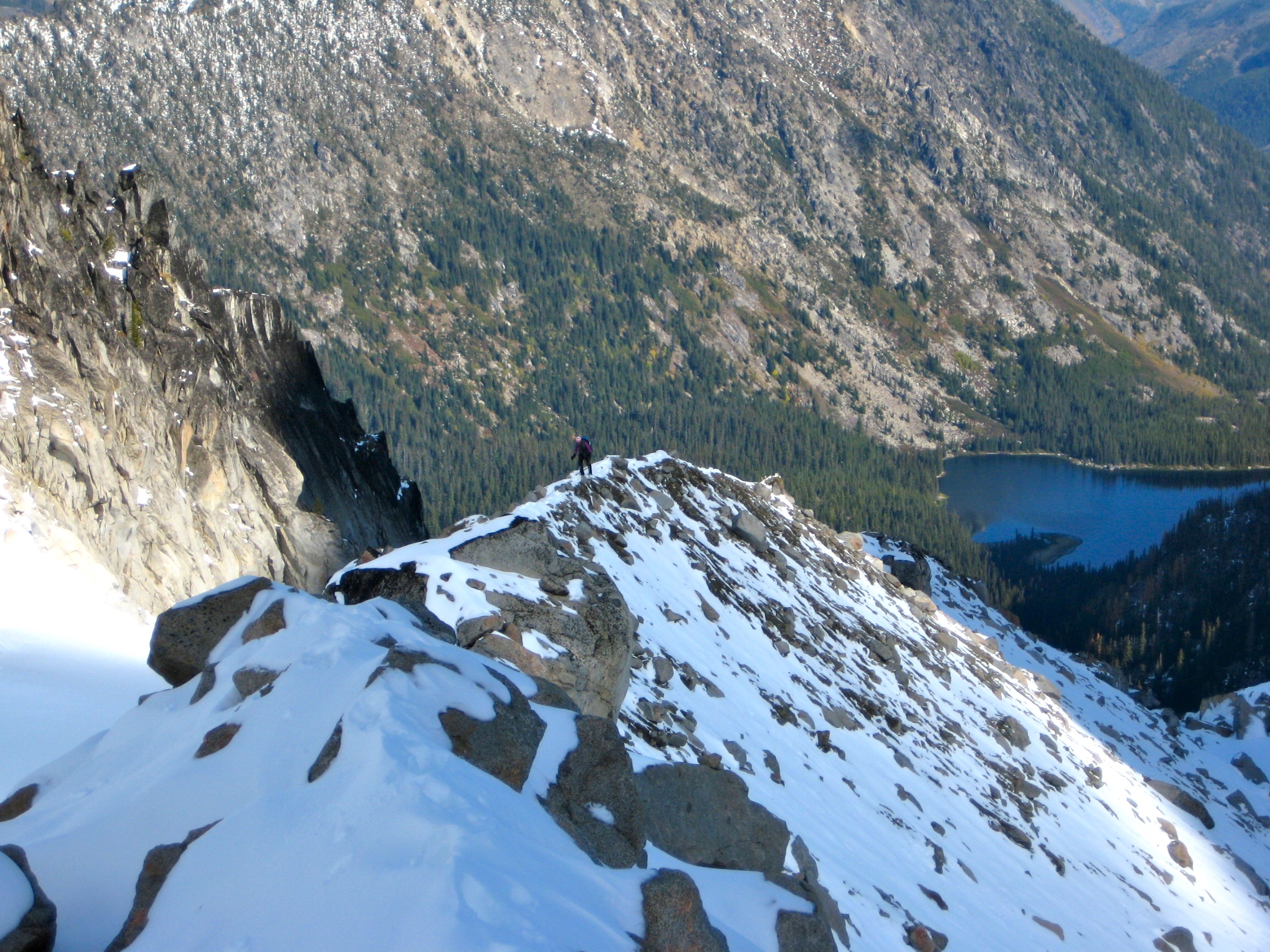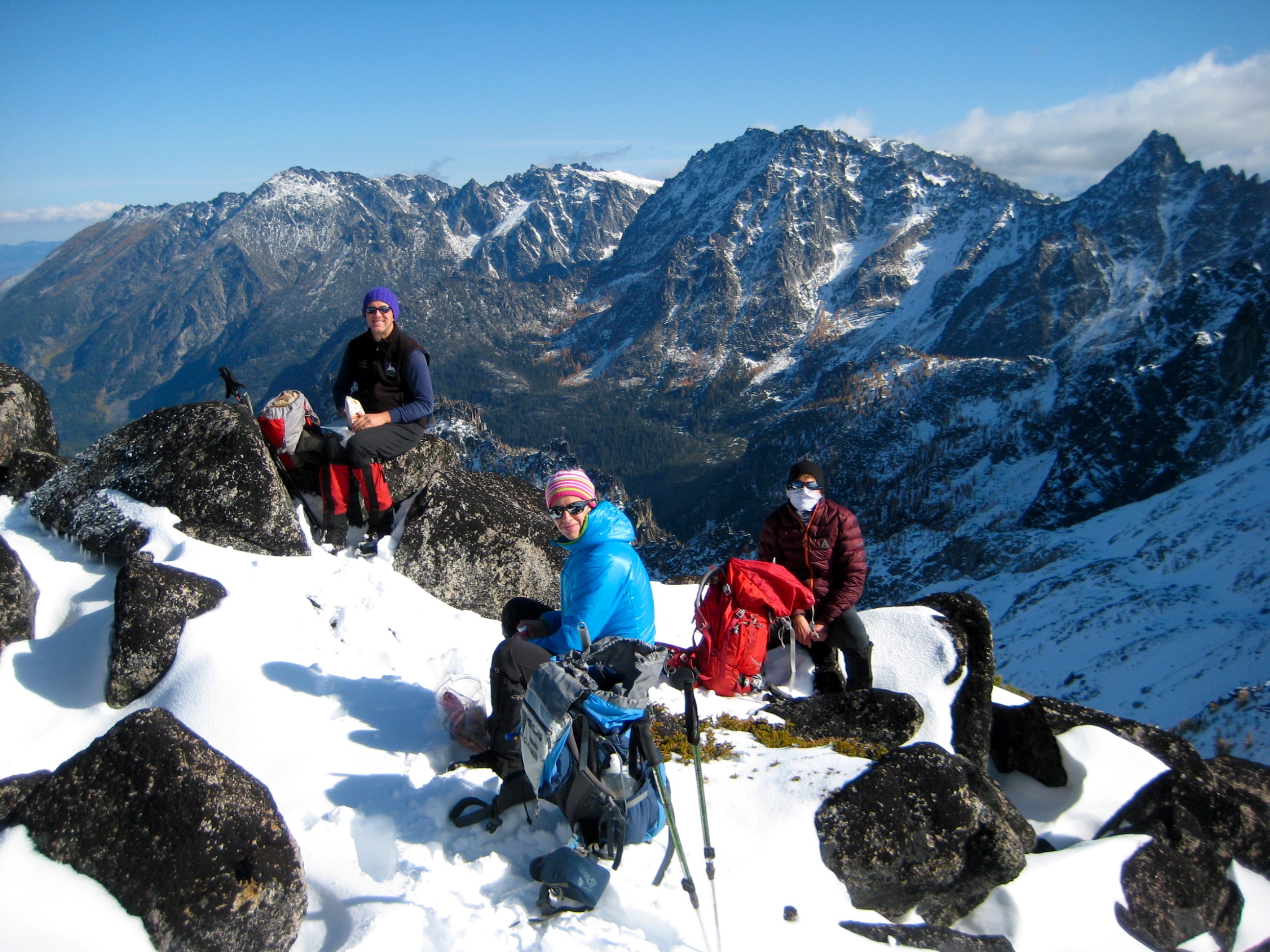 There was about 12 inches of snow at camp, which lay in the shadow of Mt Stuart’s daunting northwest face. Early in the evening, another couple arrived and set up camp down by the lake shore. When their stove malfunctioned, we invited them to join us for dinner. (This act of hospitality on our part was actually a clever ploy to preempt their inevitable complaints about our rowdy camping behavior.)