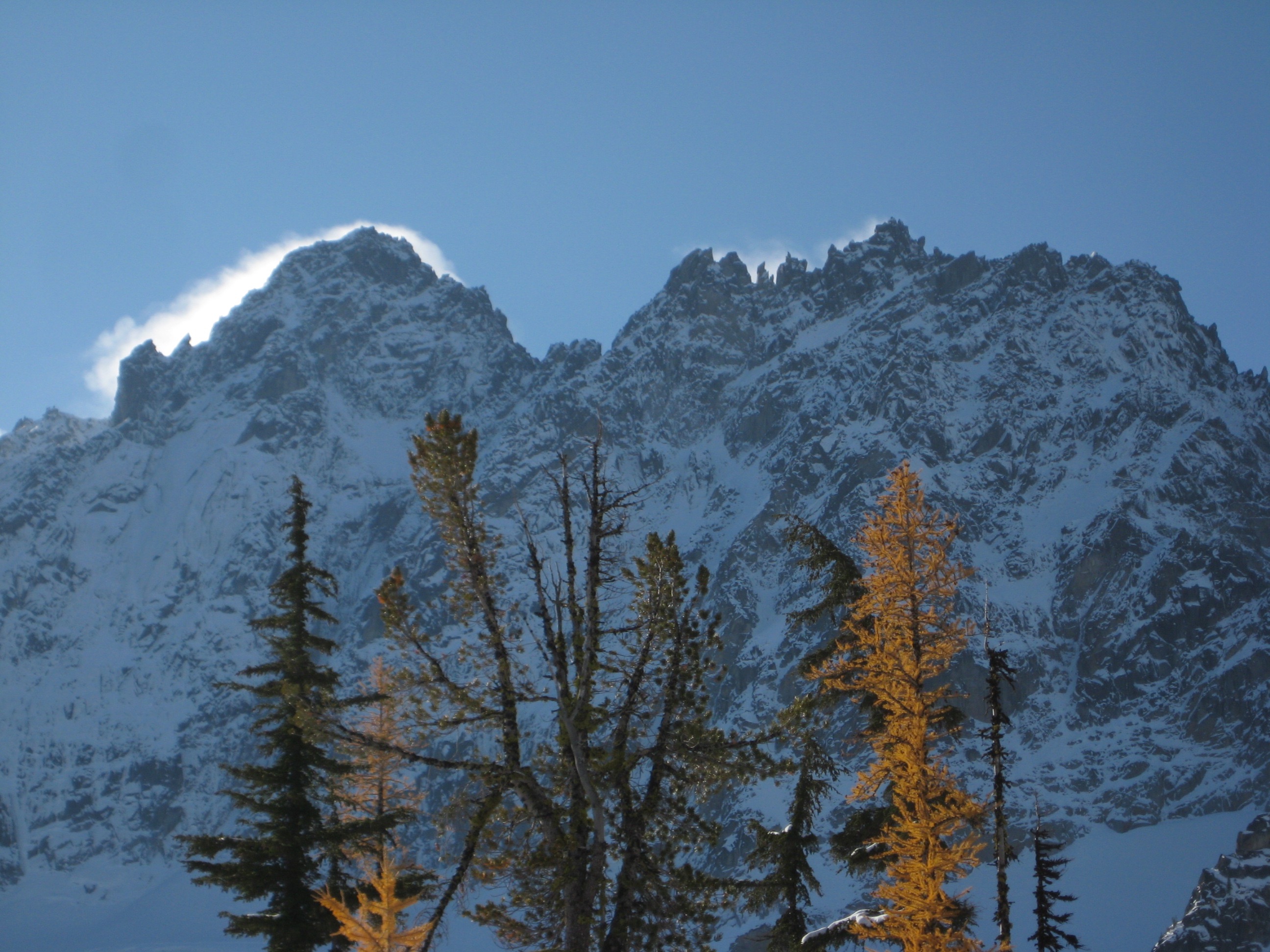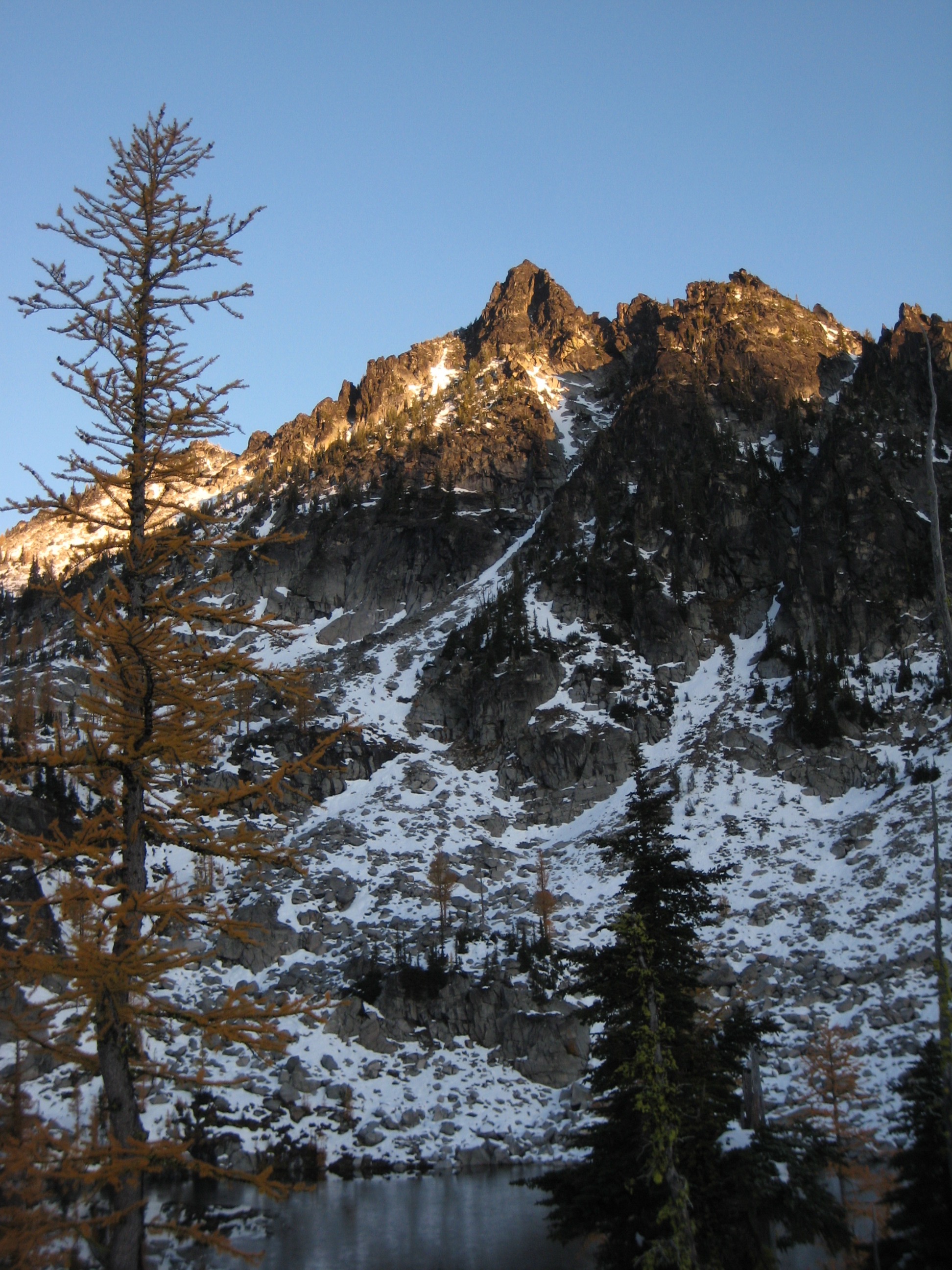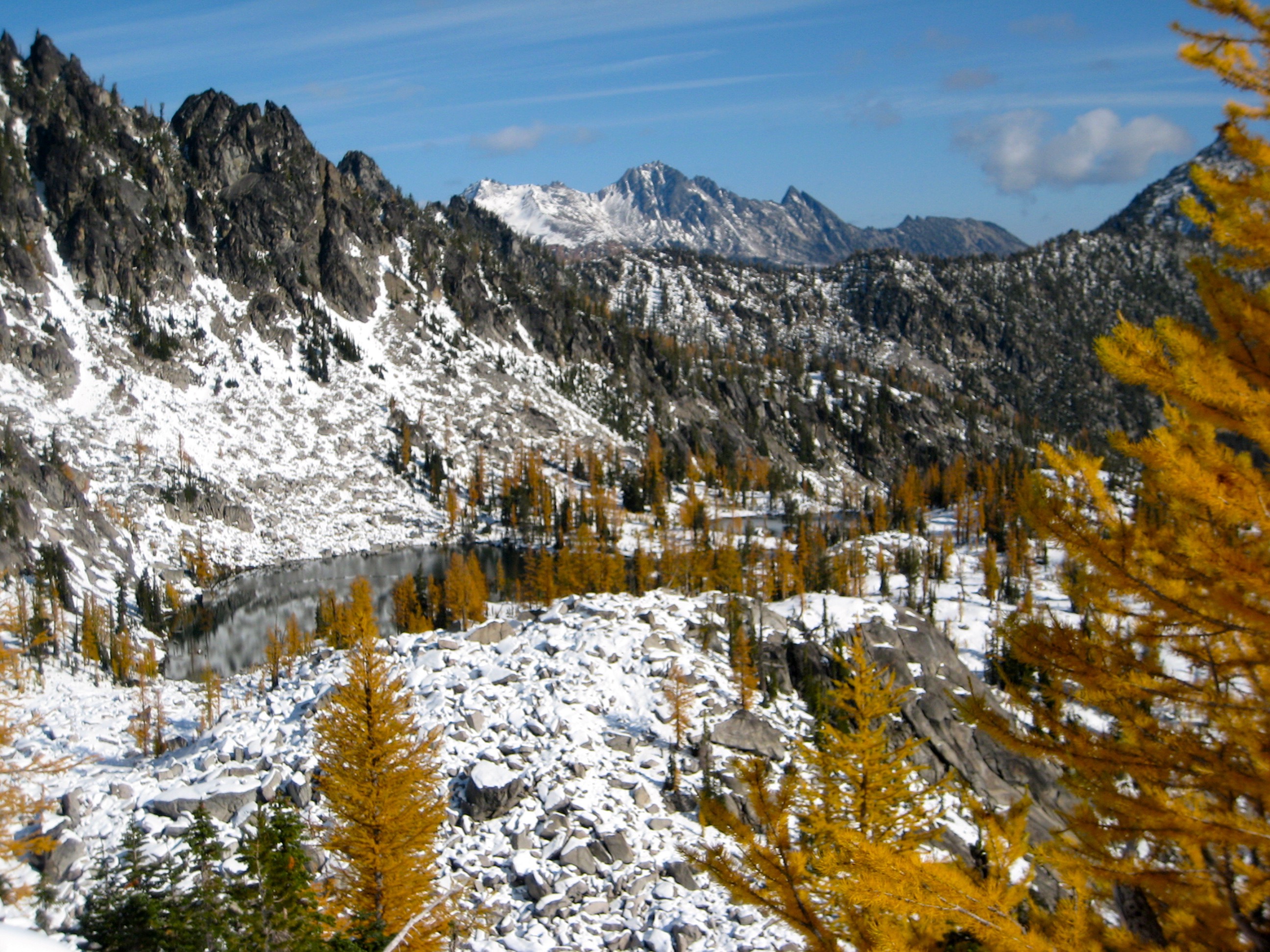 After getting snowed out of the high country a week before, I teamed up with Lisa, Keely, Kevin K, and Maria to find golden larches over this past weekend. We chose Horseshoe Lake near Mt. Stuart as our destination, figuring that there would be relatively little snow, few people, and a good helping of golden larches. We were pretty much correct in all three assumptions. Due to a federal government shut-down, no permits were needed.