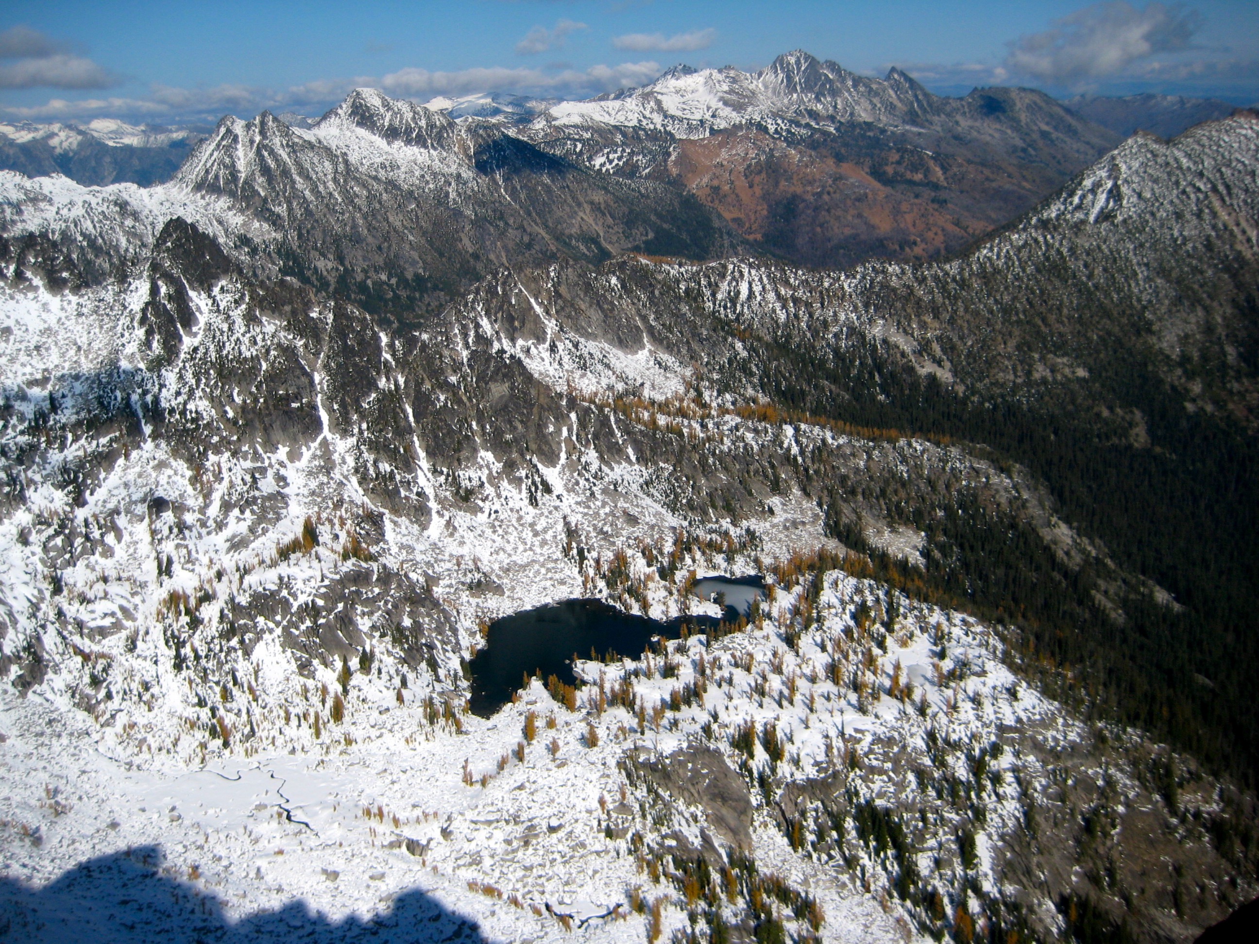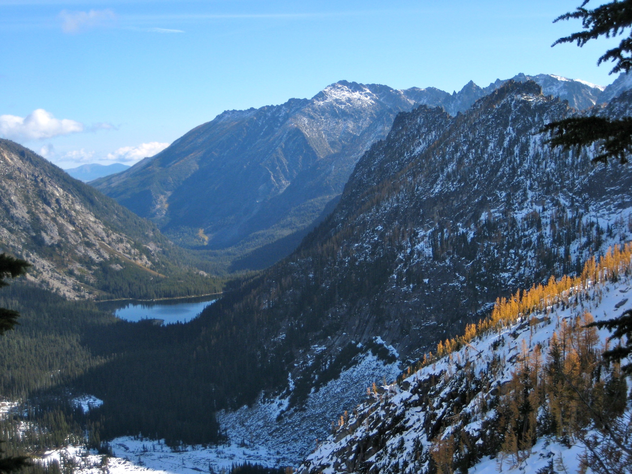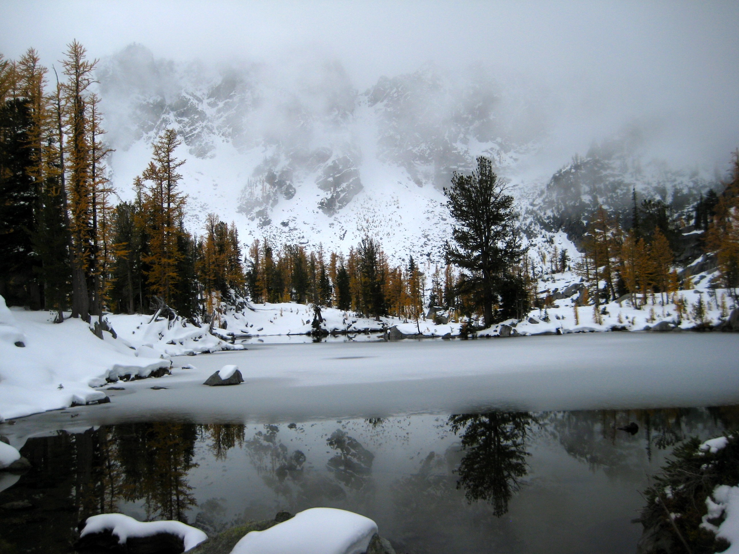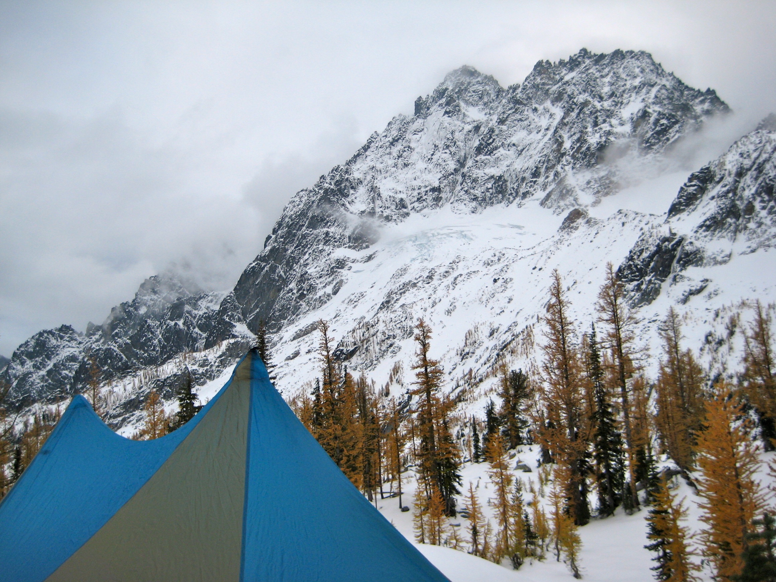 After getting snowed out of the high country a week before, I teamed up with Lisa, Keely, Kevin K, and Maria to find golden larches over this past weekend. We chose Horseshoe Lake near Mt. Stuart as our destination, figuring that there would be relatively little snow, few people, and a good helping of golden larches. We were pretty much correct in all three assumptions. Due to a federal government shut-down, no permits were needed.