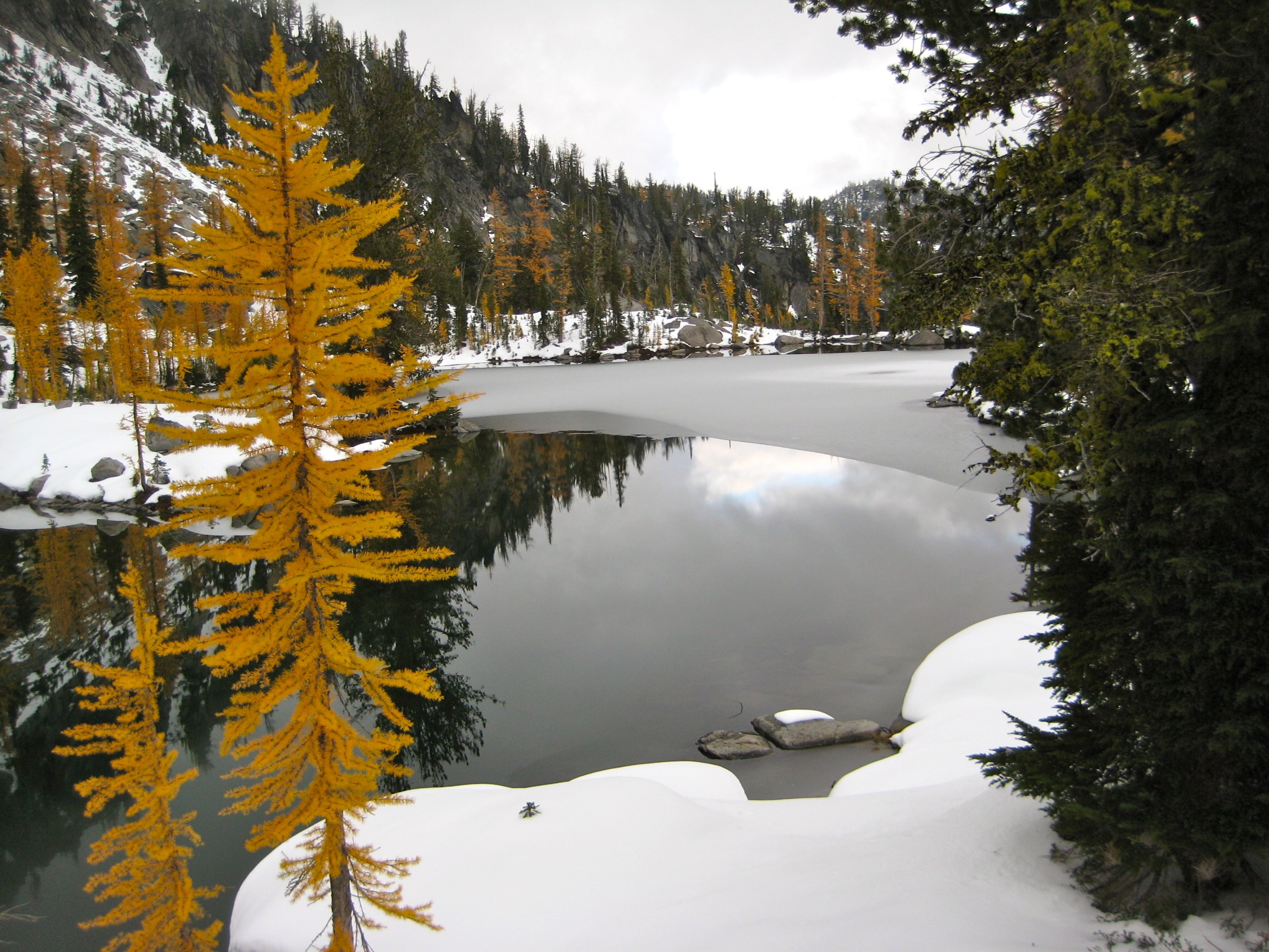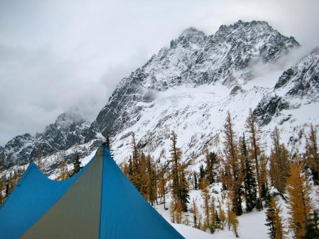 On Saturday, we hiked up to Lake Stuart, then continued up the well-trodden fisherman’s path to Horseshoe Lake. Two shut-down forest rangers were just leaving the lake when we arrived, so we had our pick of campsites. We selected a rocky knoll overlooking the partly frozen-over lake. The larch trees were in full autumn color.