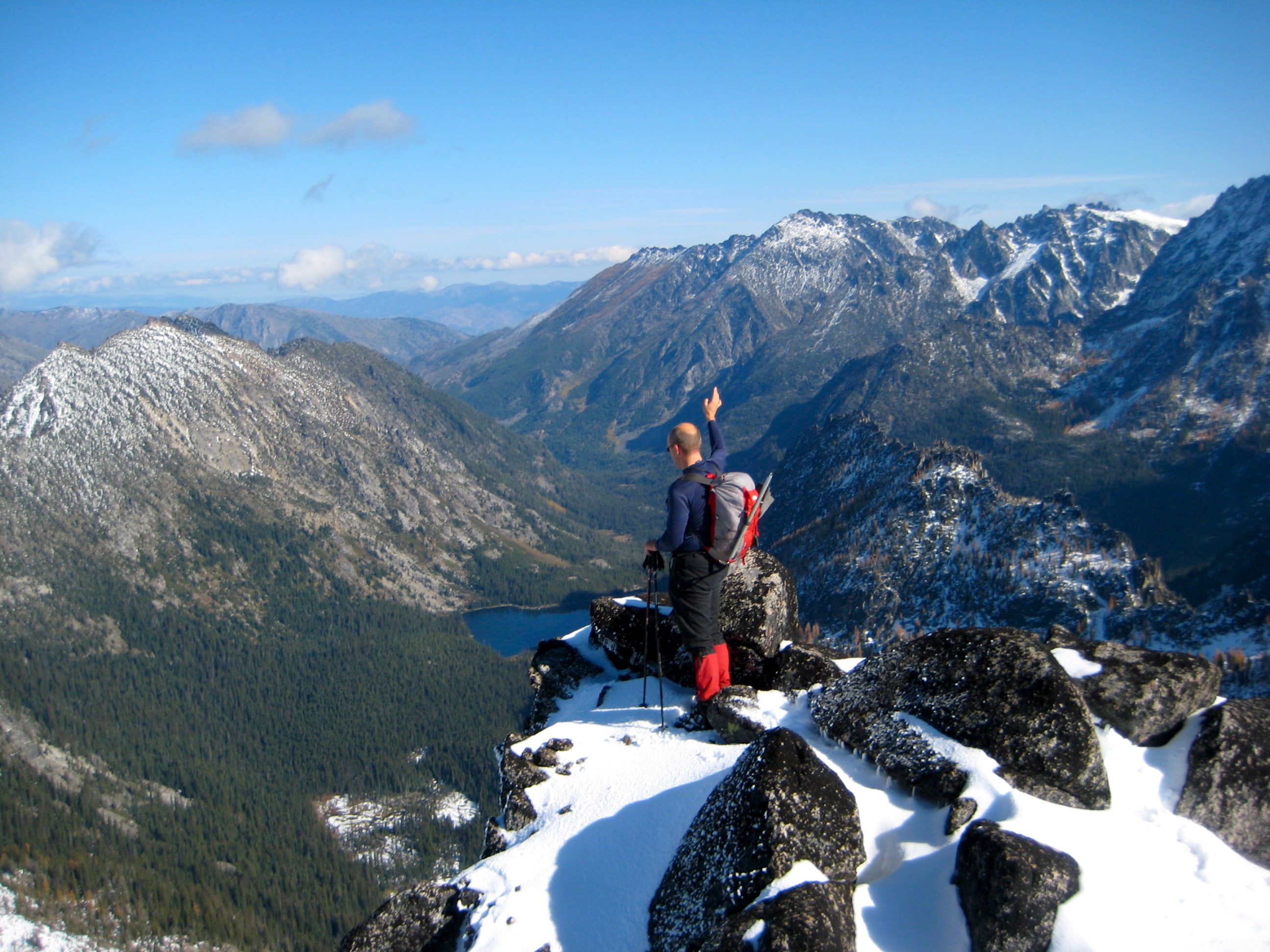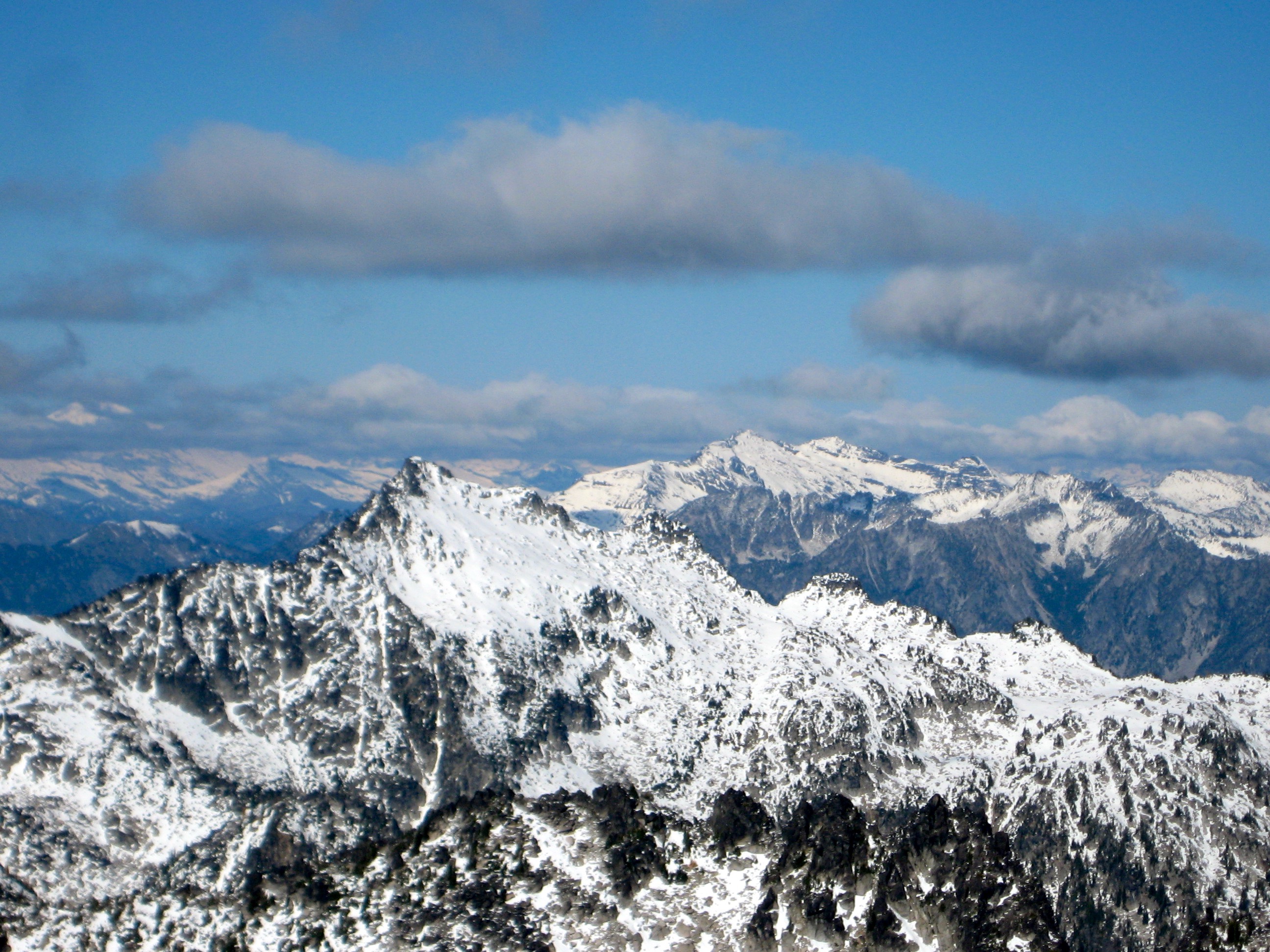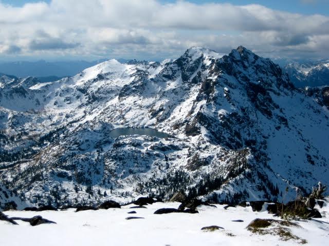From Goat Pass, it was an easy jaunt to the summit of Jackaroo Peak. This excellent vantage point gave views of the Stuart Range to the east, Jack Ridge to the north, Snoqualmie peaks to the west, and several lakes below—all highlighted by a thin blanket of snow.
