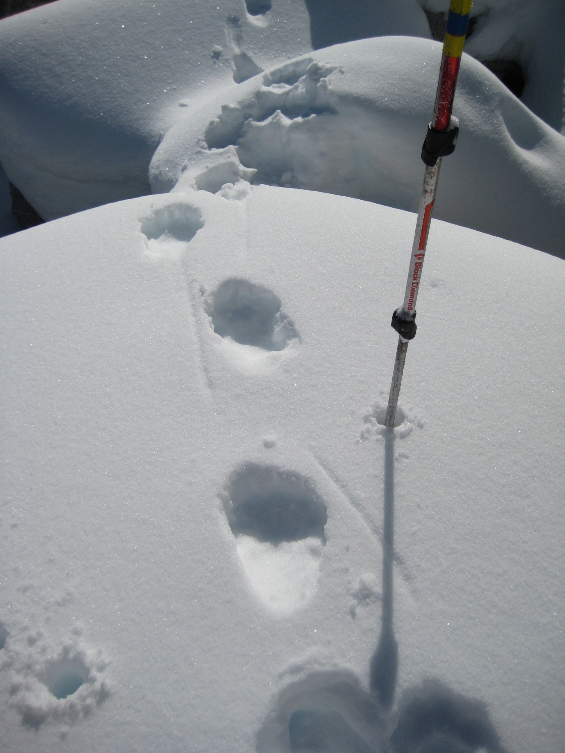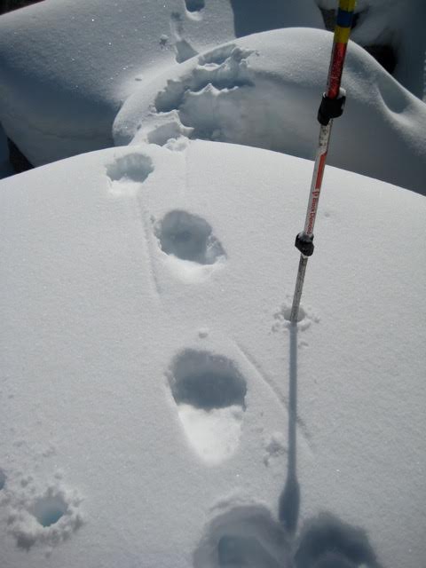 In the midst of the boulderfield, we passed some fresh animal tracks. It appeared to be a cougar stalking a small mammal of some sort. Both seemed to be navigating through the boulders with more deftness than we were.