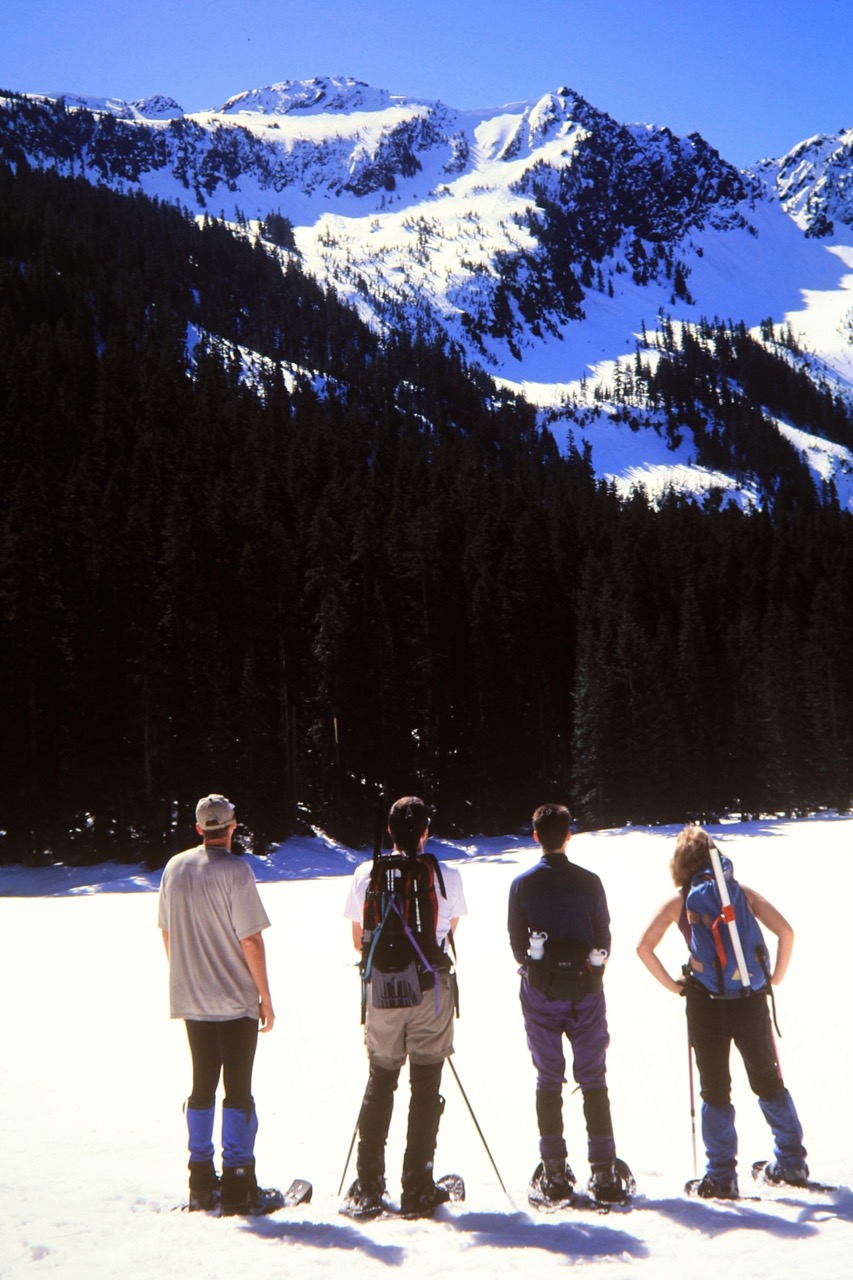 Laura, Bob, Carolyn, and Greg joined me on a springtime snowshoe trip to Jim Hill Mountain in the Upper Icicle Mountains near Stevens Pass. We parked near the Lanham Lake Trailhead and headed up through deep forest alongside Lanham Creek. Upon reaching Lanham Lake (1.3 hours + 1200 feet from TH), we got a nice view of our objective peak.
