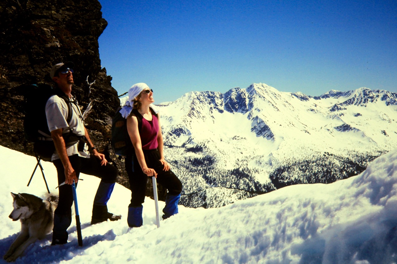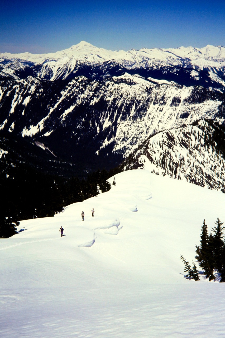 At the lake, we turned east and snowshoed up a steep, forested hillslope to gain a 5500-foot saddle in the long, sweeping north ridge of Jim Hill Mountain. We then continued directly up the ridge crest, which overlooks Henry Creek Bowl—a favorite haunt of backcountry skiers.