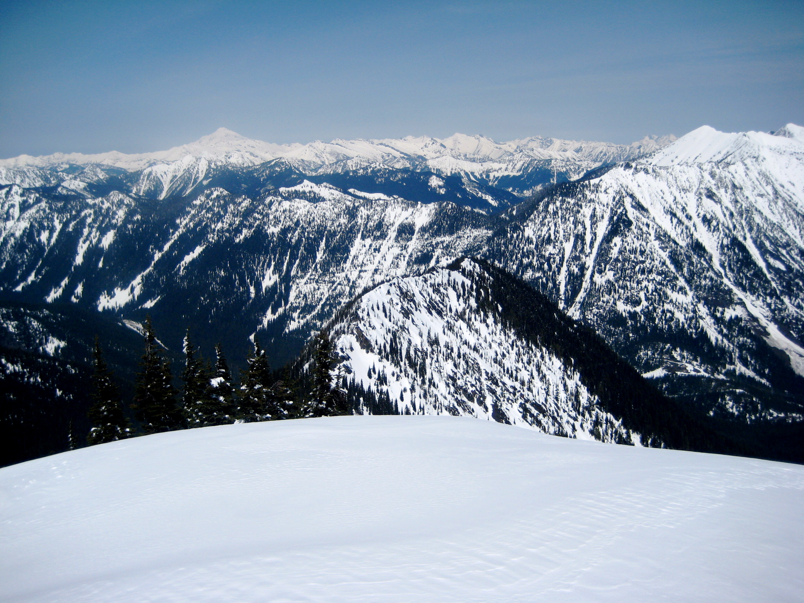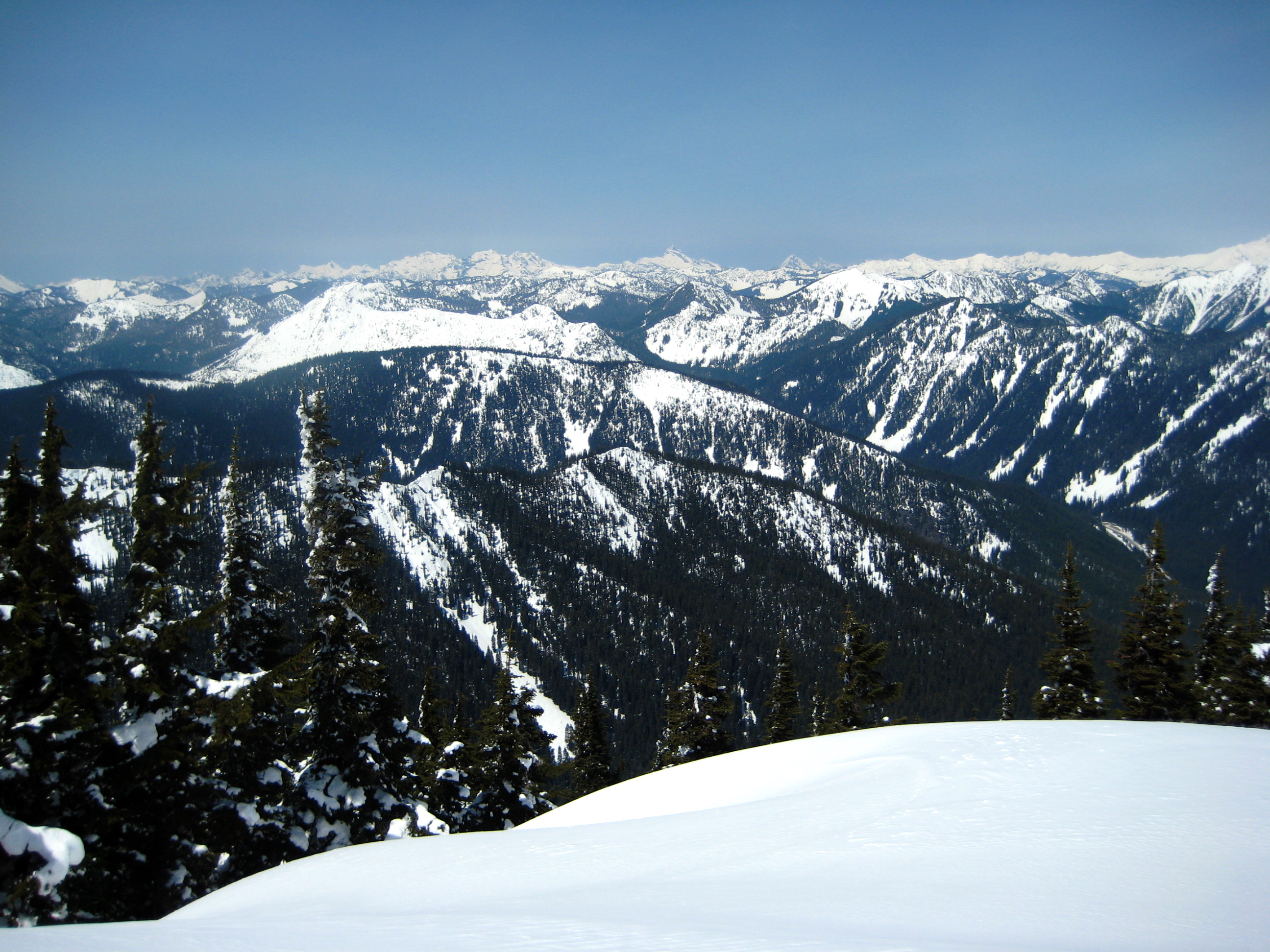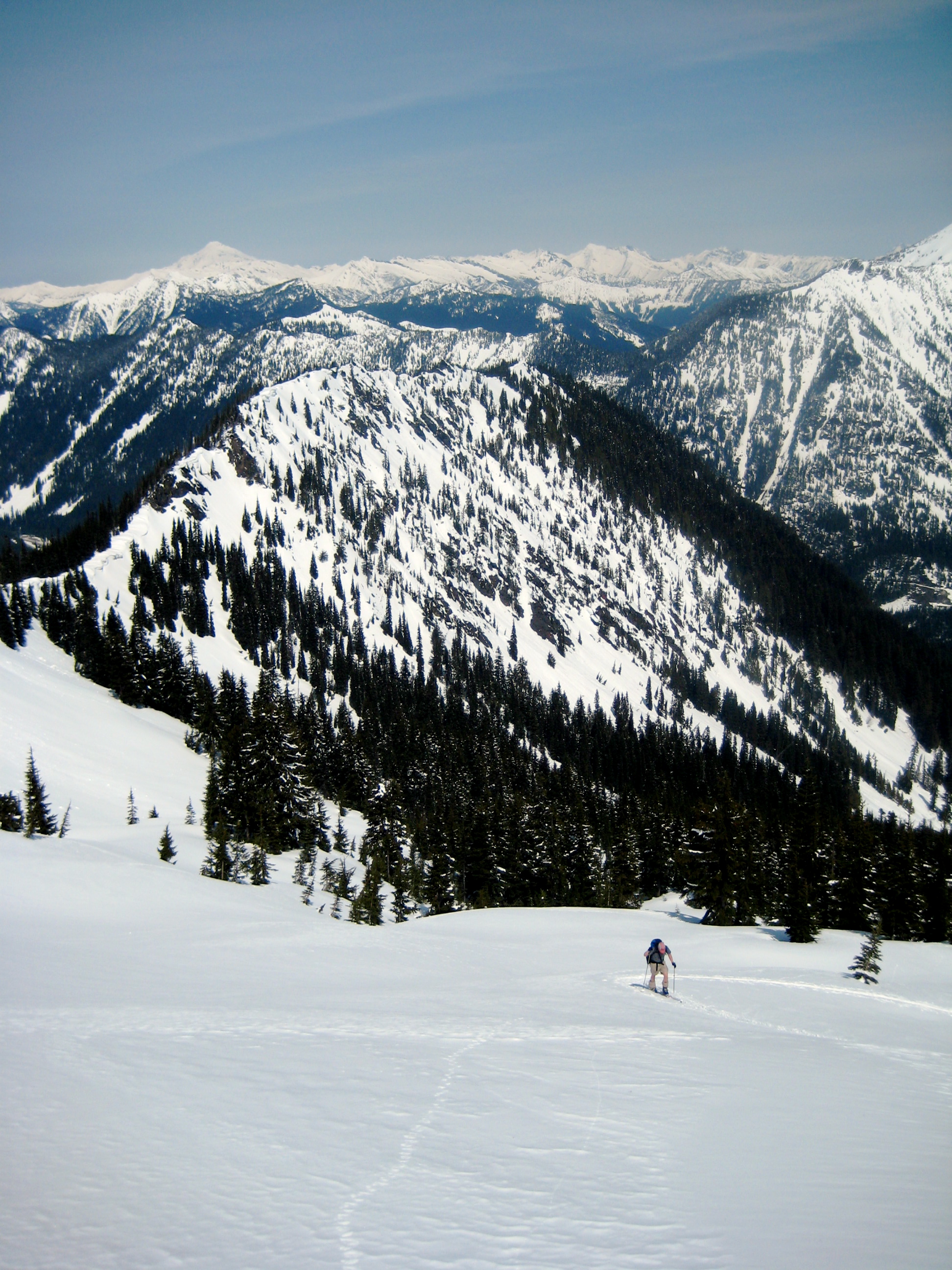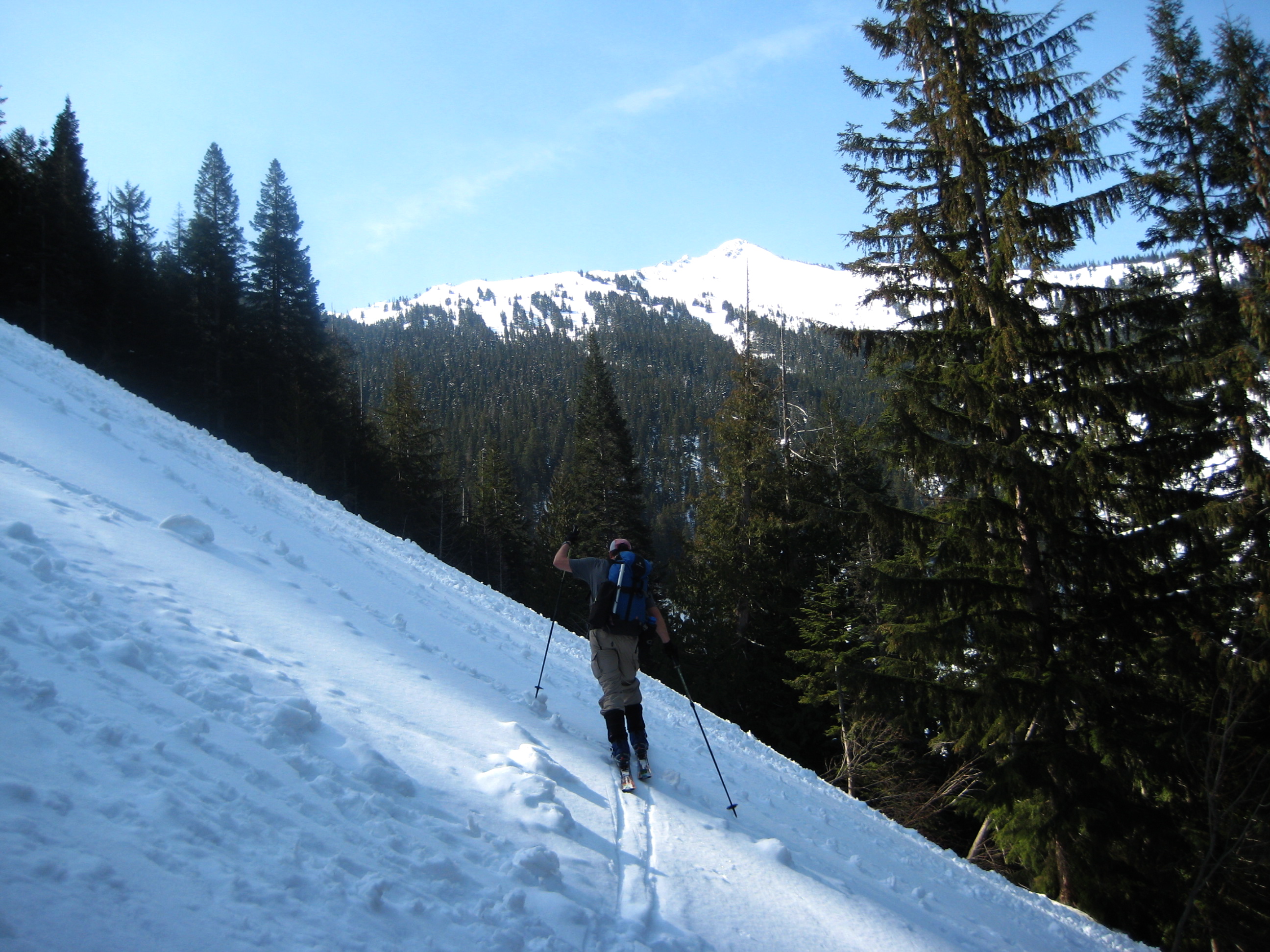 We skied up the Henry Creek logging road about 3/4 mile, crossing Henry Creek along the way, then cut up through steep but open forest on crusty snow. Several hundred feet uphill, we intersected the road near its terminus. (It probably would have been faster to simply stay on the road the whole way.) A dicey ski traverse on more steep, rock-hard snow led us down to a level part of the creek (at 3800 feet)—and an encounter with a dozen other skiers and snowshoers. We continued upward en masse for about 2500 vertical feet, first through sparse forest then up open slopes, to the scenic north ridge of Jim Hill Mountain.