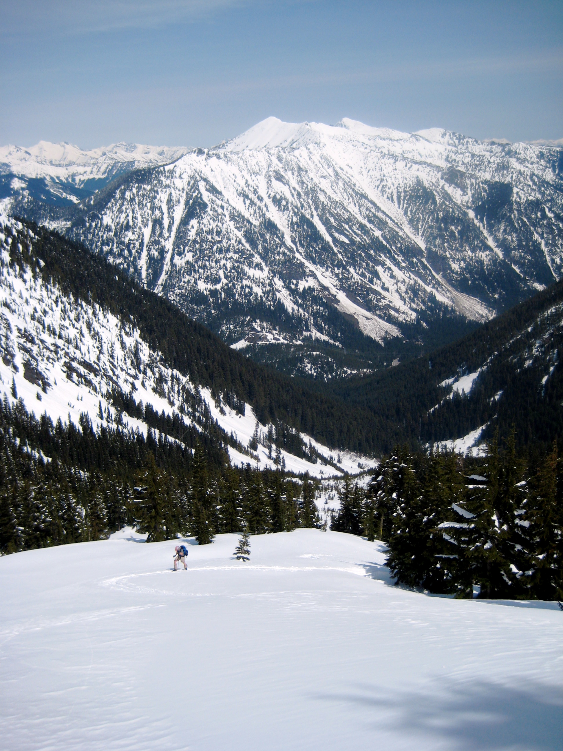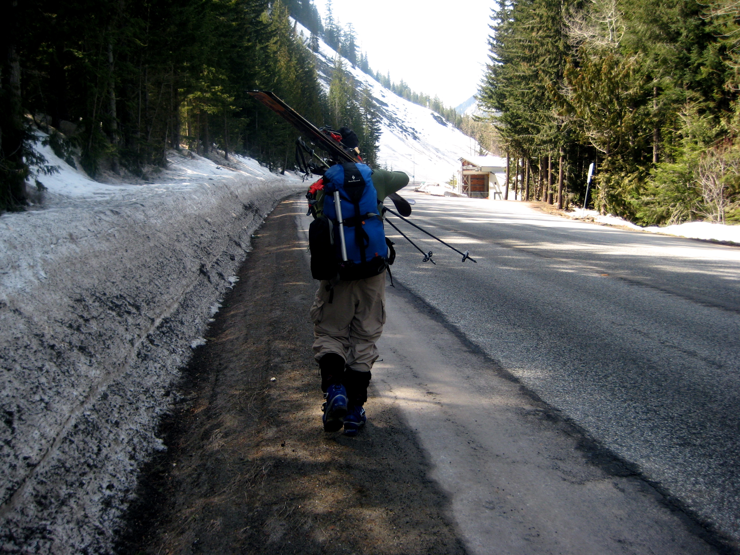 We were sad to reach the creek at 3800 feet. We were even sadder about having to screetch from there down through icy, lumpy snow in dense forest. Eventually, we popped out at the logging road and had an easy glide back to the highway.