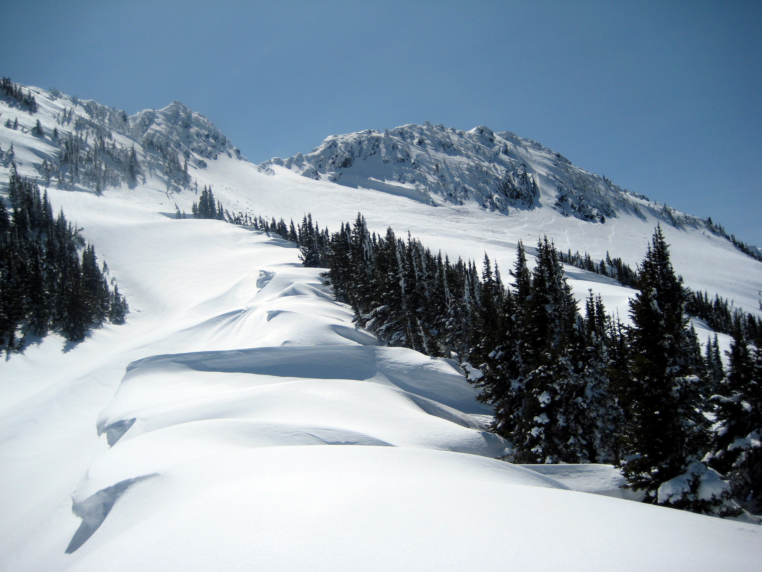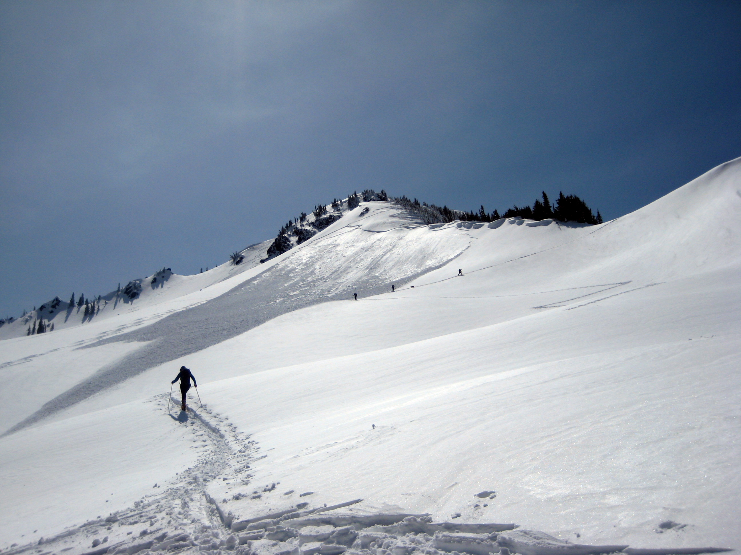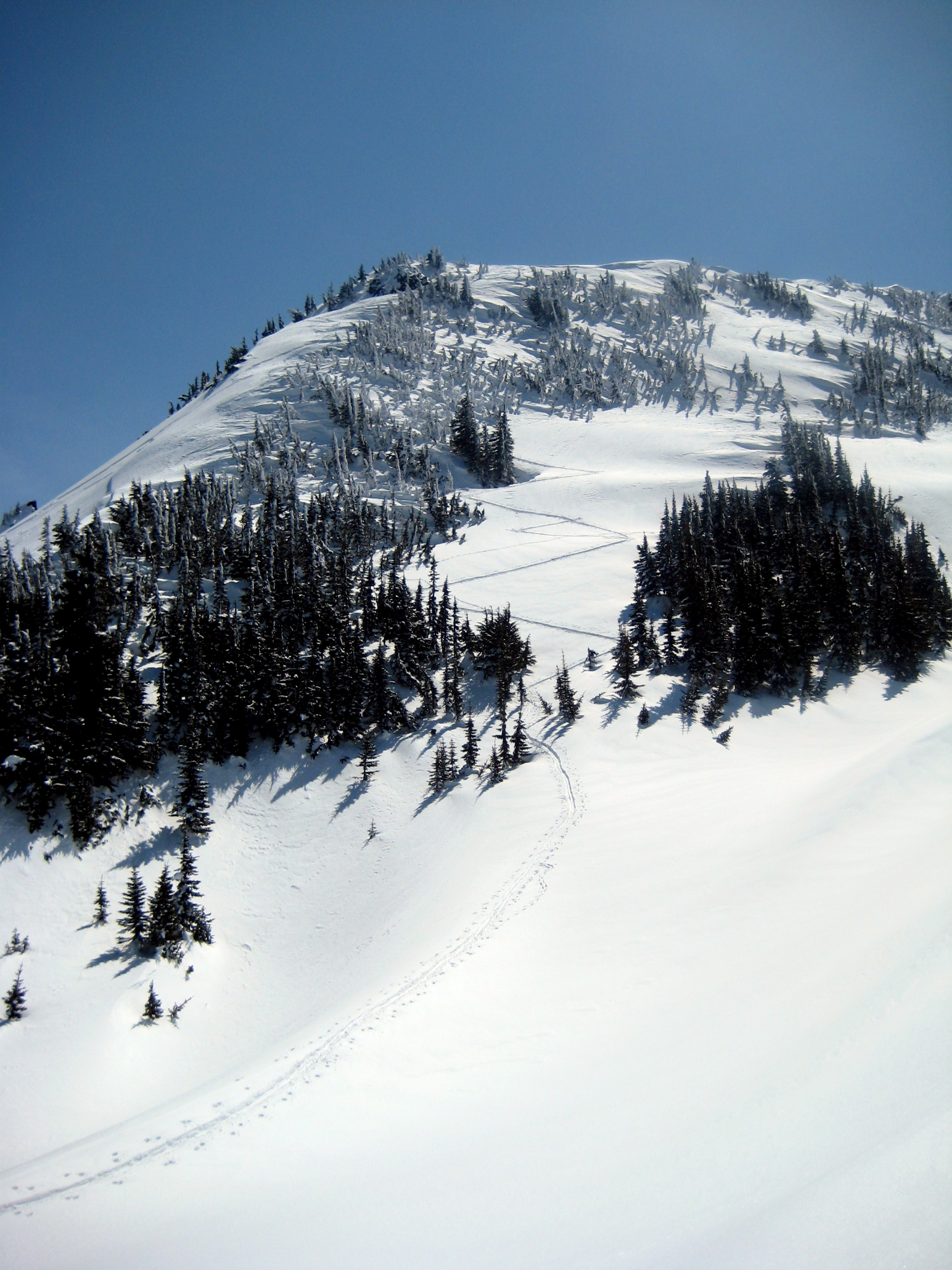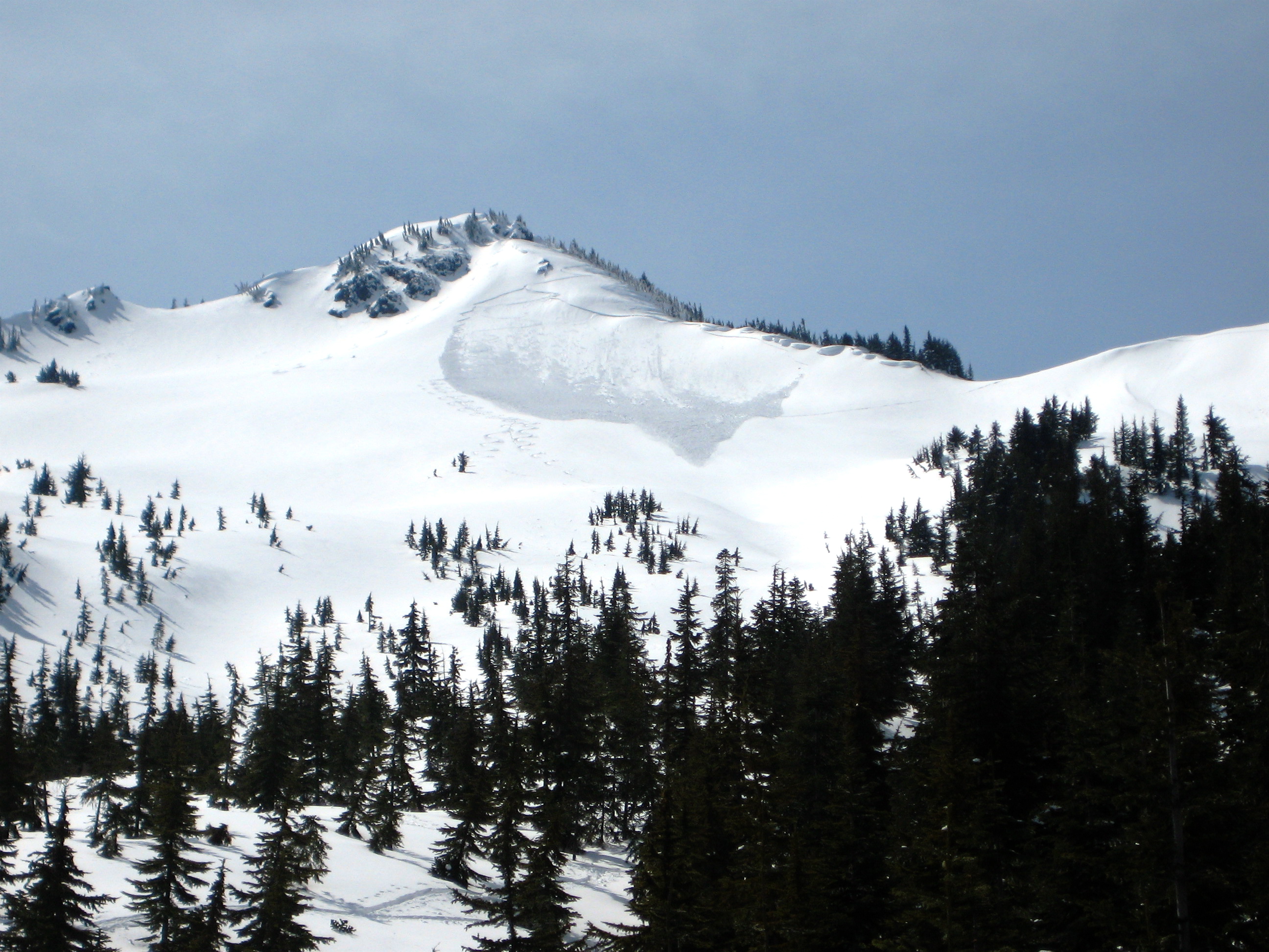 Our uptrack stayed right of a large avalanche that spanned the entire upper north face of the false (NE) summit. We inferred that the avy probably occurred just a day before!