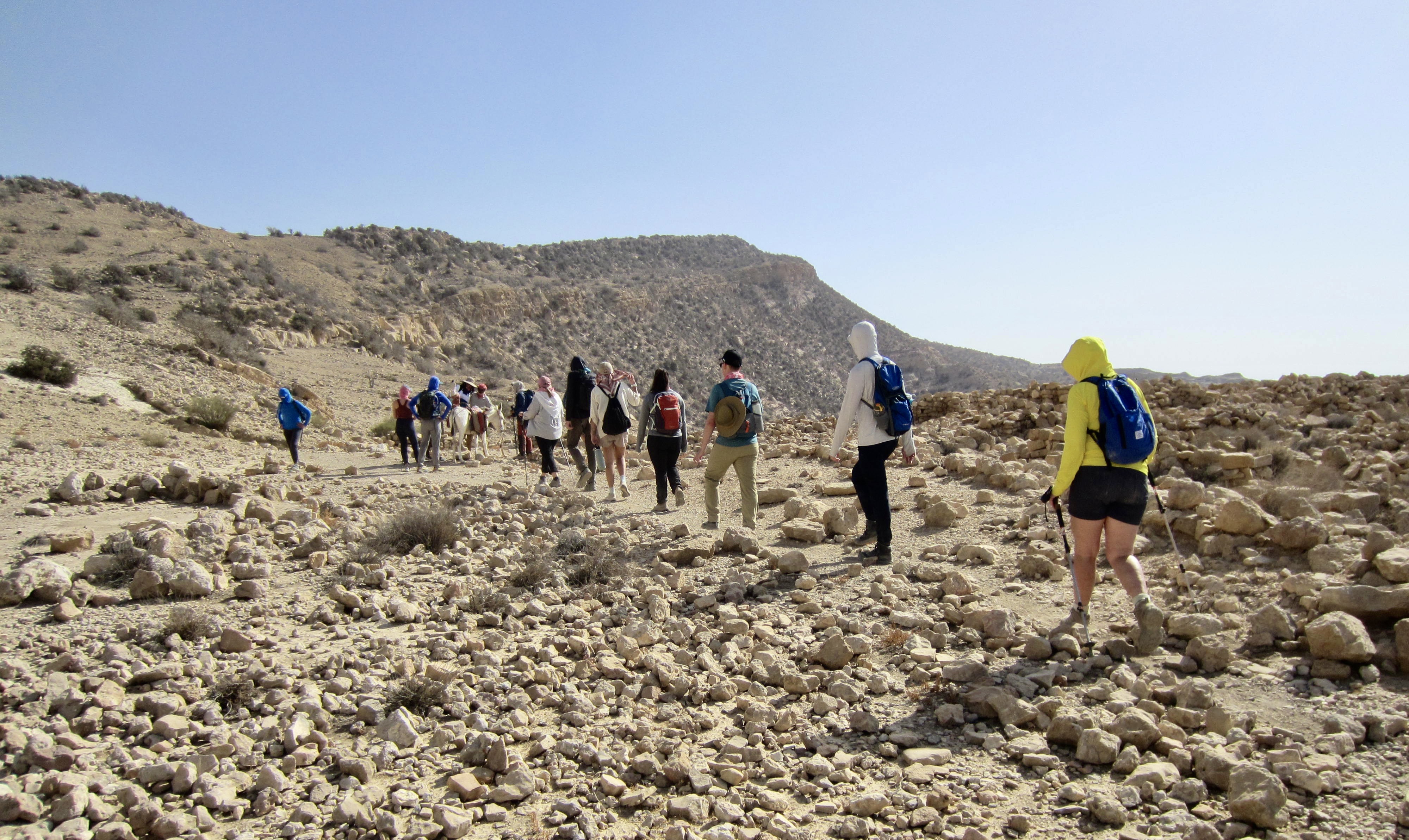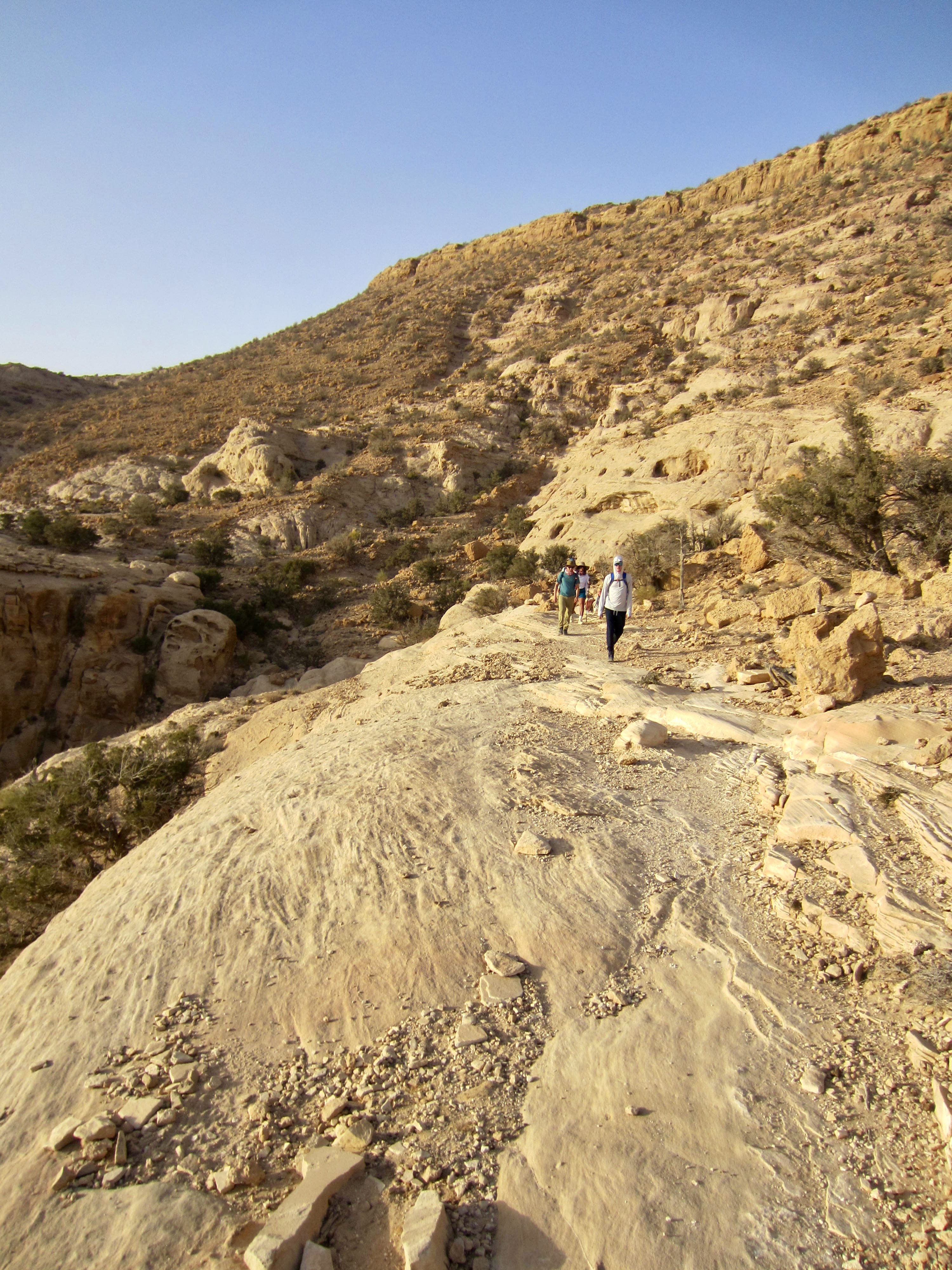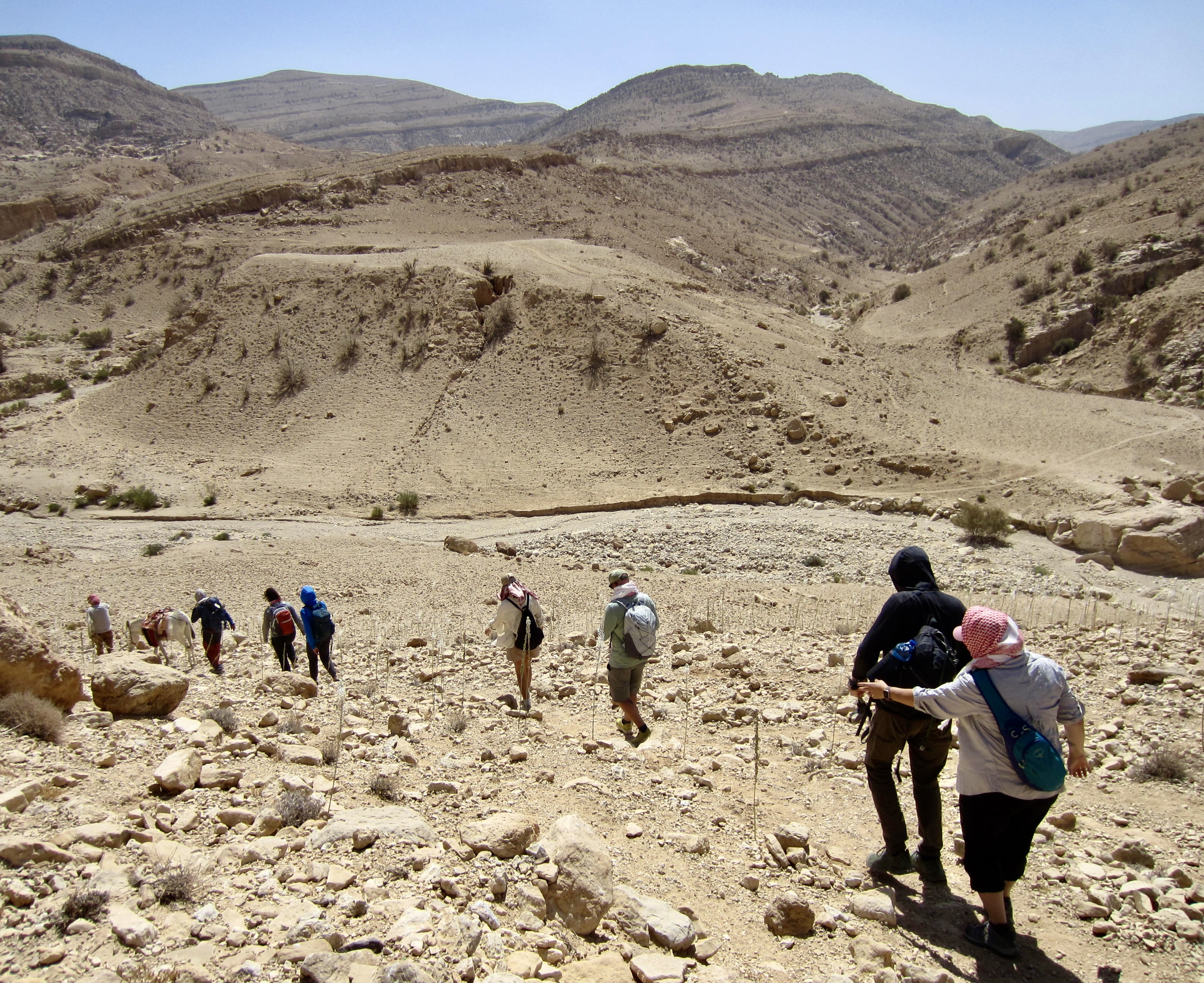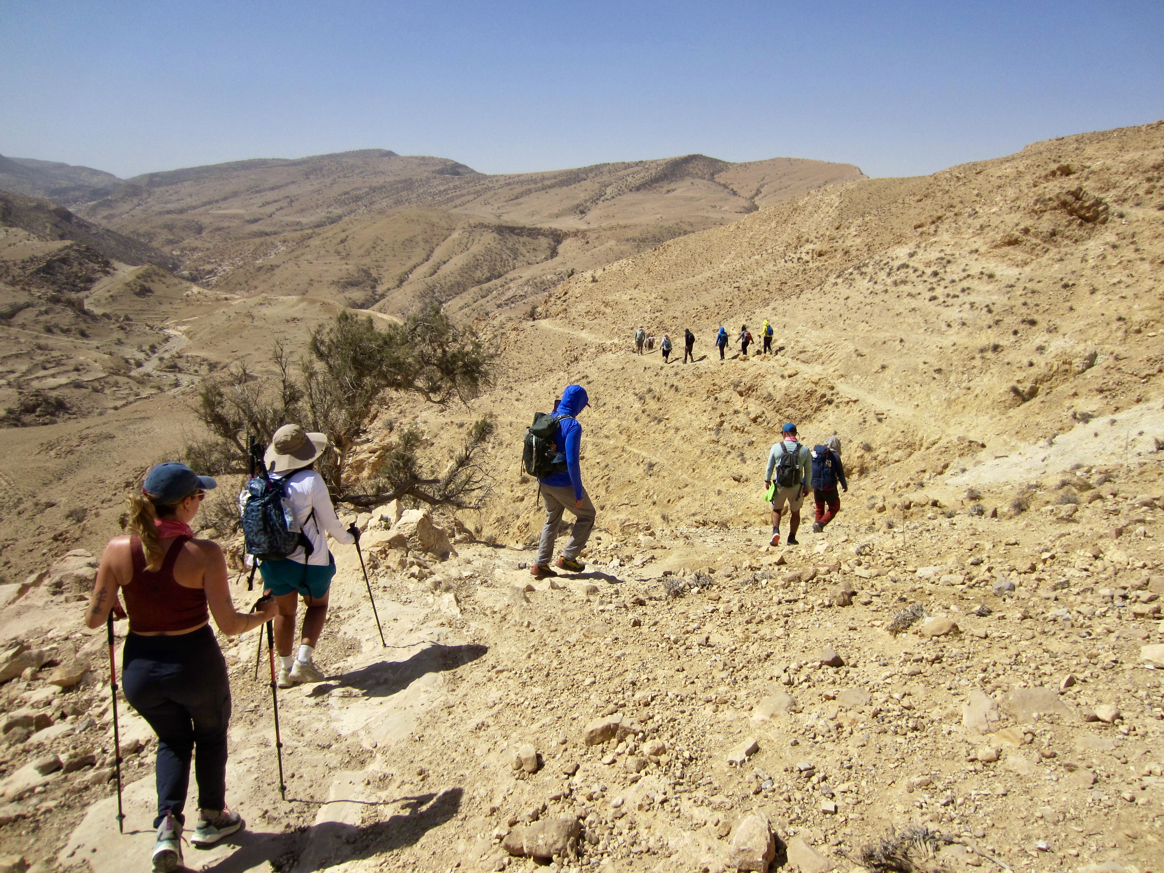 For the rest of the afternoon, we followed the “flat” trail over a series of ribs and ridges (Mahmoud explained that flat is the Jordanian word for “many ups and downs”). We soon reached the highest point of our entire traverse on the flank of Jebel Saffahah, or Saffahah Hill. Relentless sunshine and lack of shade made these numerous undulations feel much harder.