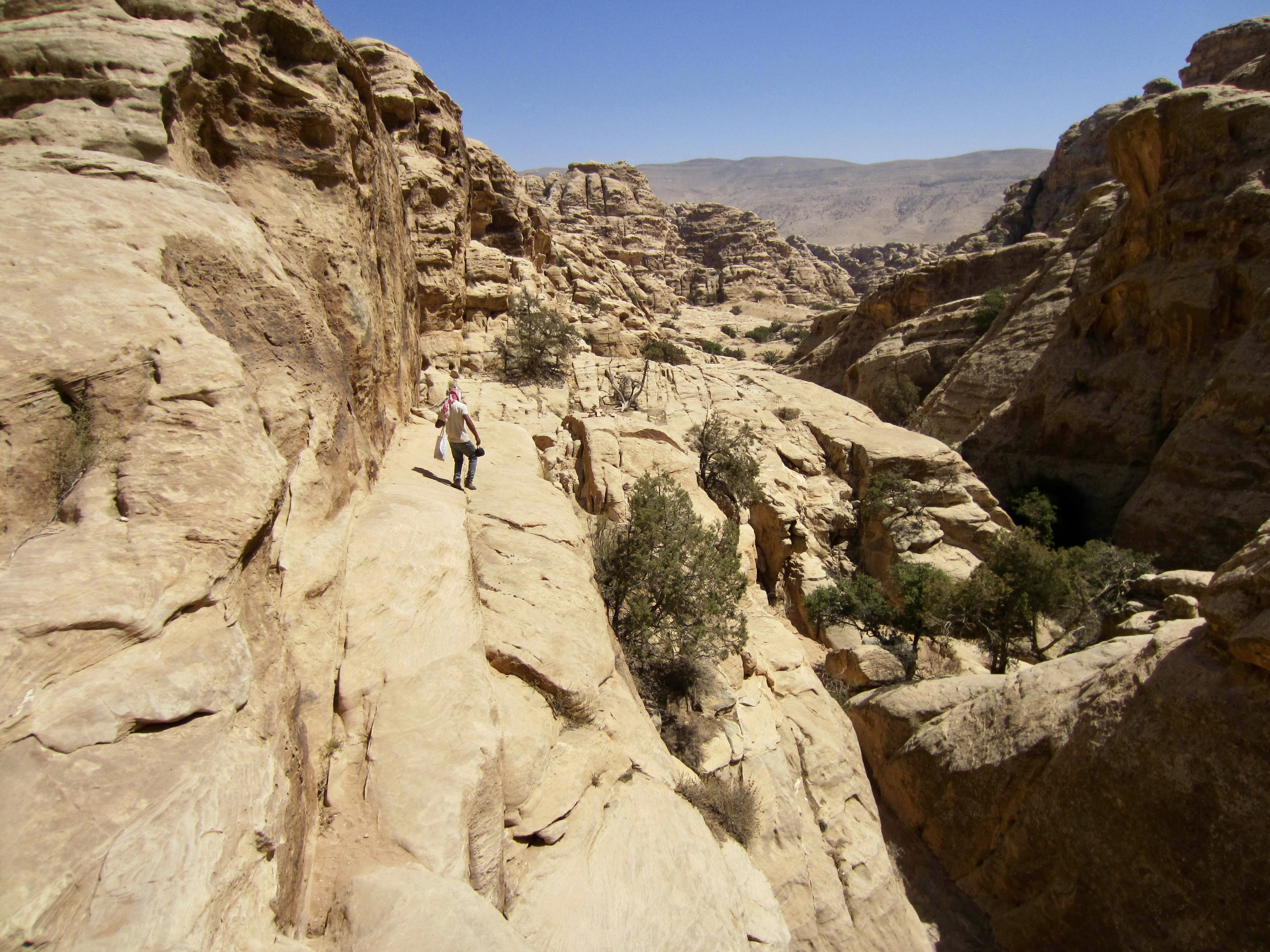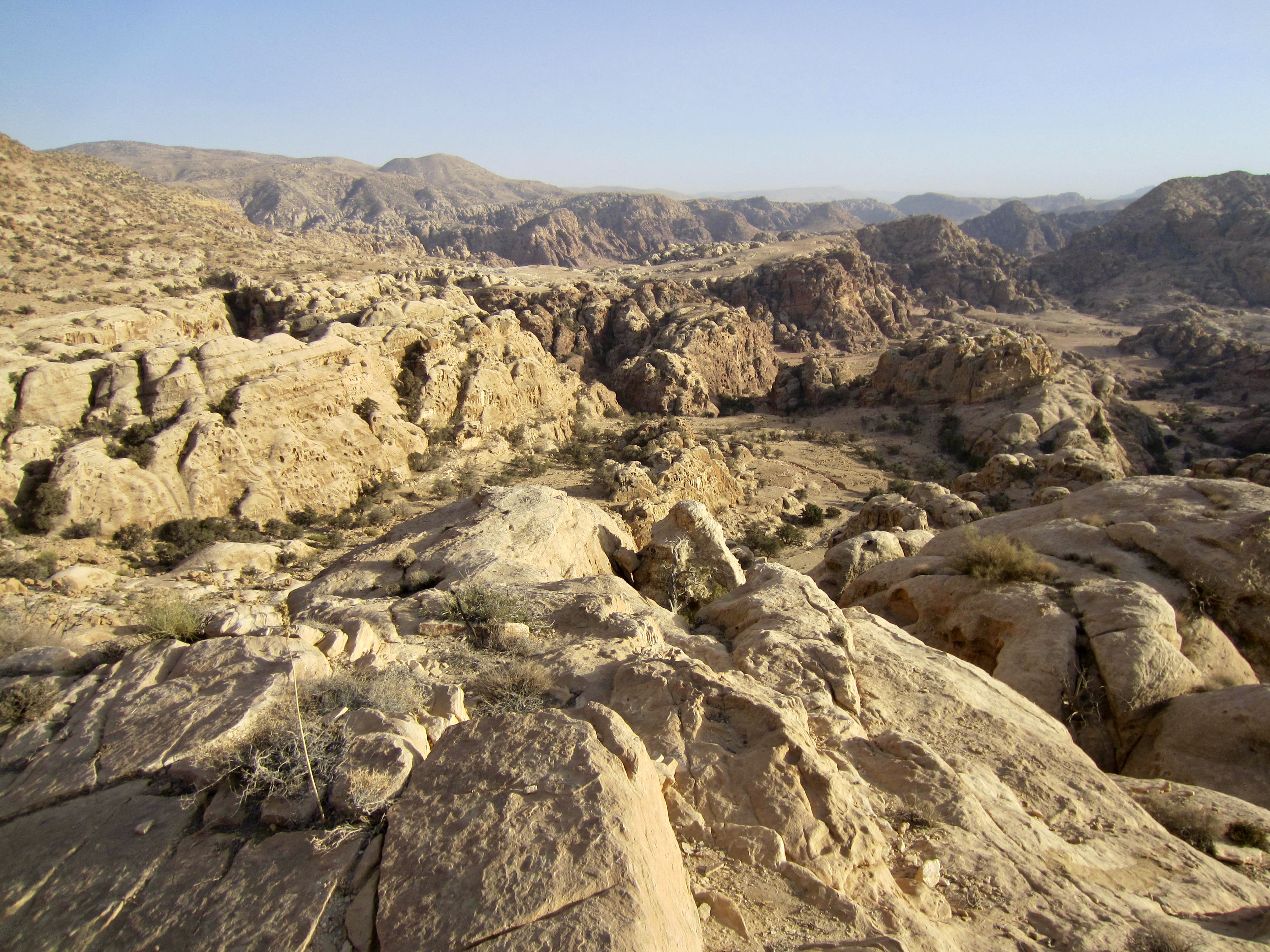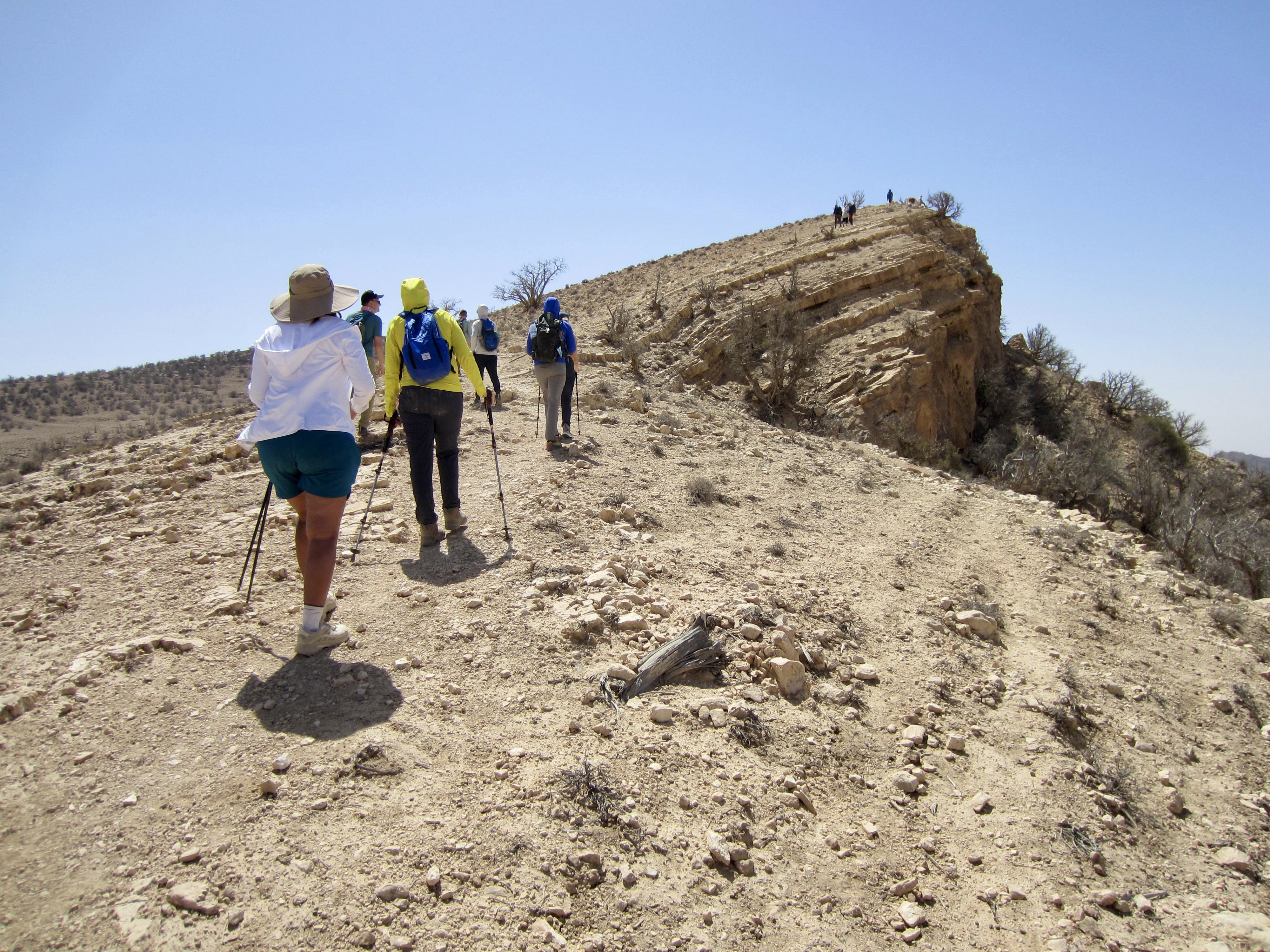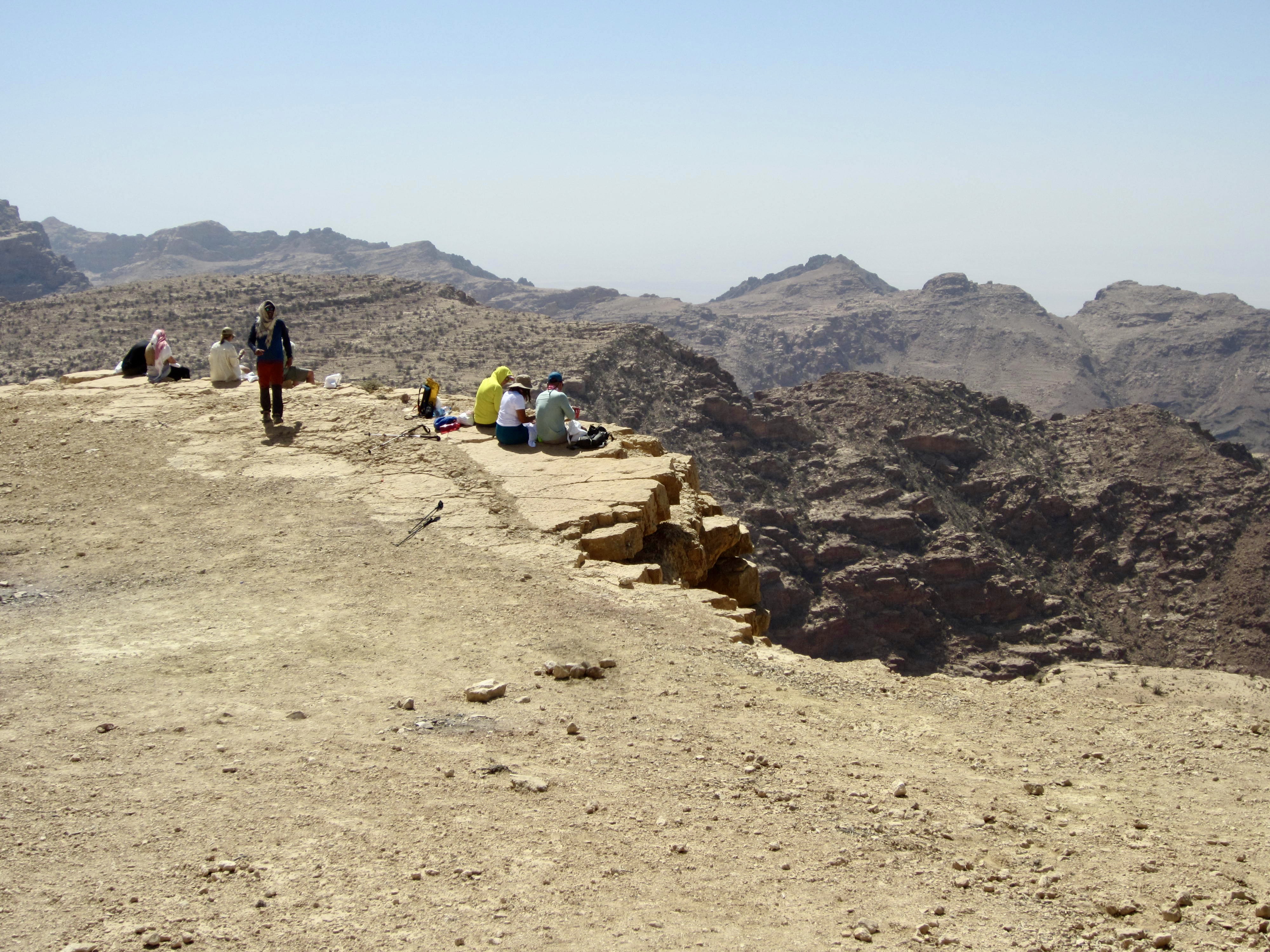 For the rest of the afternoon, we followed the “flat” trail over a series of ribs and ridges (Mahmoud explained that flat is the Jordanian word for “many ups and downs”). We soon reached the highest point of our entire traverse on the flank of Jebel Saffahah, or Saffahah Hill. Relentless sunshine and lack of shade made these numerous undulations feel much harder.