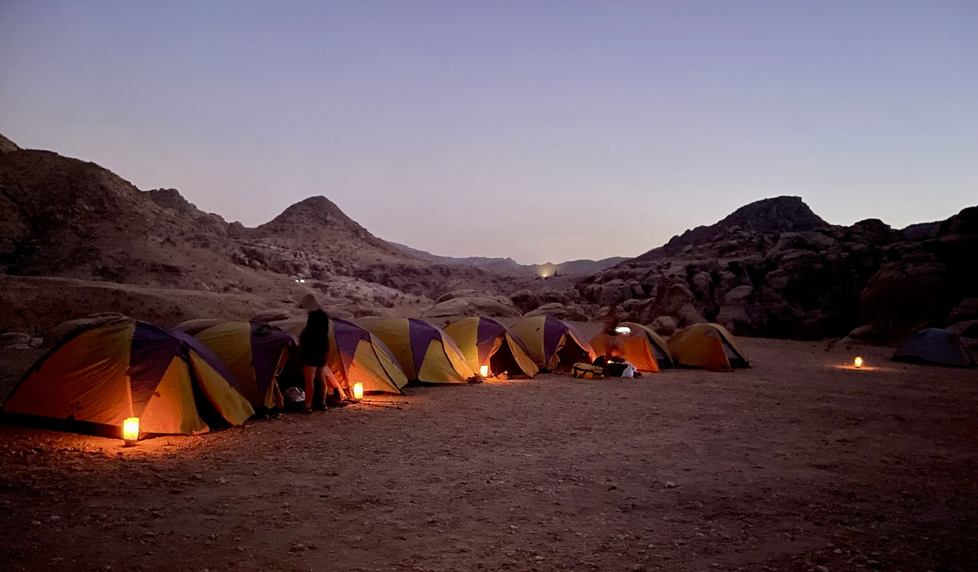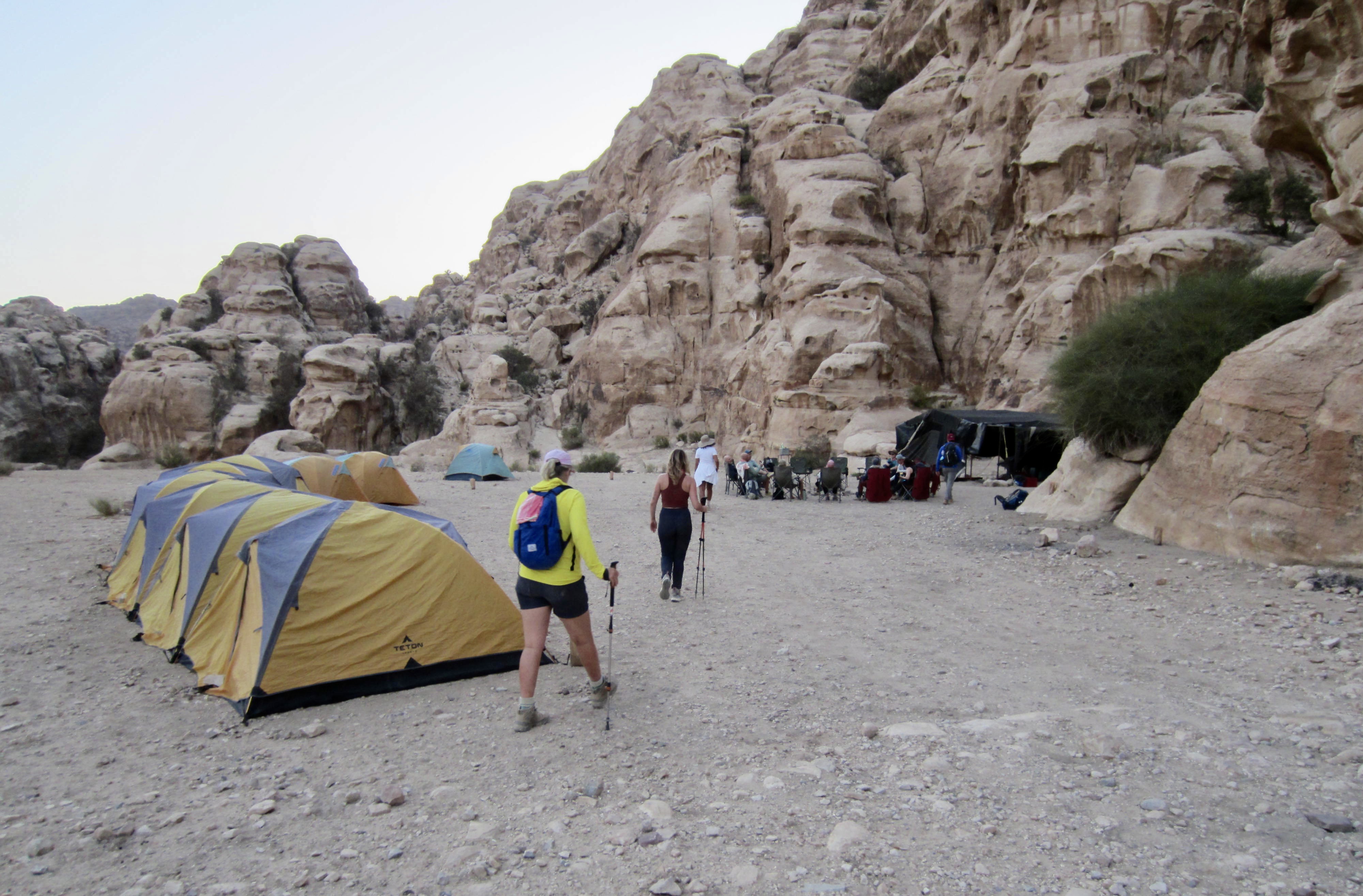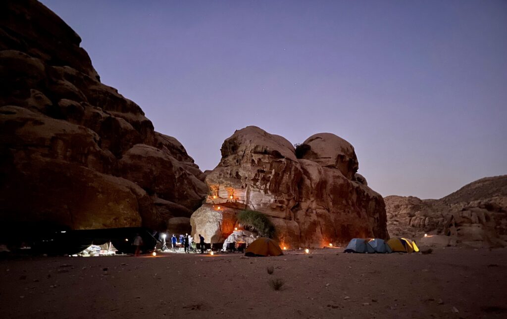 In early evening, we arrived at Ghbour Whedat Wild Camp (7.2 hours from starting trailhead). This comfortable backcountry campsite, tucked up against a sandstone wall, comprises a large communal tent and a row of personal tents. The Experience Jordan Adventures staff had previously arrived with our luggage, set up a shower and latrine, positioned candles around the site, and cooked a tasty Jordanian dinner. We all sat in a circle and recounted the day’s events while eating.