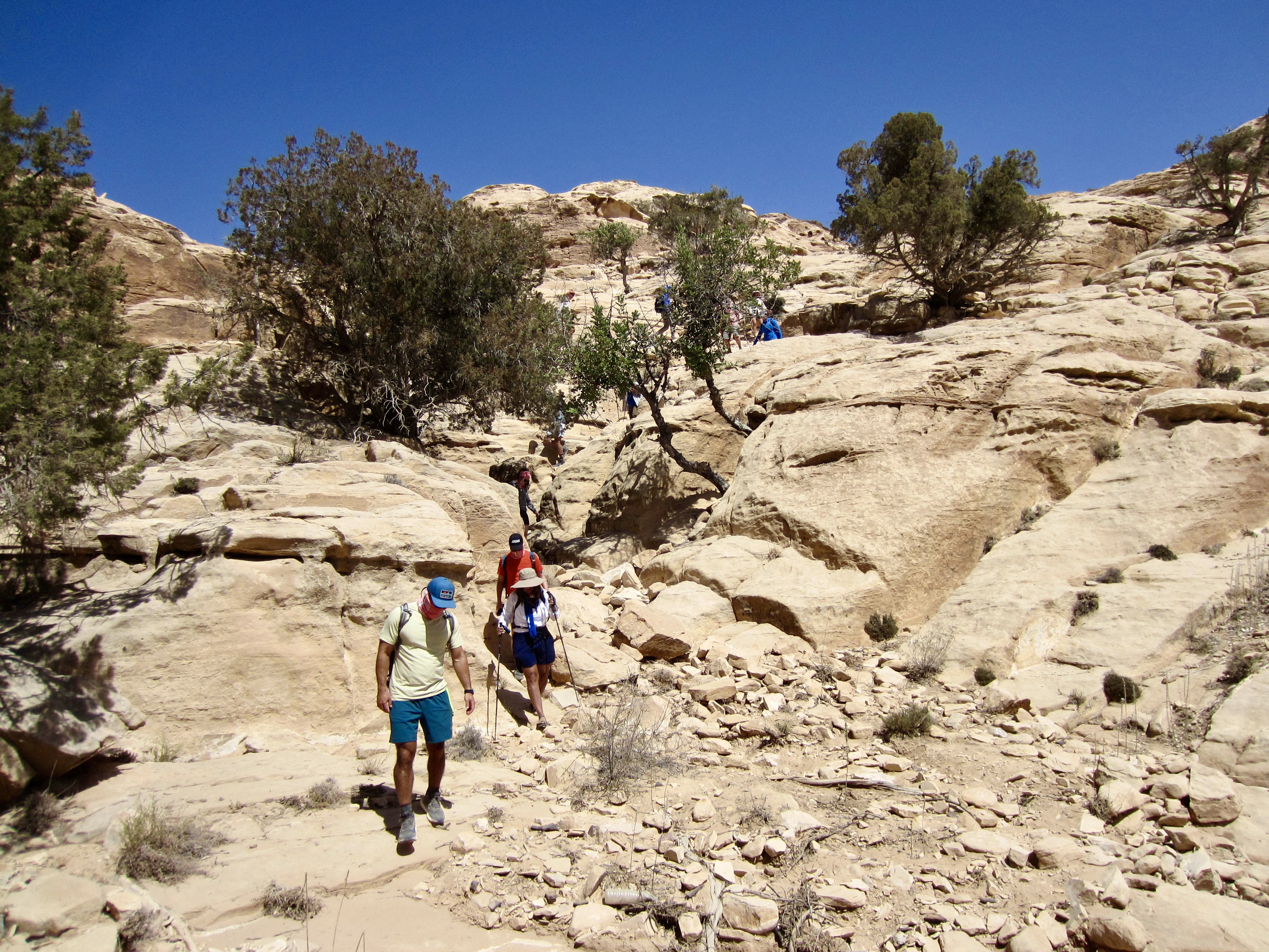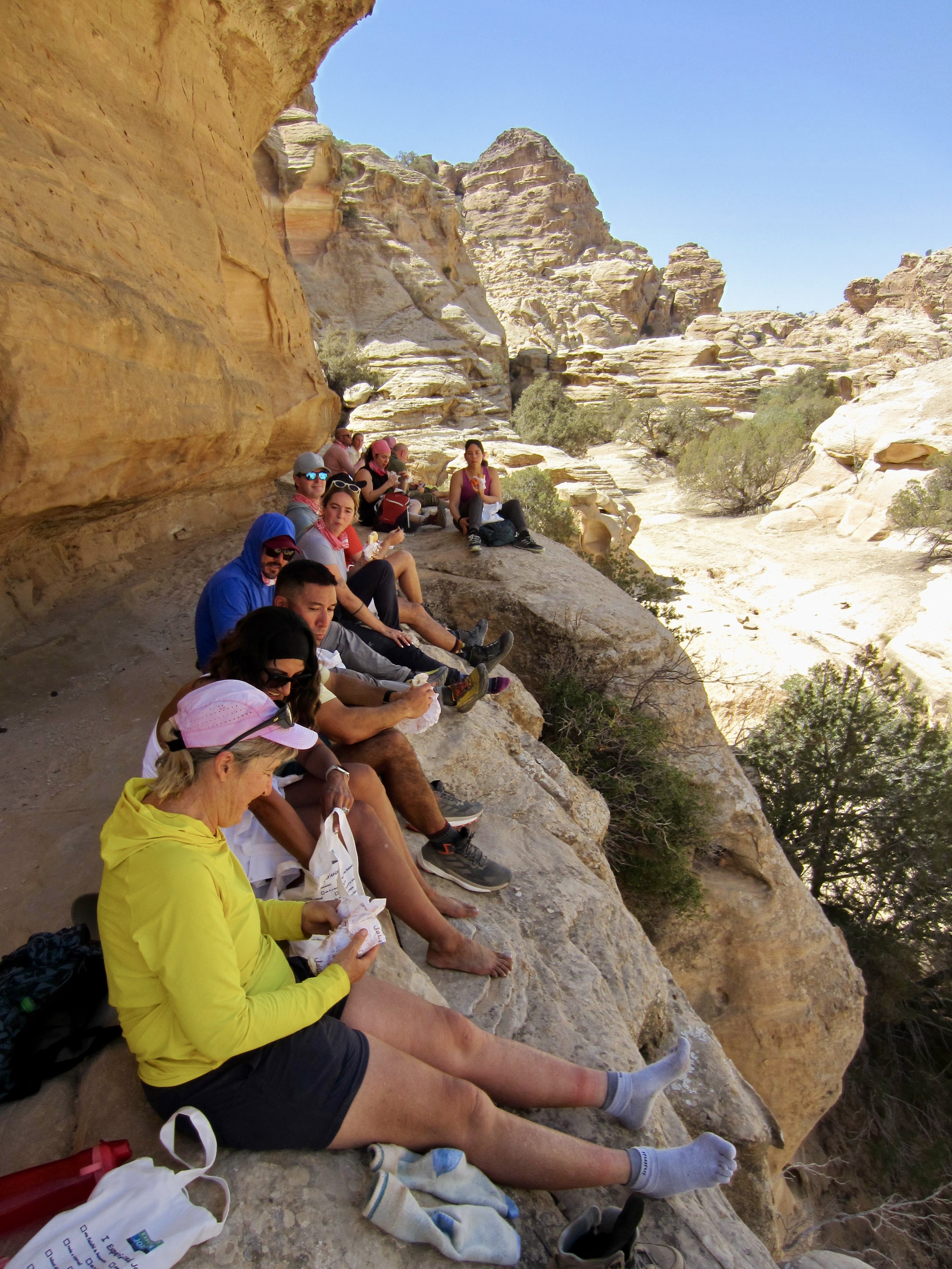 Upon reaching the top of a sandstone canyon, our two donkeys and their handlers parted ways. The canyon is too steep even for sure-footed donkeys, so we now had to pack our own water. This canyon descent required a combination of hiking and Class 2 (easy) scrambling. Today’s lunch took place on a shady ledge above the canyon invert.