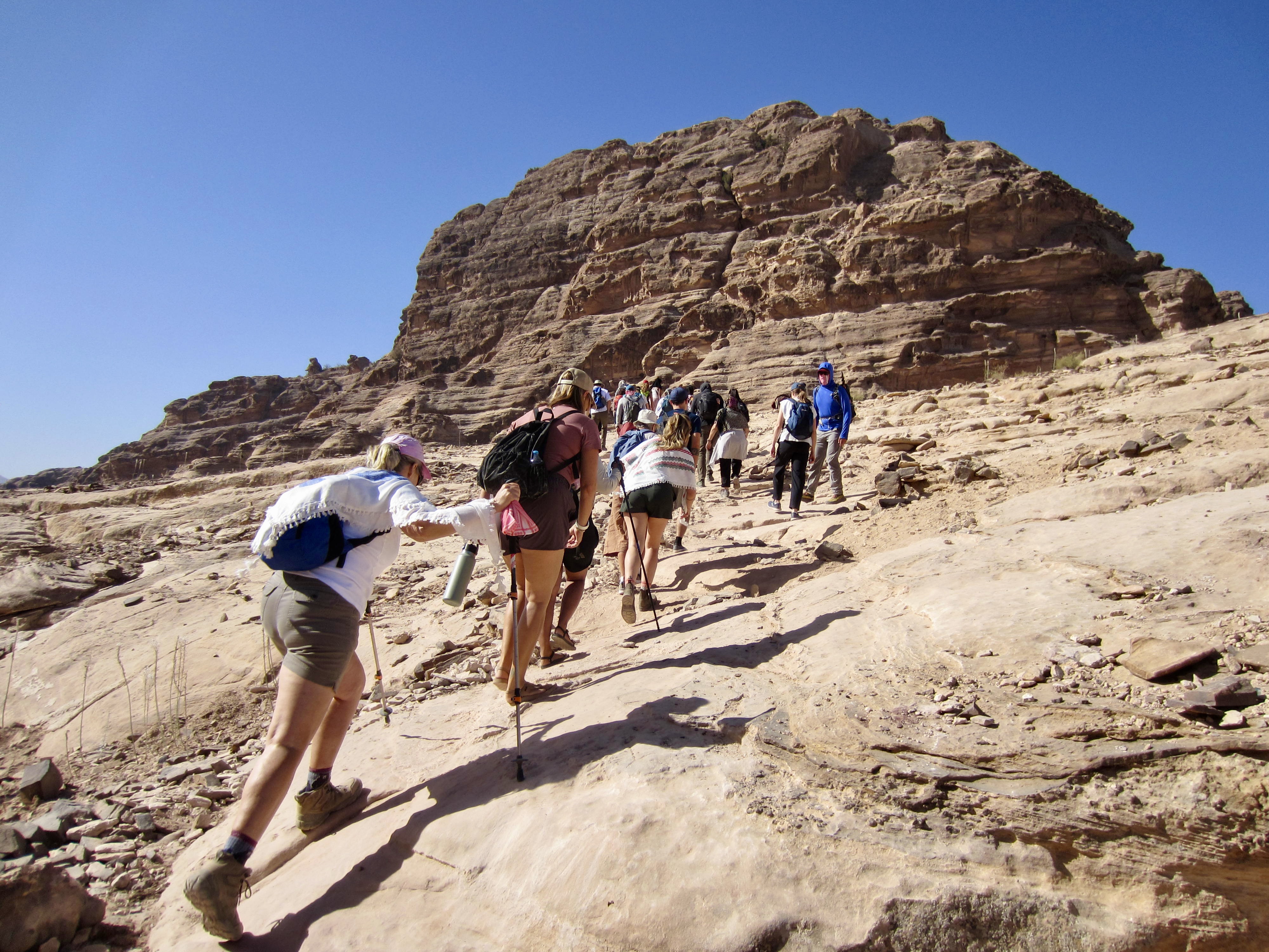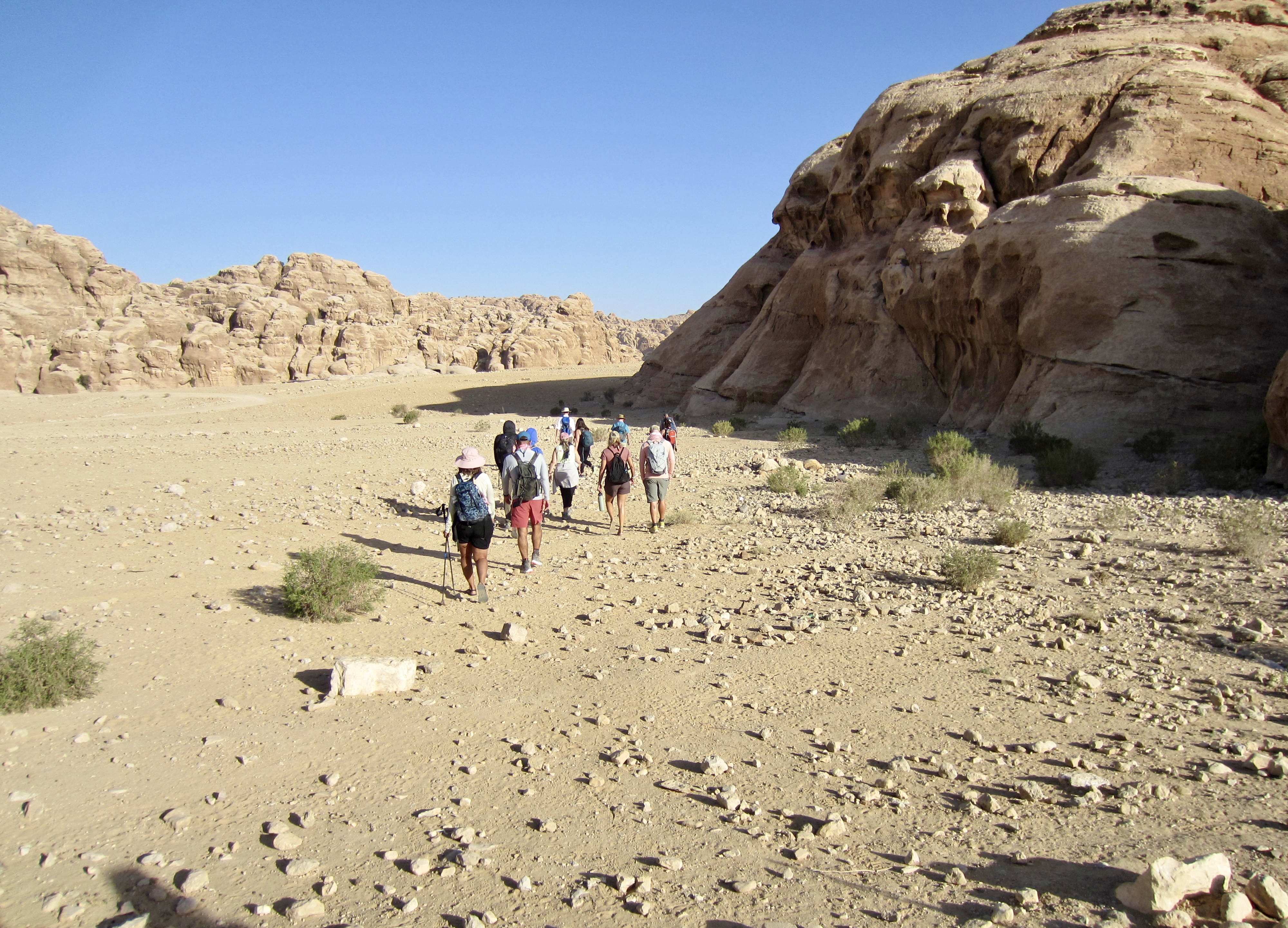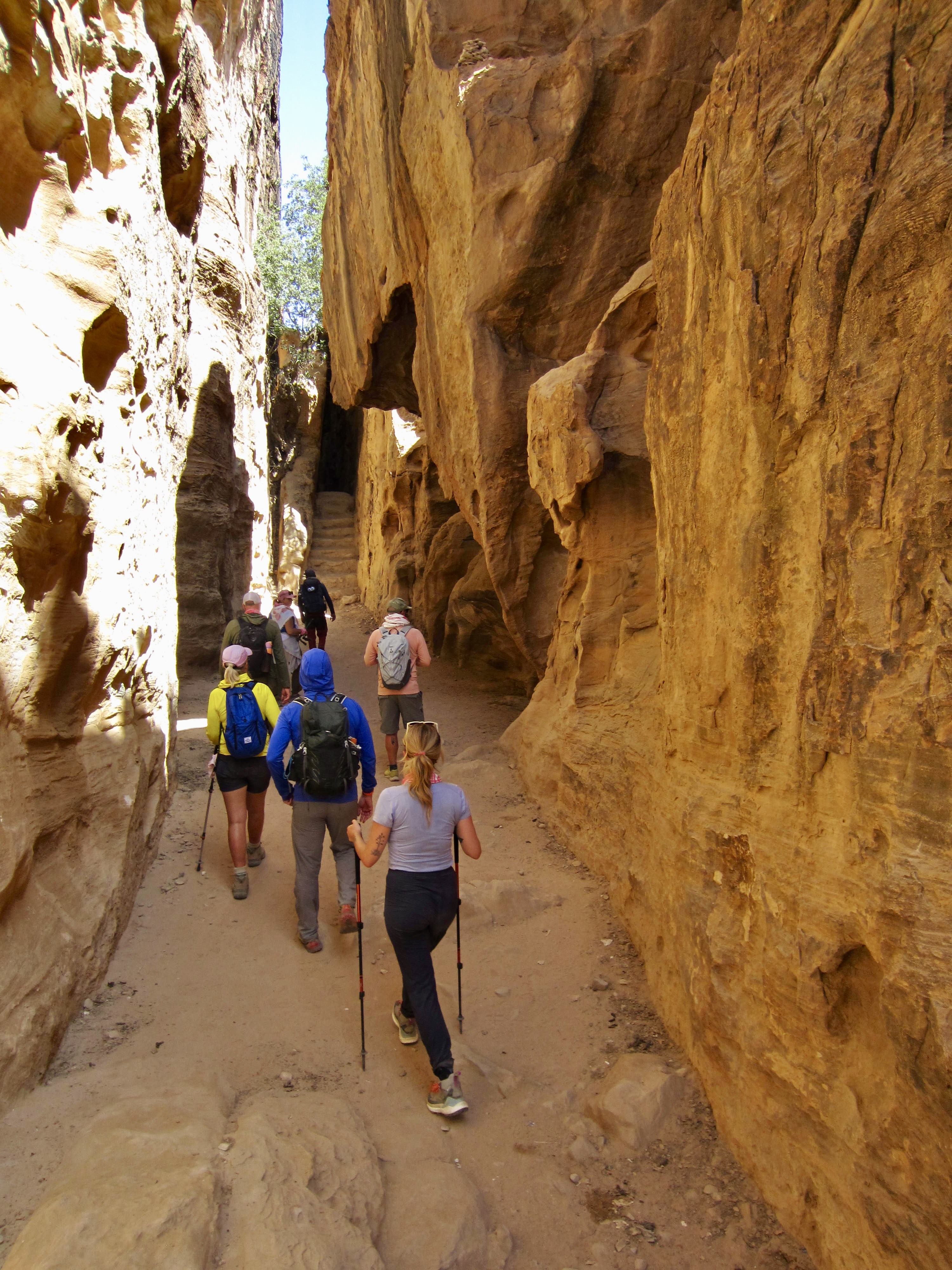 When Brooke and James advertised their three-day guided traverse along a short segment of the Jordan Trail, Eileen and I were surprisingly quick to sign up. I say “surprisingly“ because we knew little about the country other than that it was somewhere in the political and climatic hotbed of the Middle East. However, Brooke assured us that Jordan has remained a politically neutral and relatively safe place amidst the regional turmoil. In regard to the climate, she admitted that it would indeed be hot and arid—in great contrast to our typical alpine purlieu. Over the past decade, though, Eileen and I have gained an appreciation for desert hiking, thanks to annual trips to arid locations such as Arizona, Utah, Nevada, Mexico, and Tasmania So, we were all in!