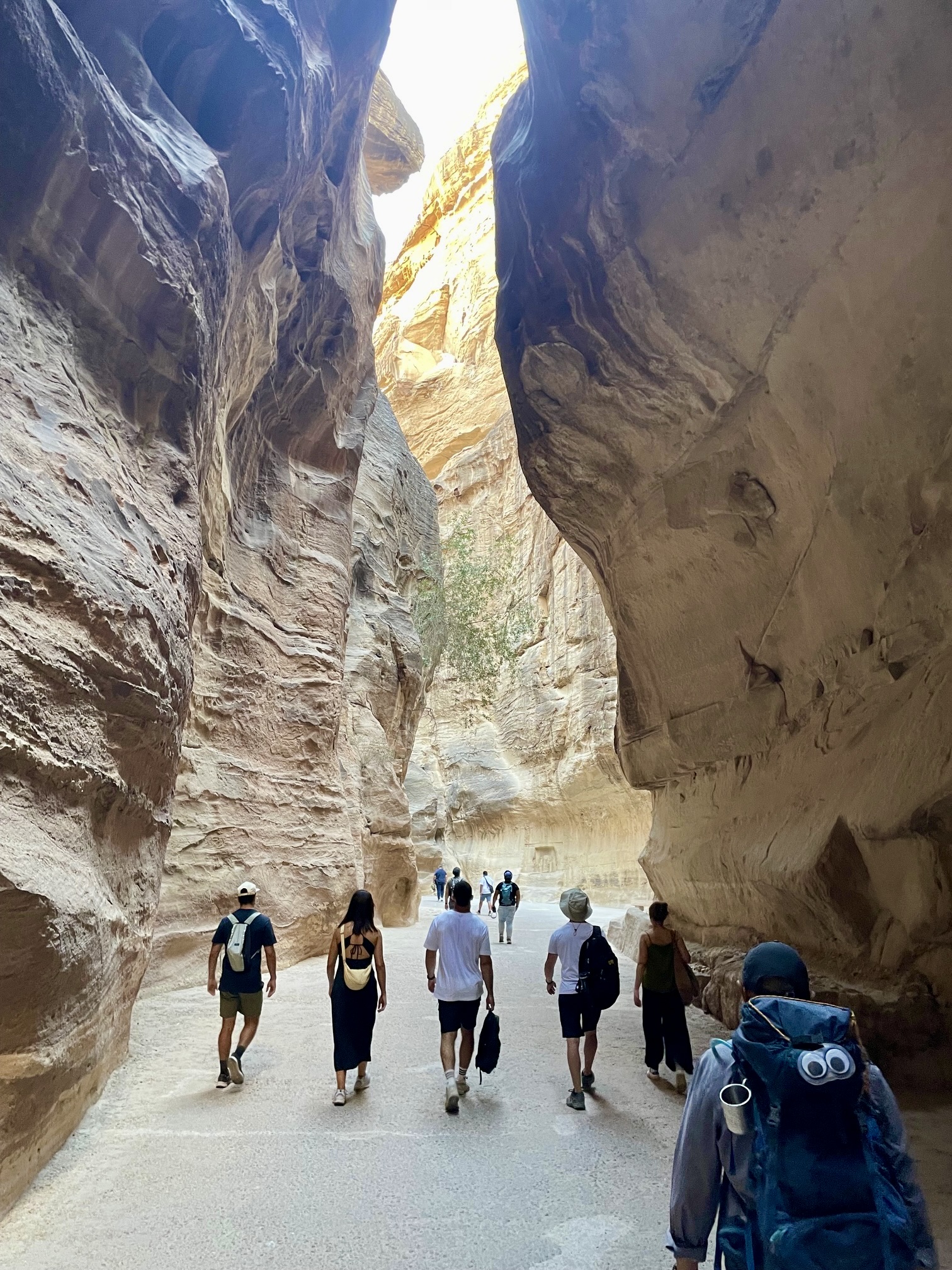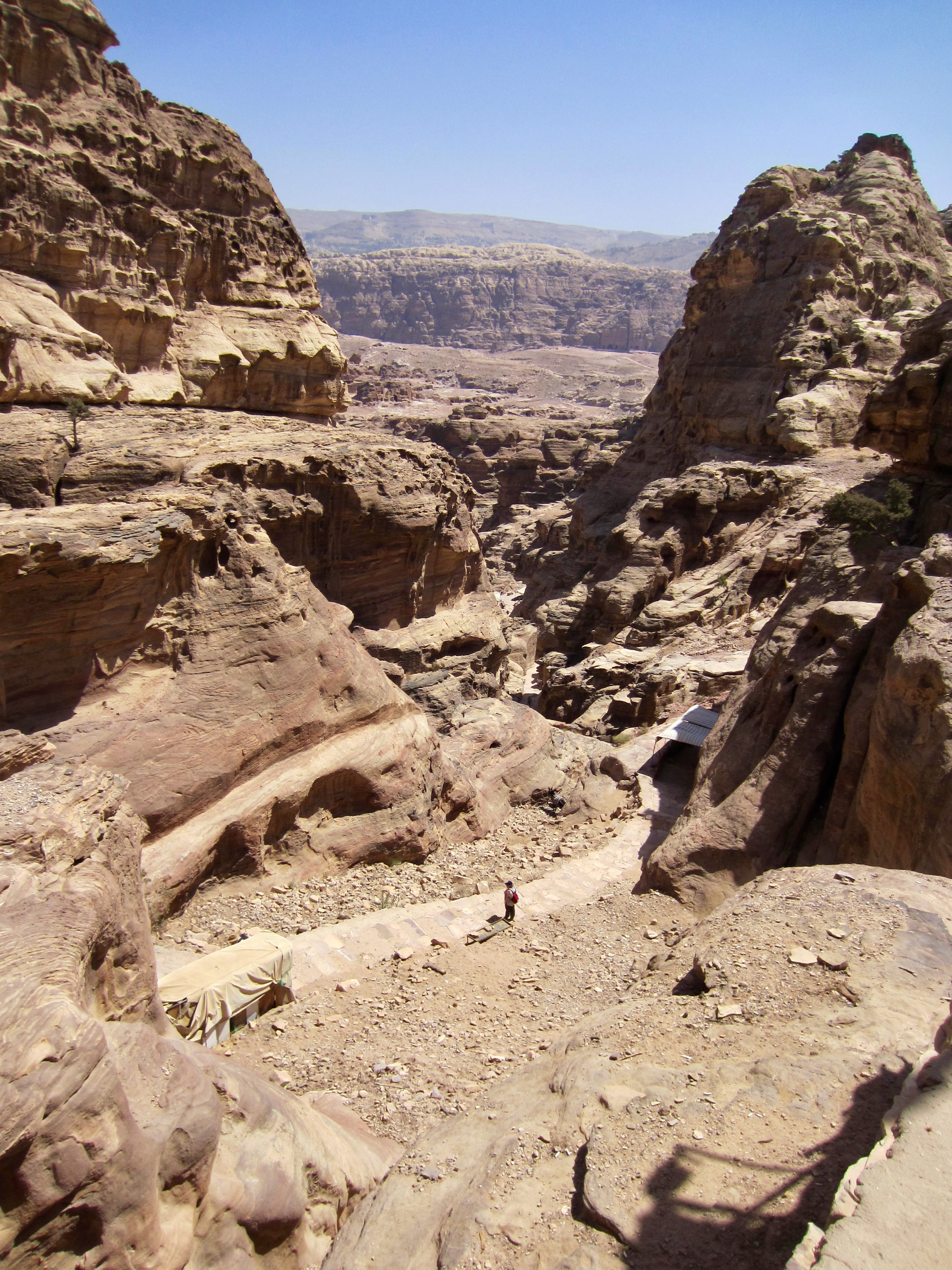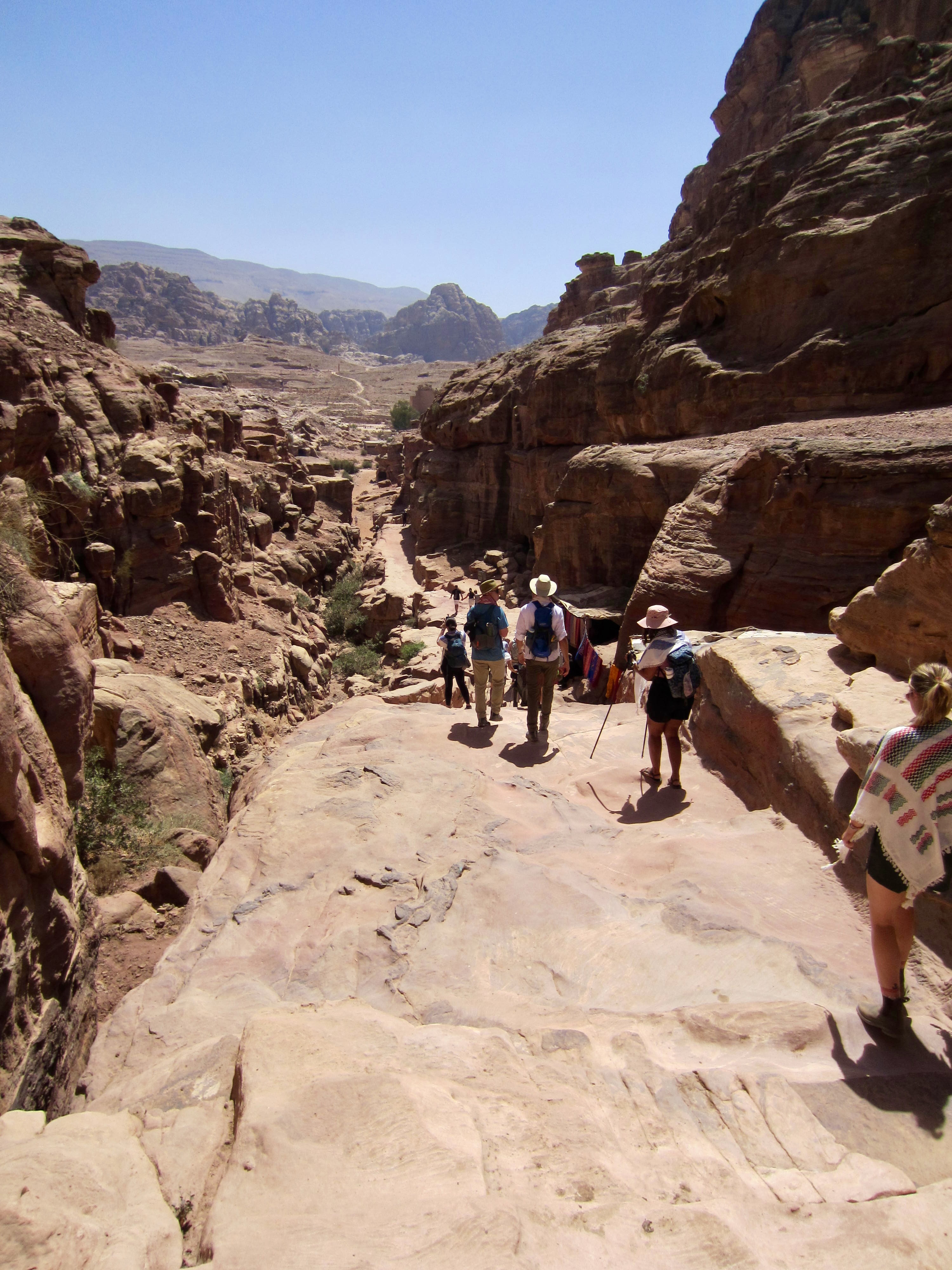 Upon reaching the bottom of the canyon, we ascended a stone stairway to gain a rocky gap filled with souvenir shops and eager merchants. This high gap in the canyon represents the “back door” to Little Petra. From there, we made a dramatic descent into a narrow slot canyon framed by vertical sandstone walls. The name Little Petra was coined by tourists because of its similarity to the main entrance of Petra—albeit on a much smaller scale.