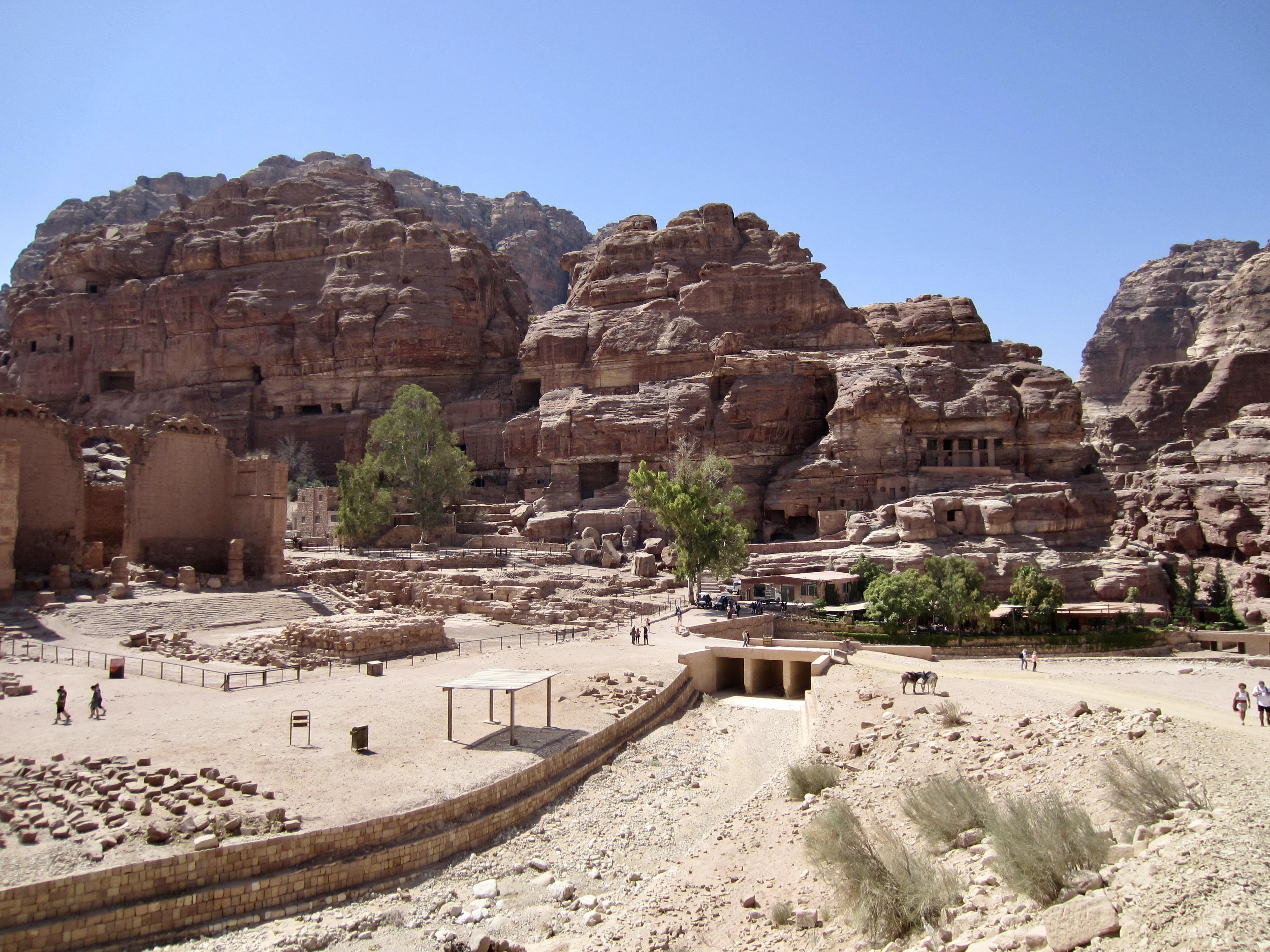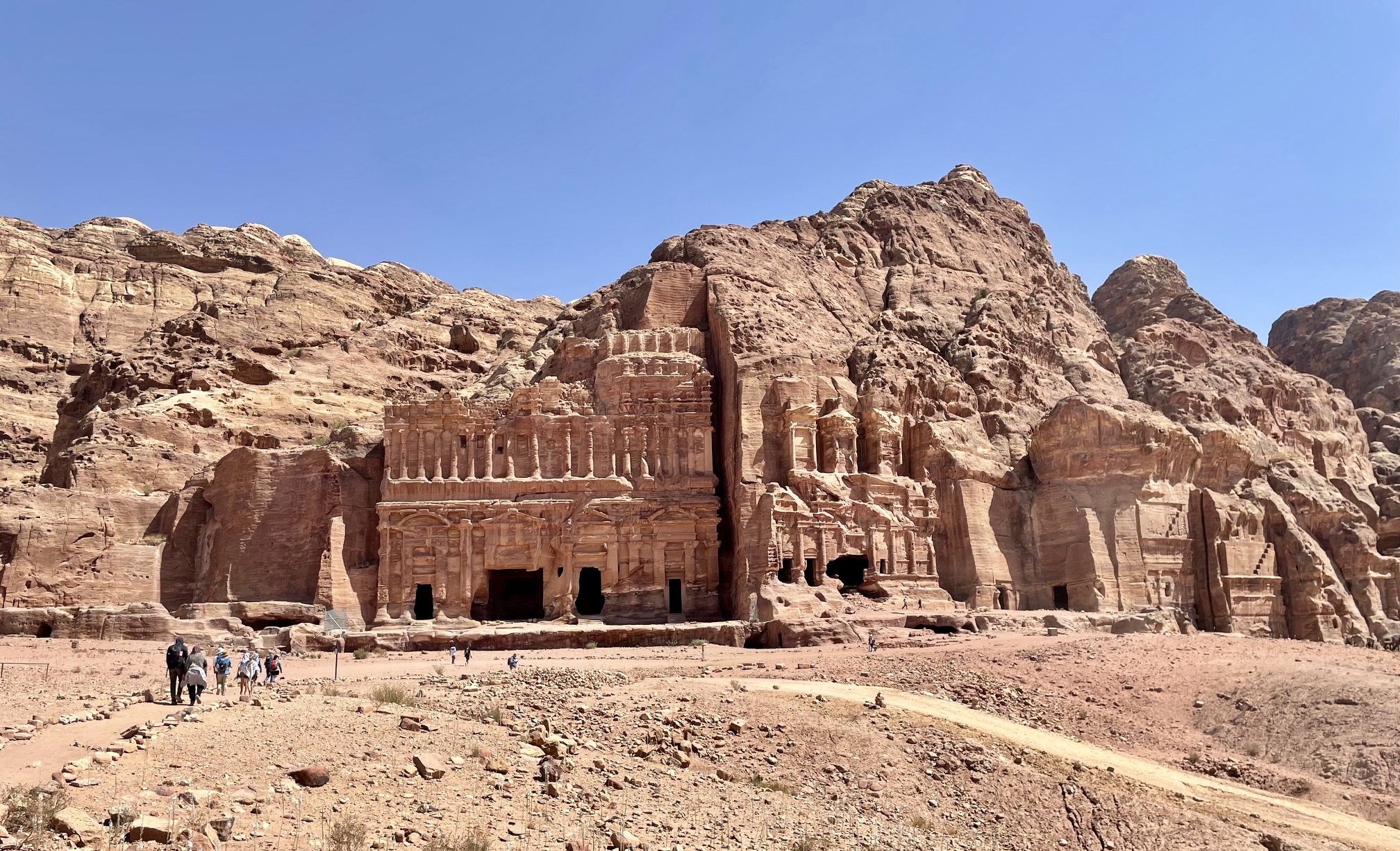 From The Monastery, a very long stairway took us down the narrow canyon until it opened onto a broad expanse bustling with tourists. This is Petra’s central village today, just as it was 2000 years ago. Standing proudly amidst the fray is a huge Nabatean monument known as The Great Temple.