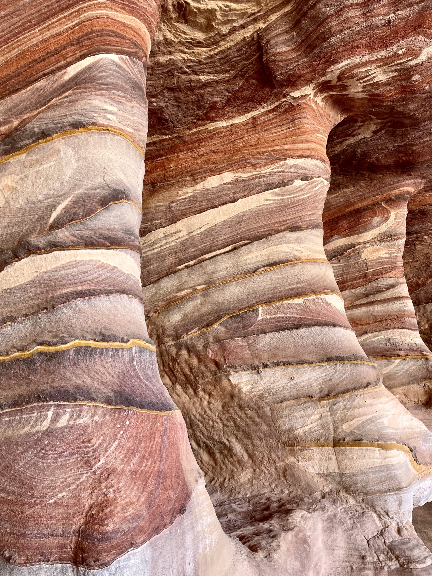 Mahmoud led us uphill to a covered ruin known simply as The Church, then over to a row of great facades that represent The Royal Tombs. We wandered around and into these tombs, marveling at both the workmanship and the natural sandstone textures.