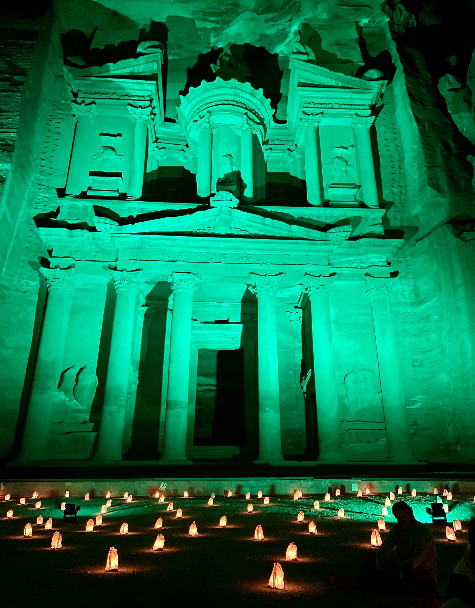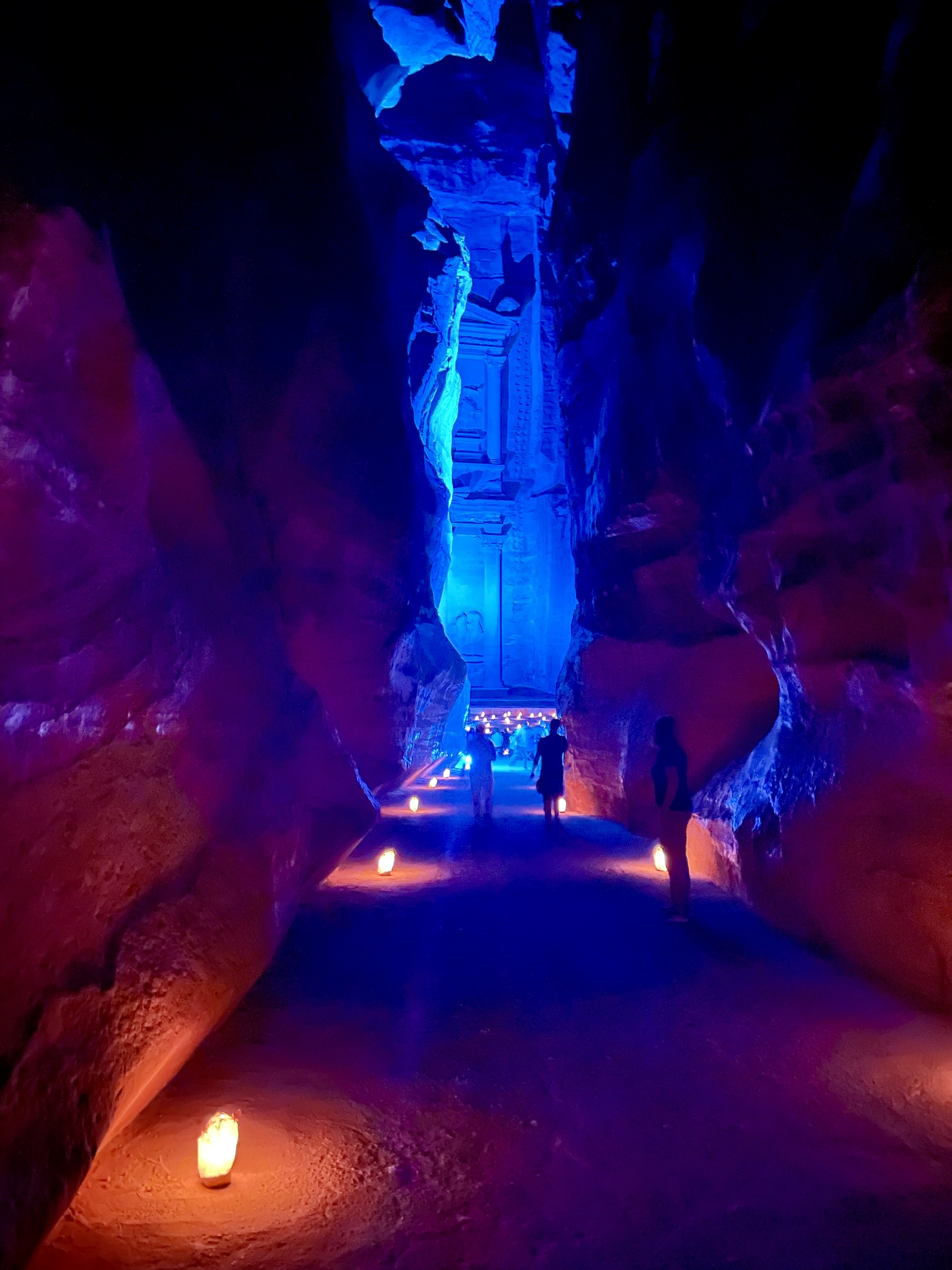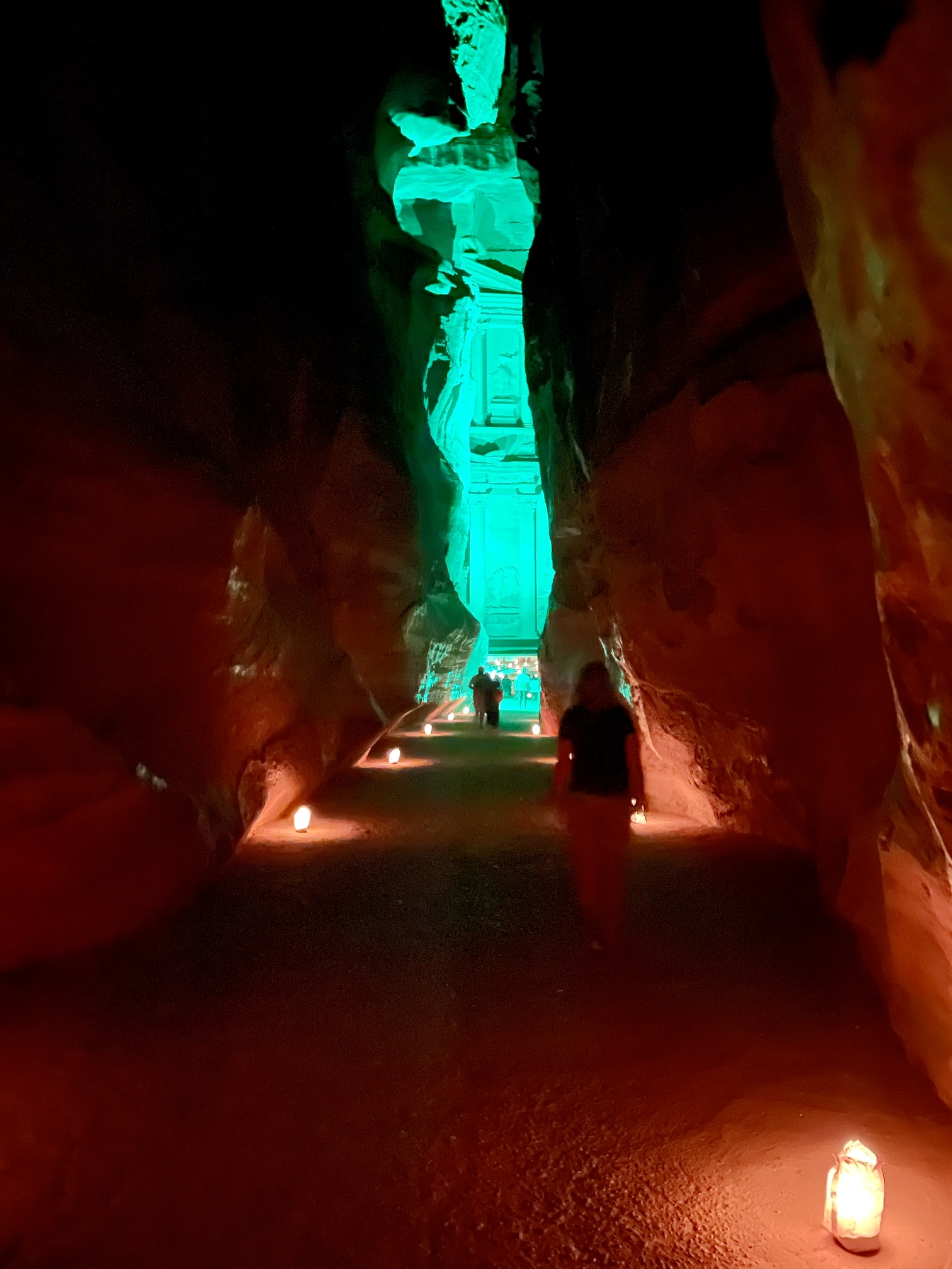 The Siq abruptly opened onto a gravel road that took us out to the entry gate and visitors center in the town of Wadi Musa (9.0 hours from Camp 2). Many of our group returned to The Siq after dark to witness an excellent video presentation projected upon the exterior of The Treasury.