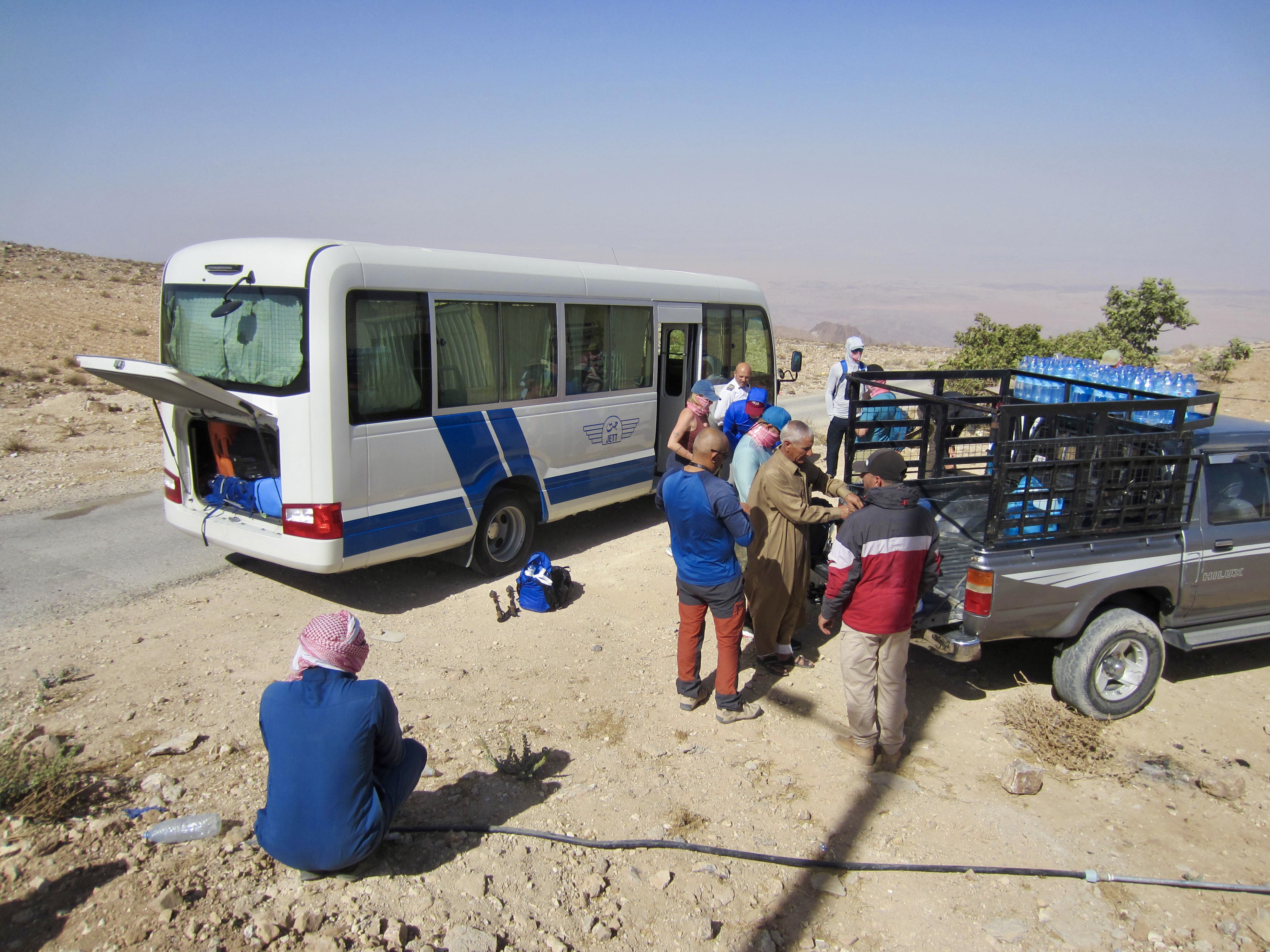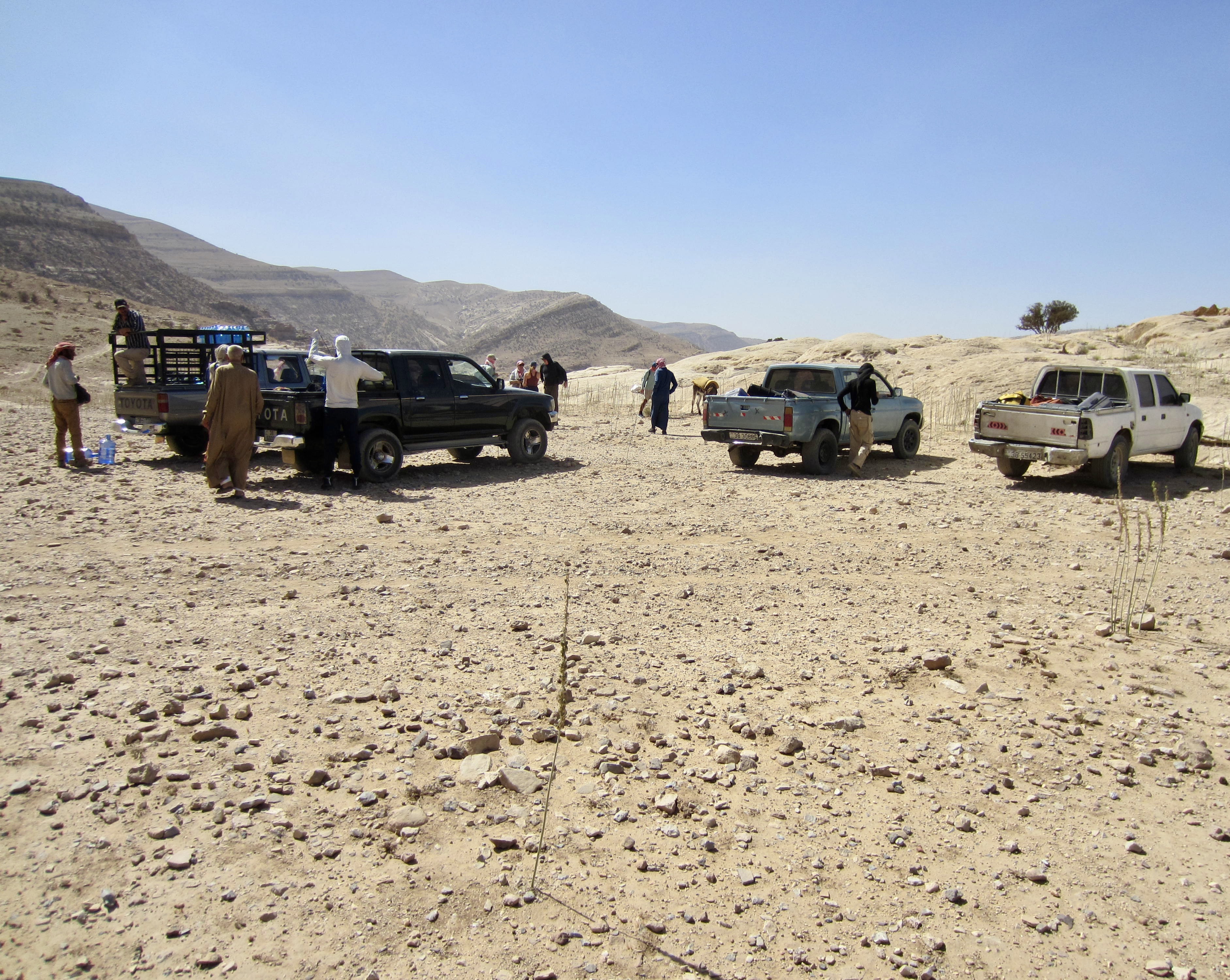 Our group of three guides and twelve clients boarded a small tour bus in Amman and rode to Jhair, a village situated on the western brink of the Jordanian Highlands. There, we transferred to 4X4 trucks and rumbled down a steep, rough, dirt road to a rocky arm overlooking the Wadi Feid (Feid Valley). It was now late morning and getting quite hot.