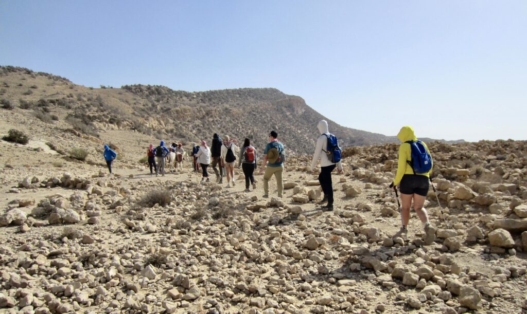 Once underway in the cool morning air, we hiked down a road past several Bedouin camps, then veered onto a rough trail that took us over a broad saddle and down through a small community with farms and orchards.