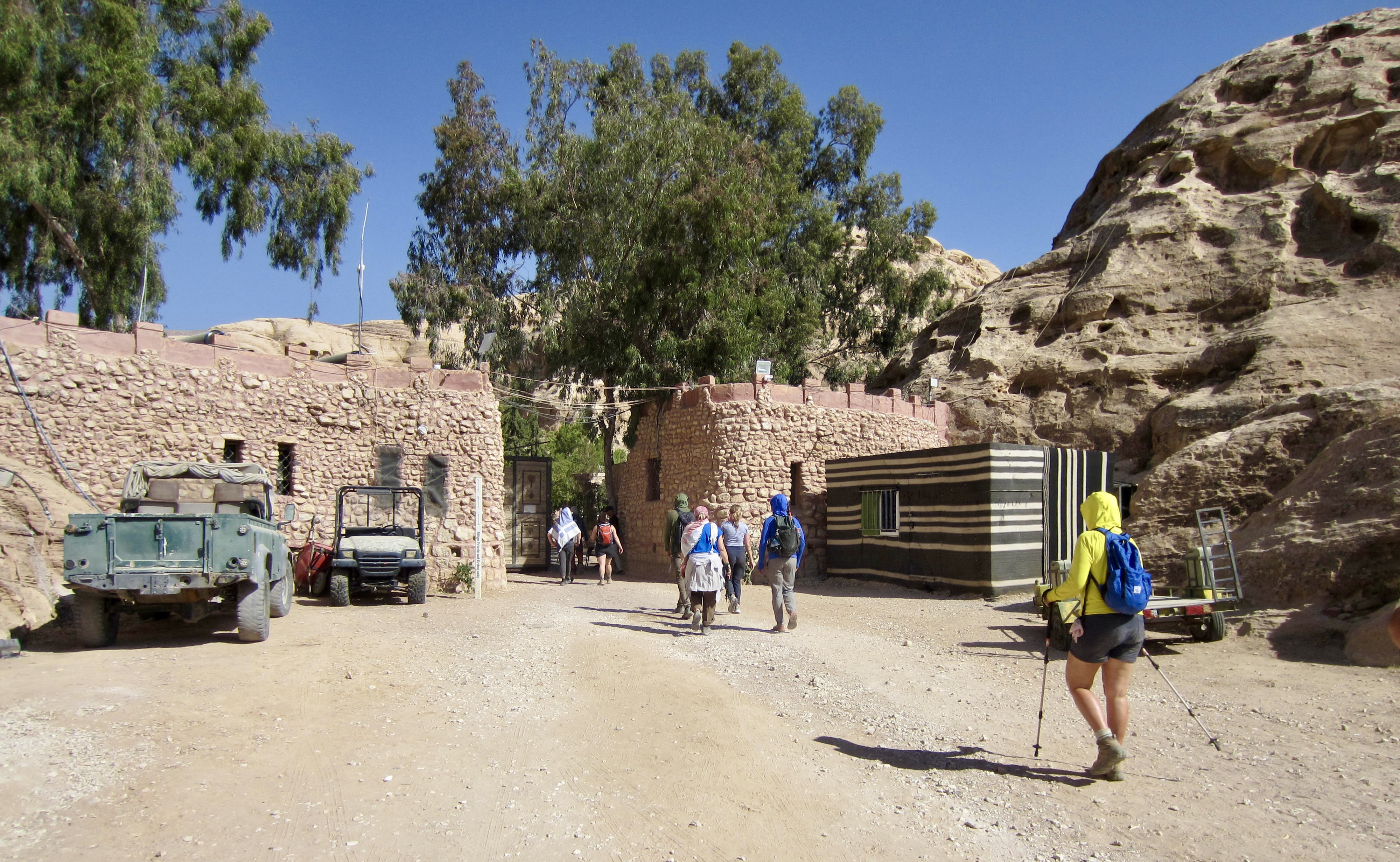 We began our morning with a march back over to the Little Petra entry gate. There, we squeezed onto a 4X4 transit truck that drove us down a rough road for about 1½ miles / 2½ kilometers to a trail junction. We were now back on the Jordan Trail, which led us over the flank of Jebel al-Deir, or Deir Hill, our day’s high point, and down into a large canyon.
