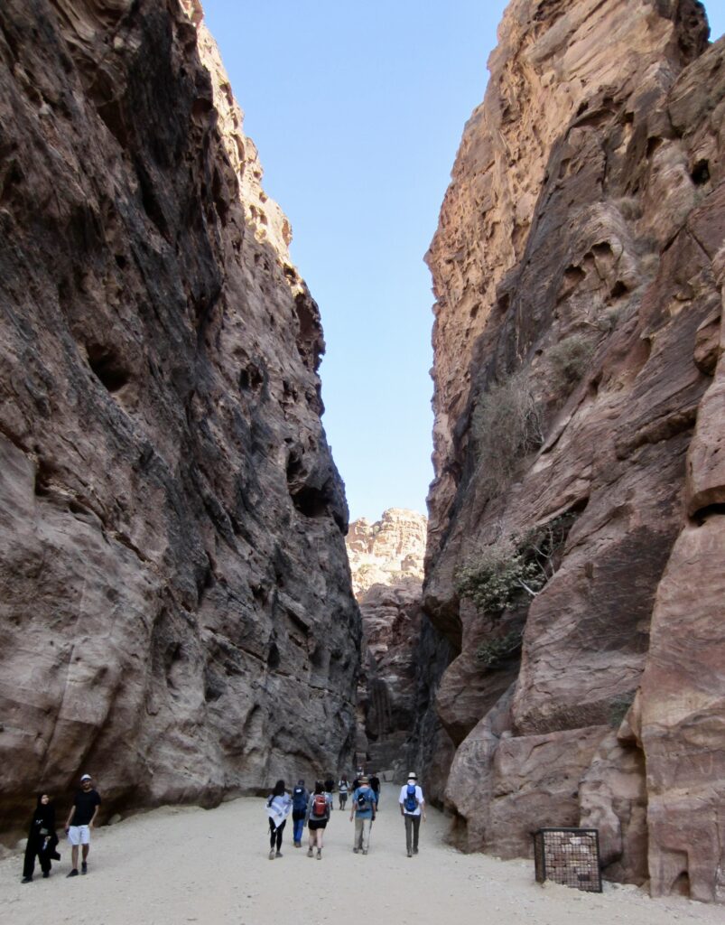 From The Treasury, we made a long walk through an amazing slot canyon known as The Siq. This narrow, twisting passageway, with vertical walls soaring more than 400 feet / 100 meters high, served as Petra’s original entrance and still remains its main entrance.