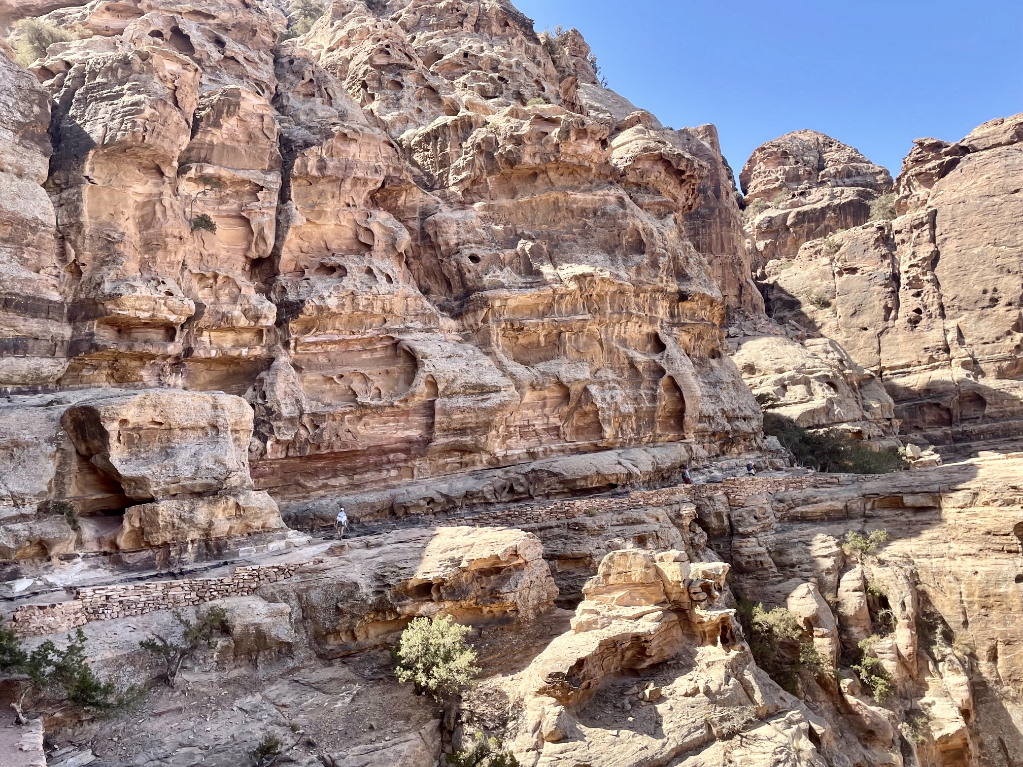 The trail went up and down numerous steps and across a massive tafoni cliff on exposed (but wide) rock ledges above the canyon invert. This was the geologic highlight of our traverse, and our collective anticipation was building!