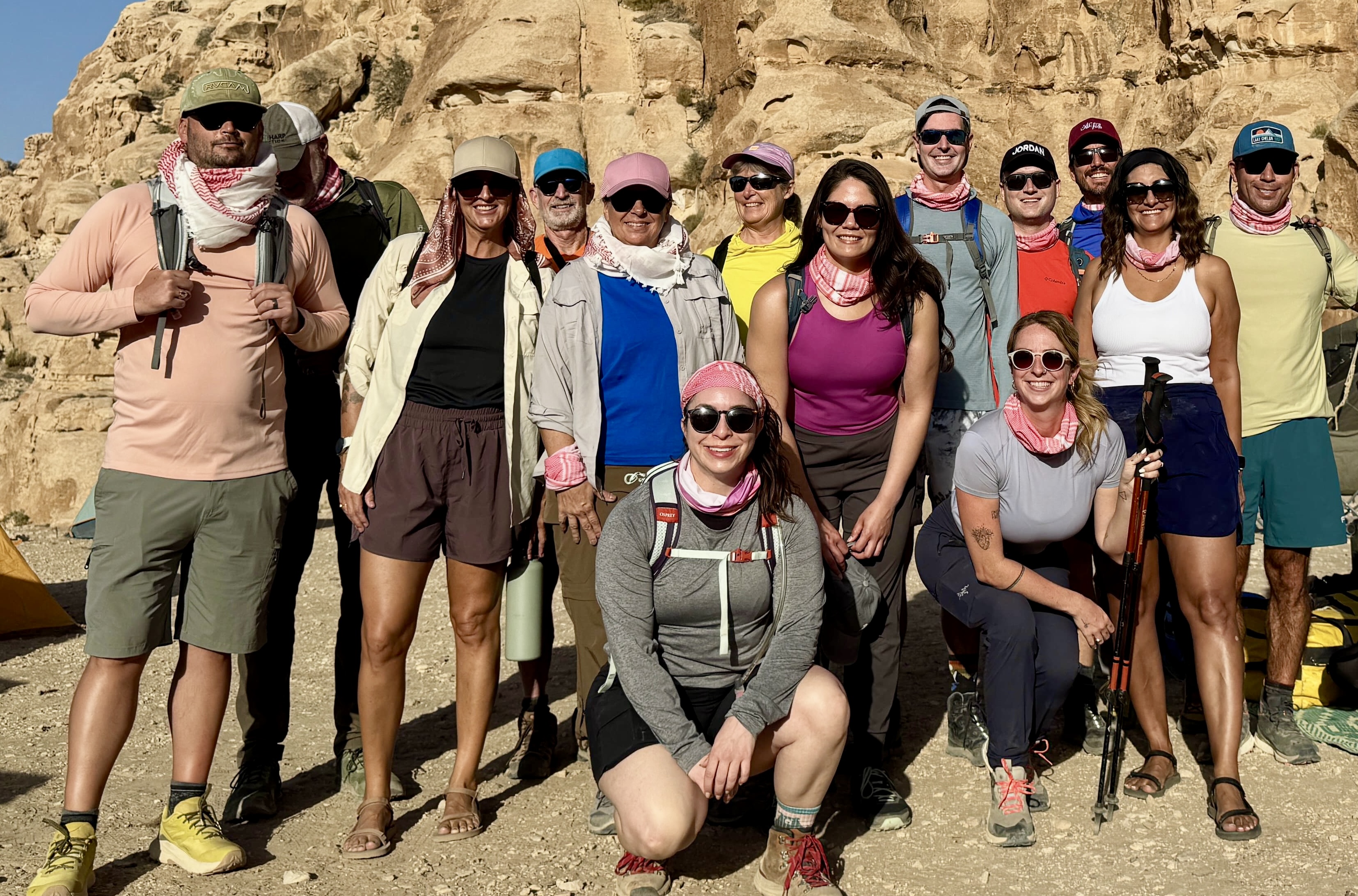Eileen and I arrived in Jordan’s bustling capital city of Amman several days before our starting date. There, we congregated to form a 15-person trekking group that included Brooke and James, our executive guides; Mahmoud, our regional guide; and ten other clients: Barbara, Brian, Courtney, Edwin, Elizabeth, Josh, Laura, Melissa, Stephen, and Storm. Some of these folks knew Brooke and James from previous treks, whereas others were new trekkers. Mahmoud is a full-blooded Bedouin—part of a tribe that has inhabited this region for many centuries—and is a wealth of Jordanian information.