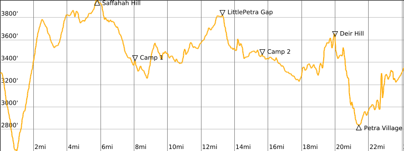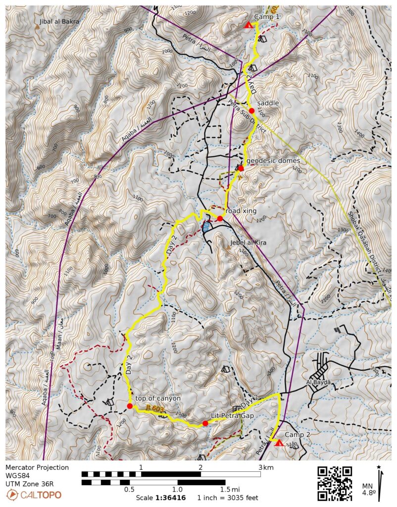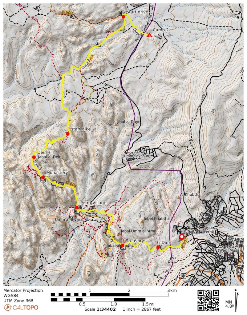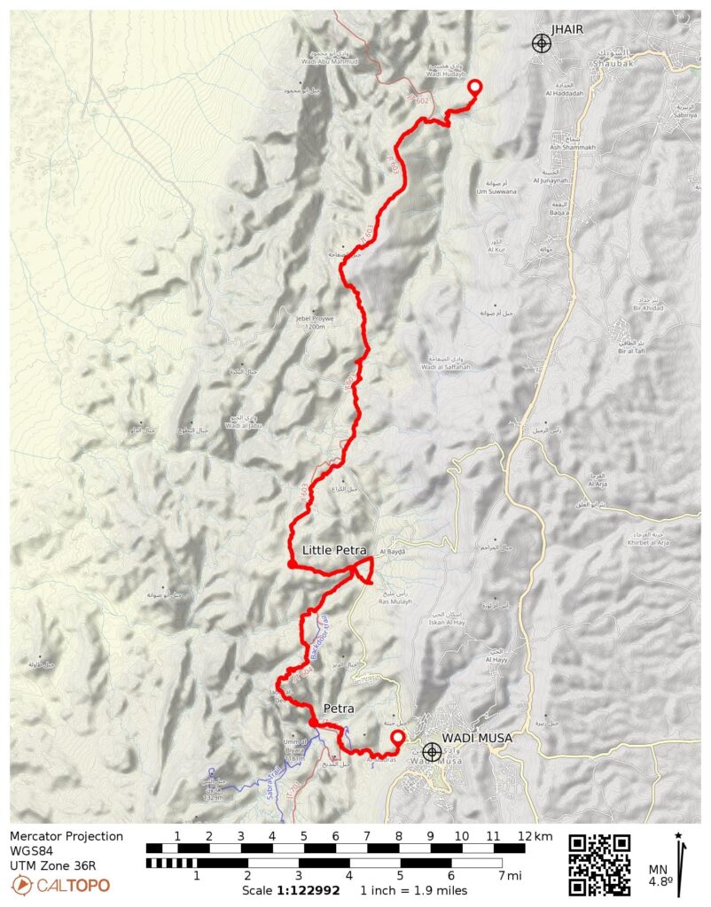 Way Points: Wadi Feid crossing & cuesta point & Saffahah Hill flank & Ghbour Whedat Wild Camp & broad saddle & geodesic dome colony & top of canyon & Little Petra gap & Little Petra entry gate & Little Petra Luxury Bedouin Camp & Little Petra entry gate (trail hike & trail scramble & road walk); Jordan Trail junction (truck ride); Deir Hill flank & The Monastery & Petra Village & The Church & The Royal Tombs & The Theatre & The Treasury & The Dam & The Djin Blocks & Petra entry gate (trail hike & trail scramble & road walk)